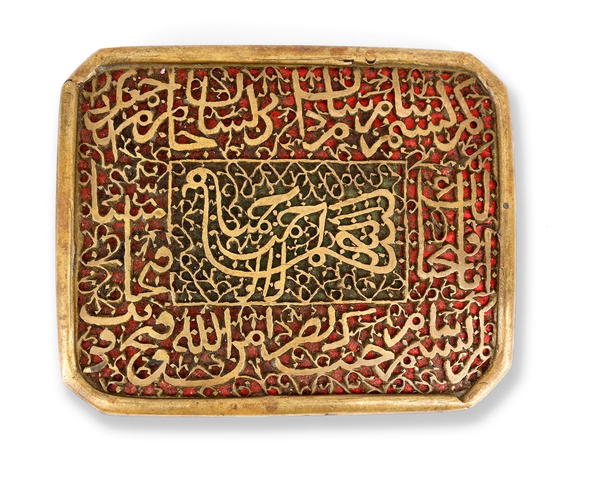 Of rectangular form, with script to centre of Basamallah forming a bird, surrounded by a Quran verse of surah al-Fath in openwork decoration on foliage.