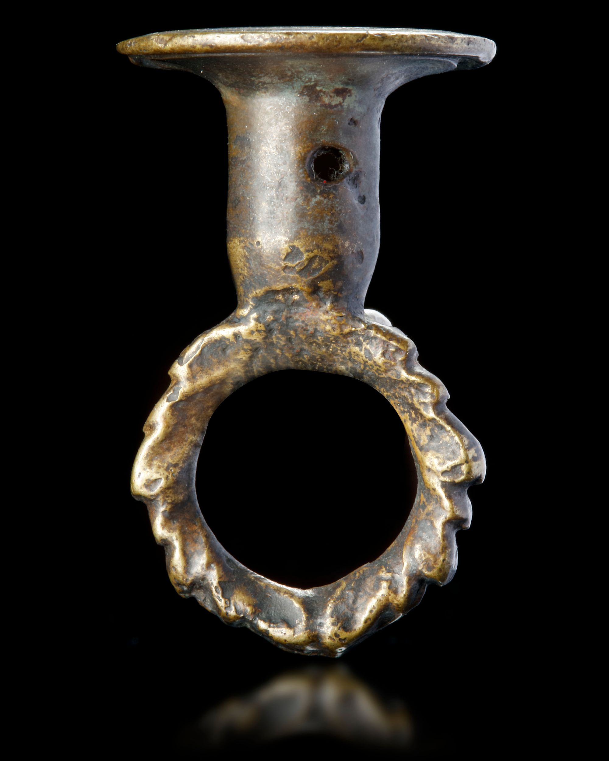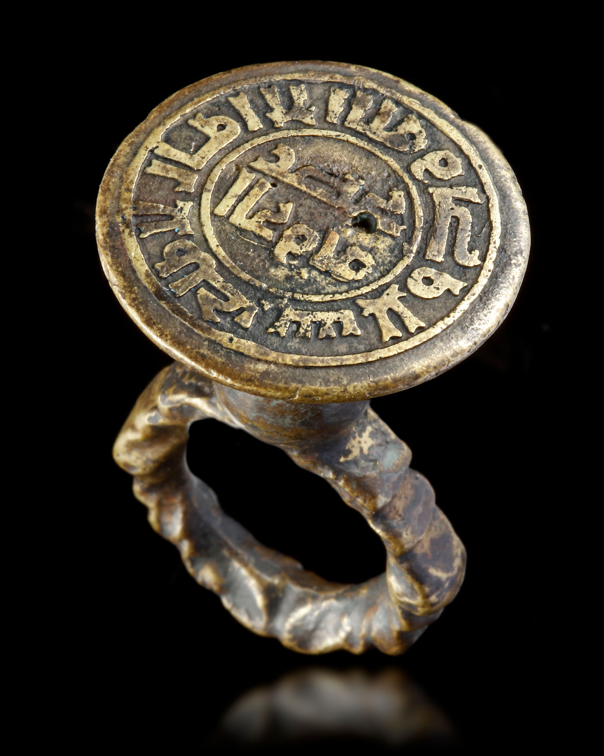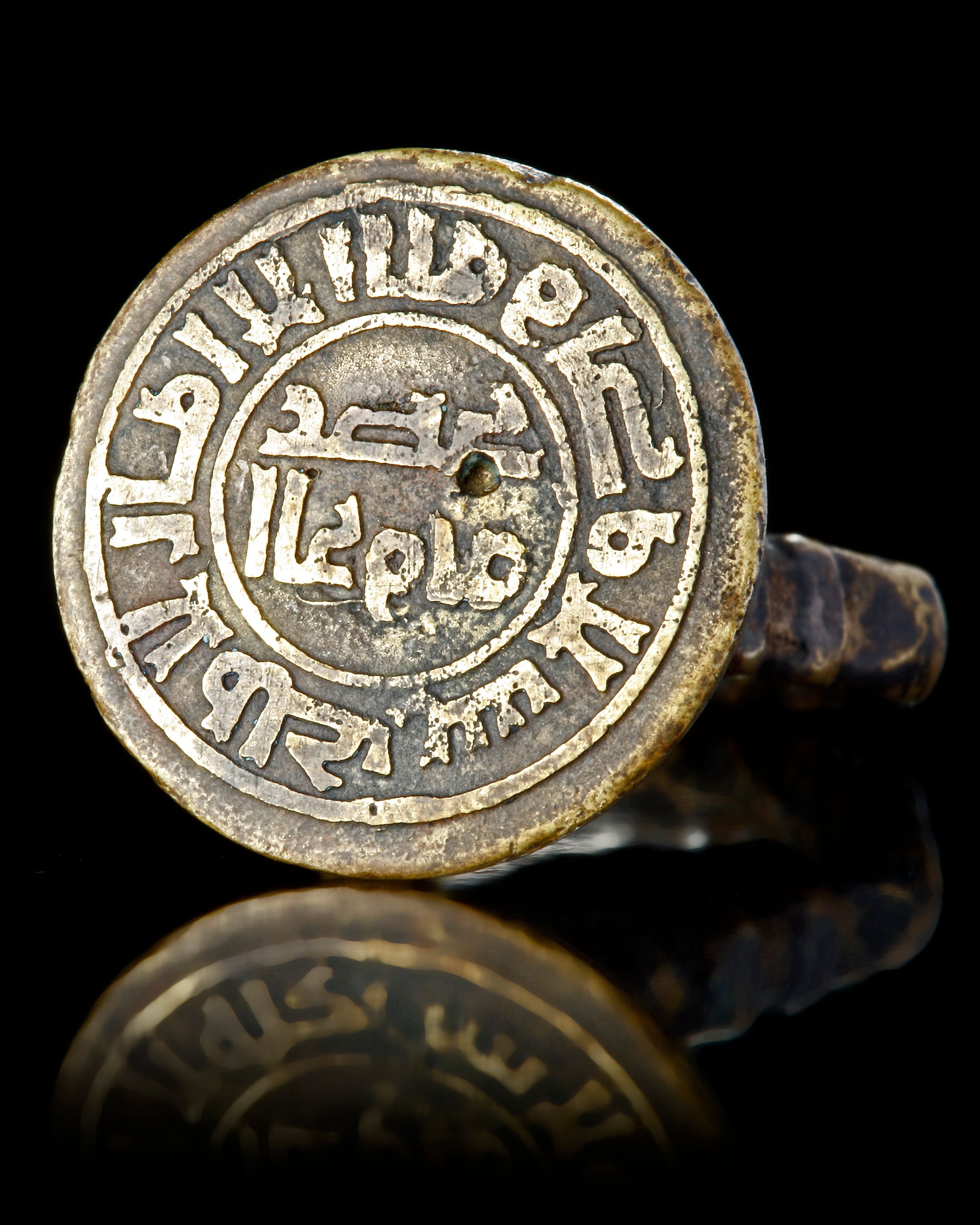 A bronze ring with oval seal shape, engraved with the text " لا إله إلا الله وحده لا شريك له - عضد الدولة, Adud al-Dawla surrounded by kalimaat al-Tawhid" in Kufic script. 7th AH-13th AD century Size: 2 Weight: 15.85 grams.