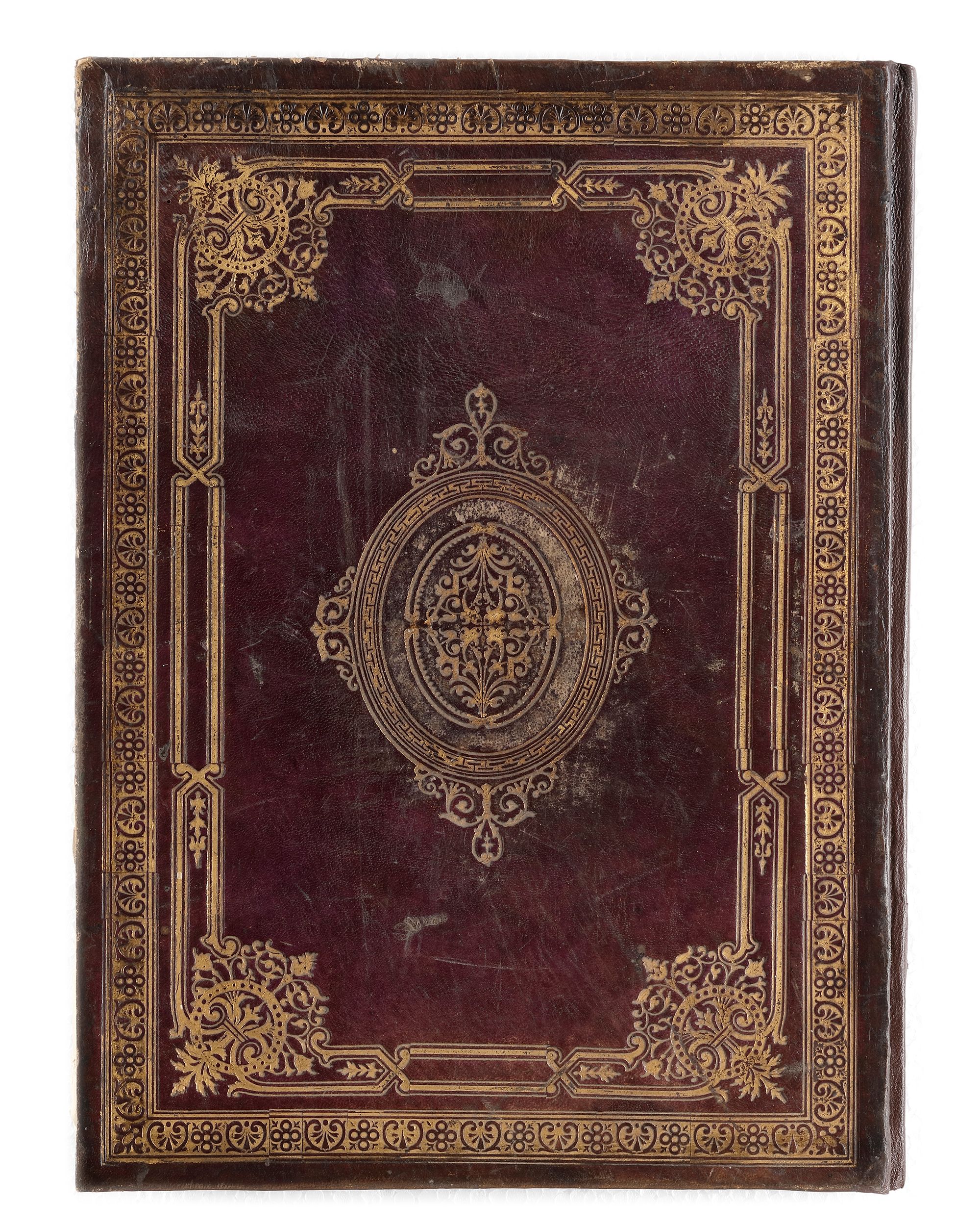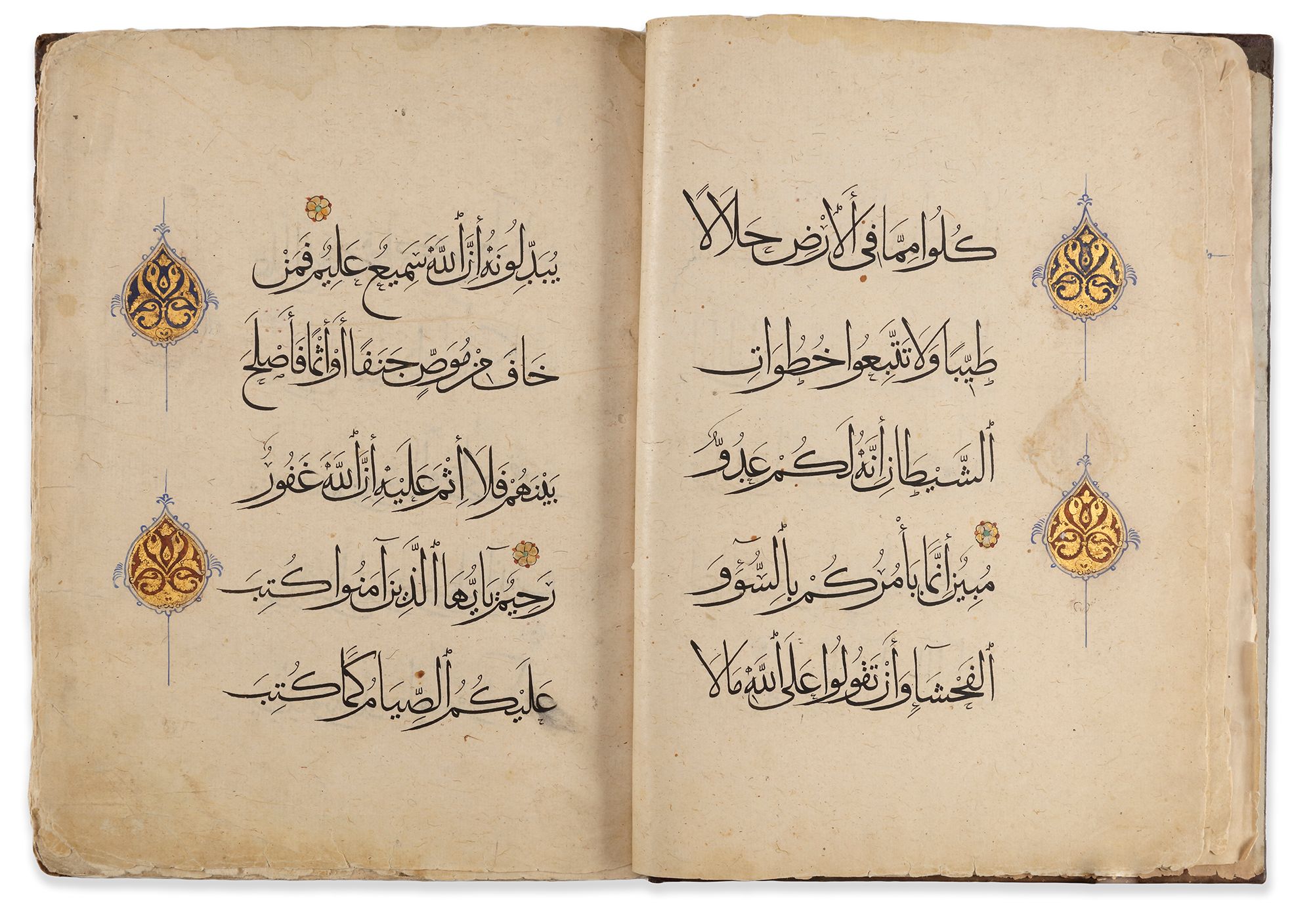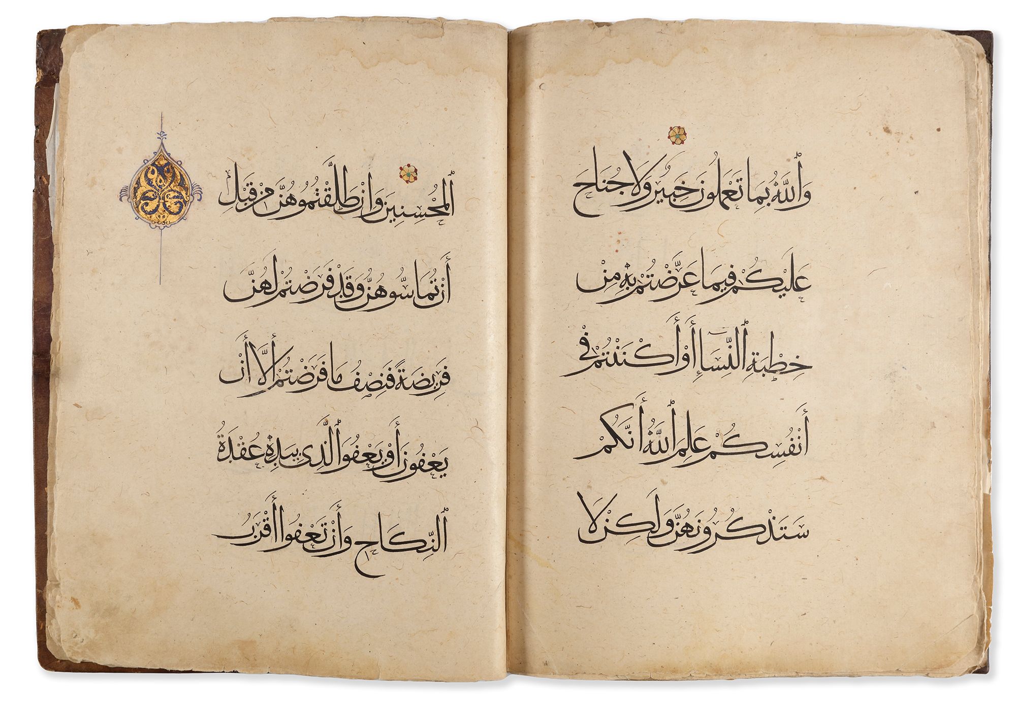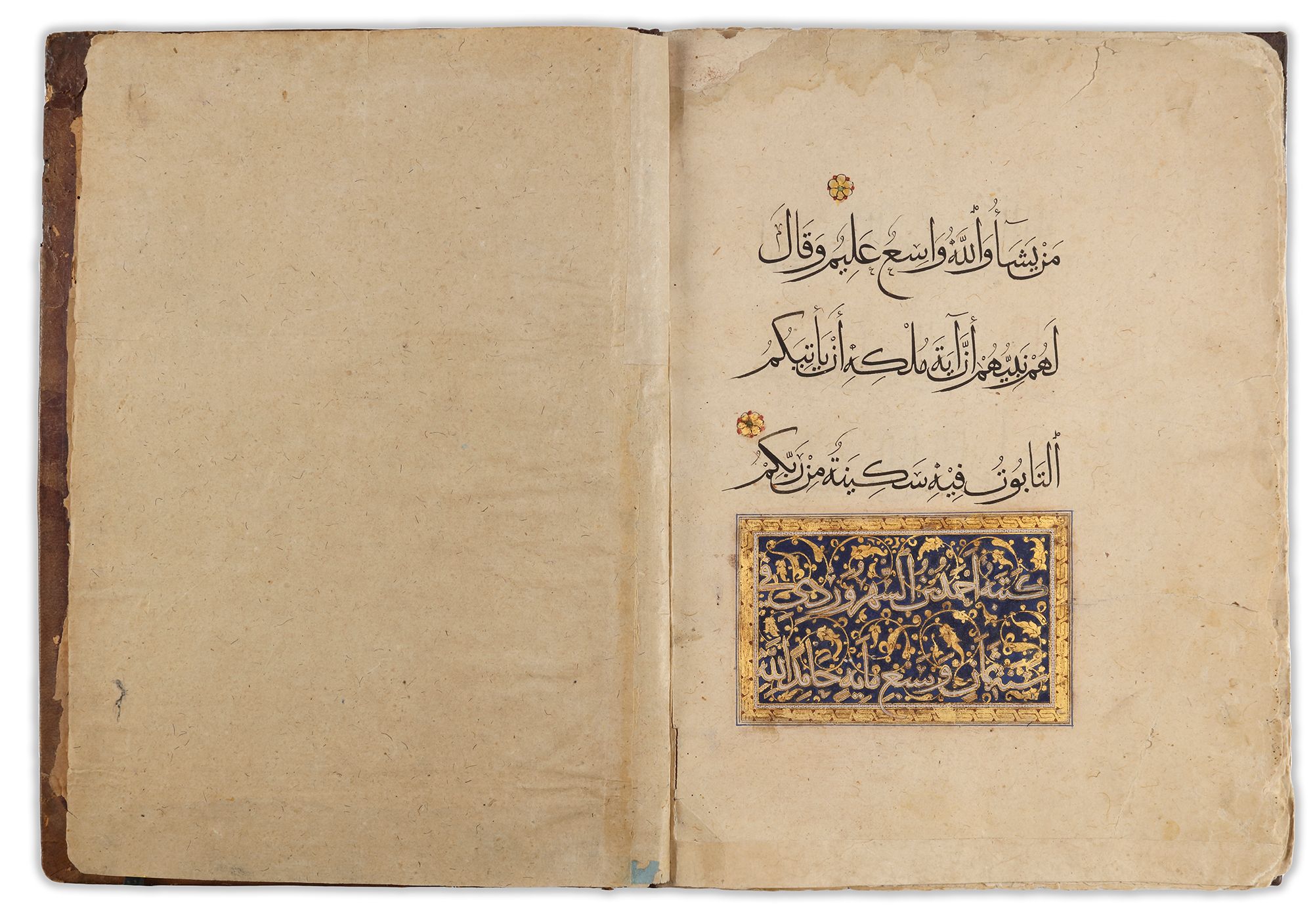Arabic manuscript on paper, 20 leaves, five lines to the page written in elegant thuluth script in black ink with diacritics and vowel points in black, verse-endings marked by gold roundels with green and red dots, illuminated marginal devices in colors and gold added later, surah heading written later in eastern Kufic script in gold on a blue ground with a gold rectangular panel and a palmette extending into the outer margins, colophon written in naskhi script in white on a blue ground within a gilt-edged rectangular panel at end, stating that this manuscript was copied by Ahmad bin al-Suhrawardi in the year 708 AH/1308-09 AD, folio 1 recto with a full-page illumination in colors and gold added later, binding late 16th century, not belonging.