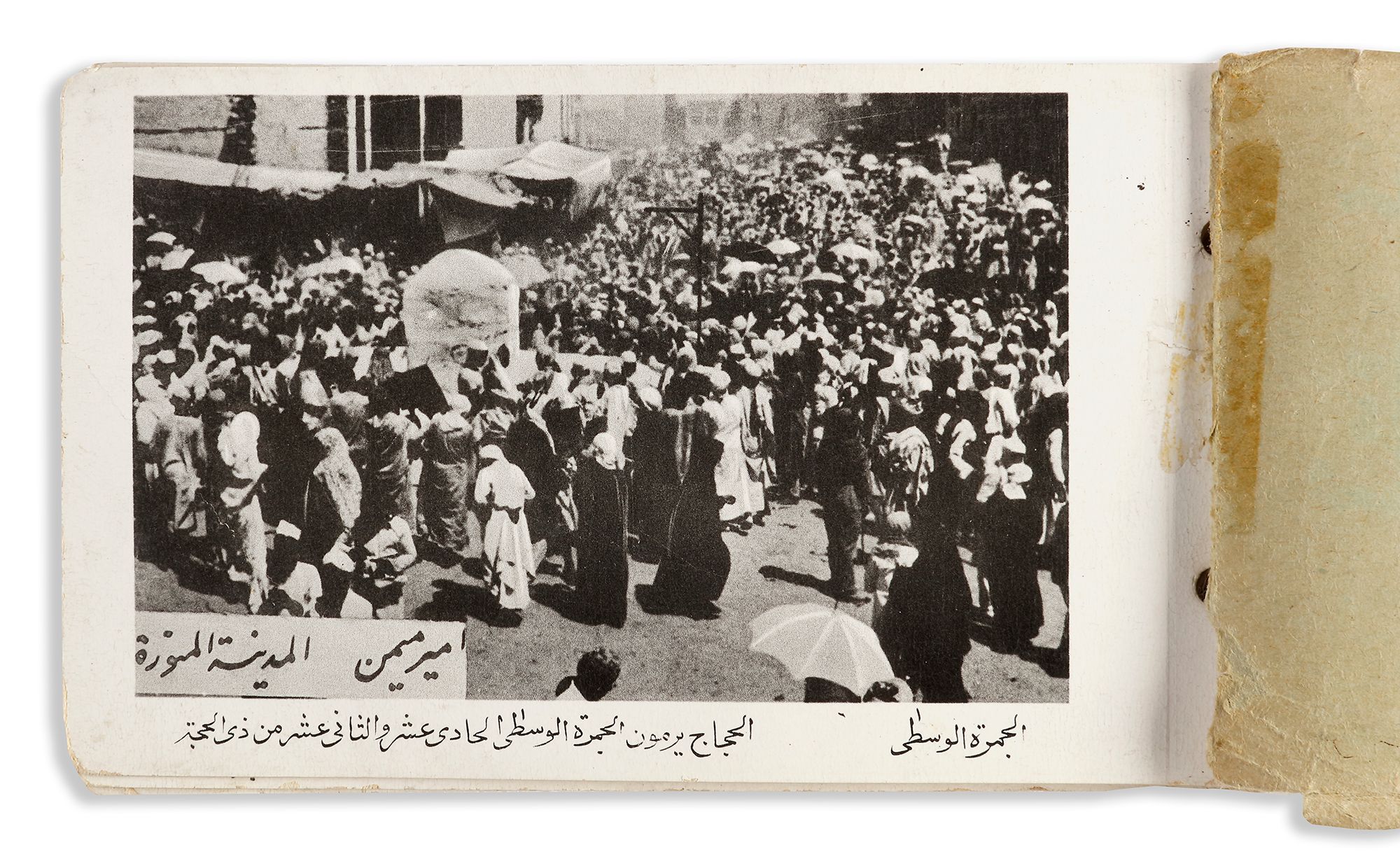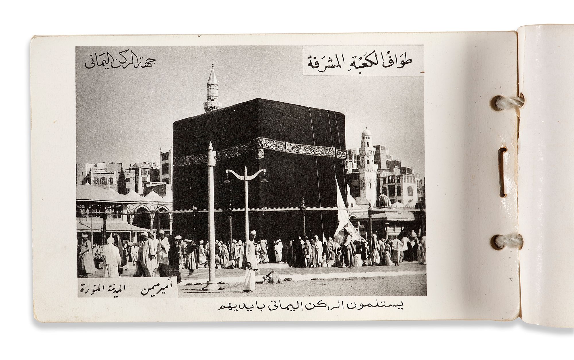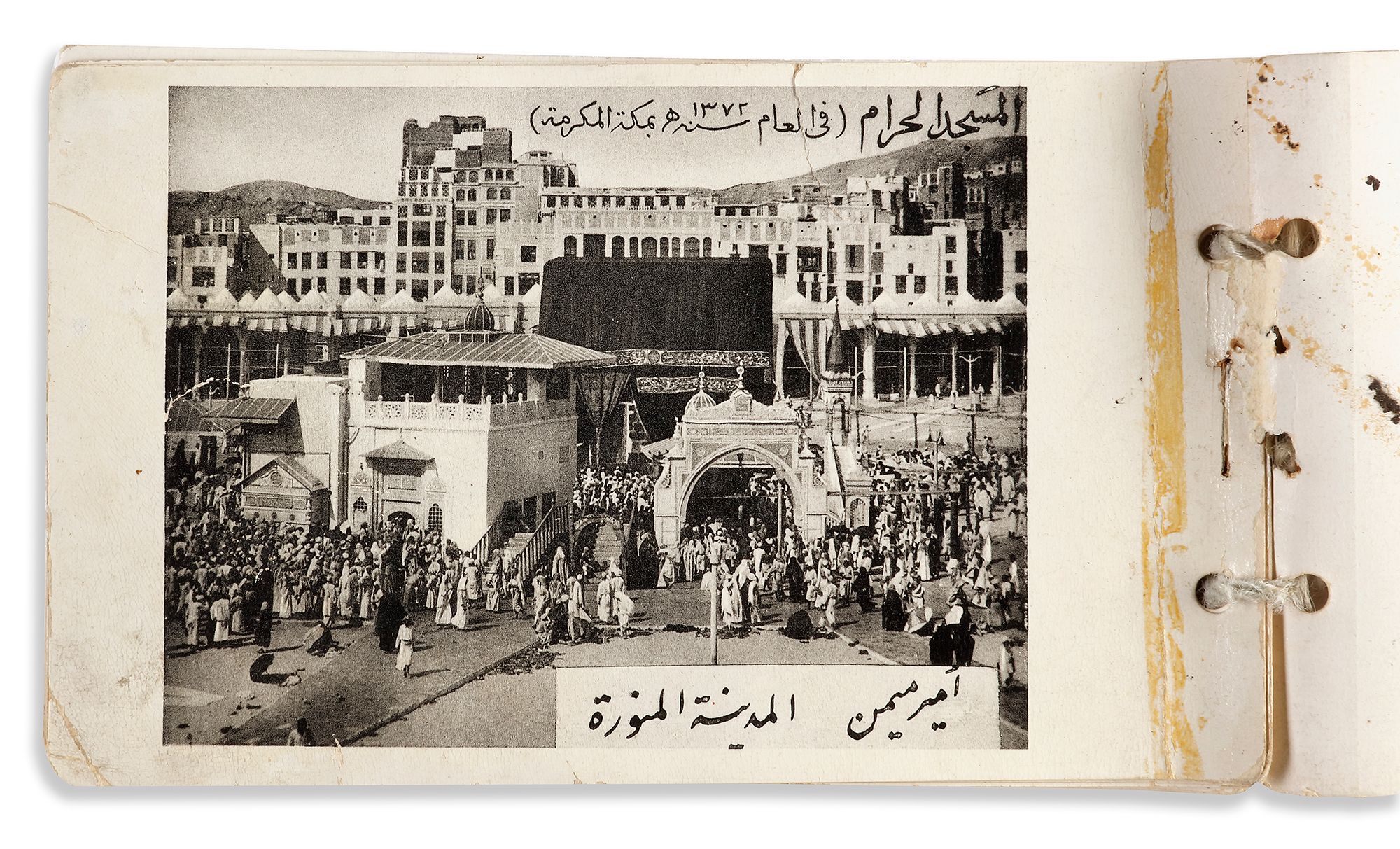 A Hajj souvenir album with twenty-four (24) black and white printed photo cards, the sepia ink title on paper reading The Views of The Two Noble Shrines (Mecca and Medina), The Order of Hajj and Pilgrimage, made by Amir Meyman, Medina 'the Enlightened', each photo card showing important landmarks of the pilgrimage sites, all accompanied by descriptive and identifying captions.