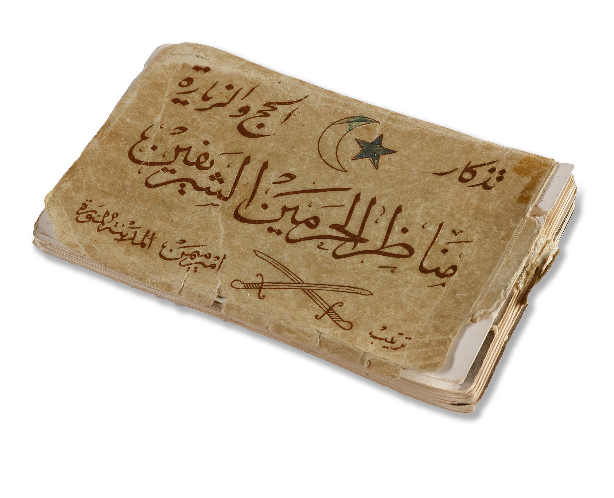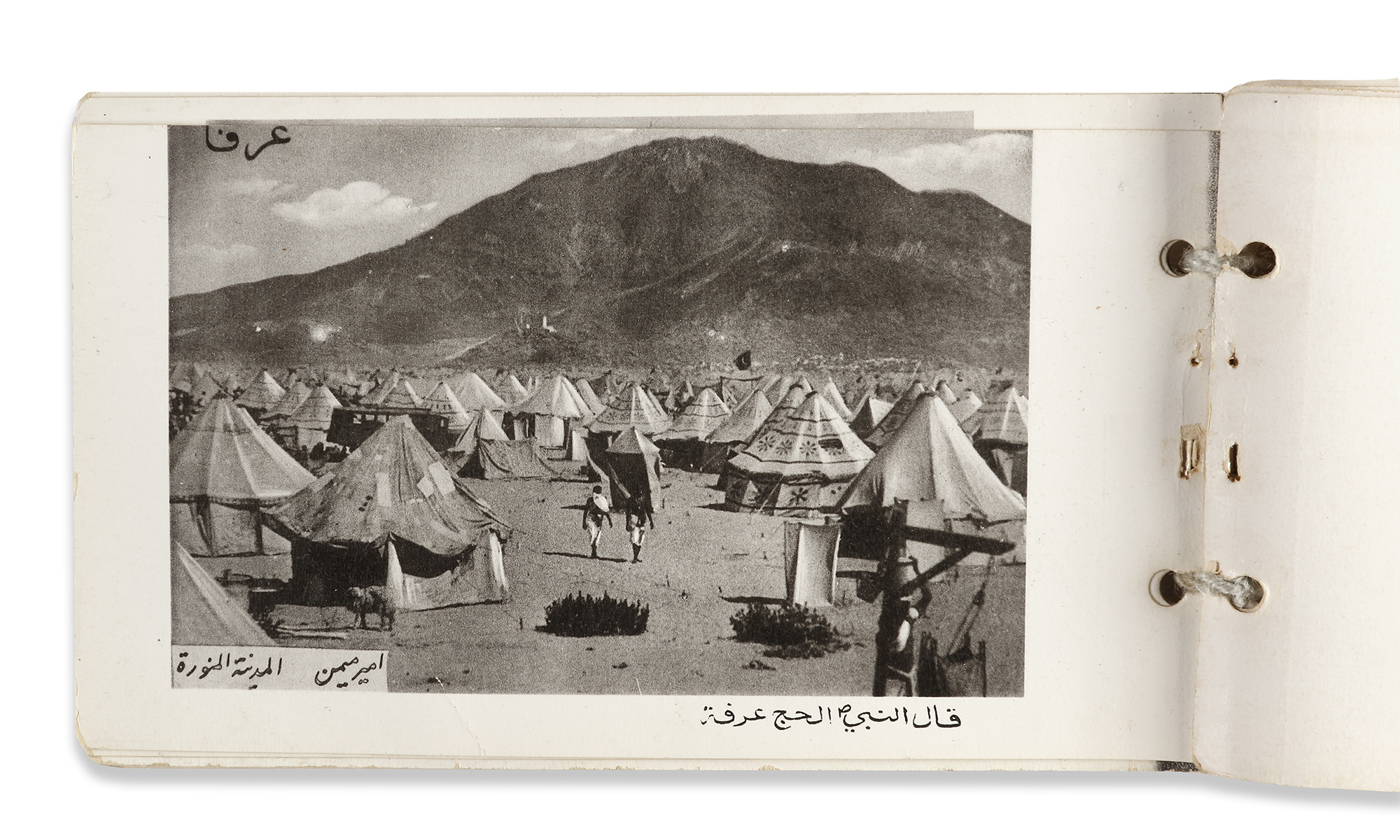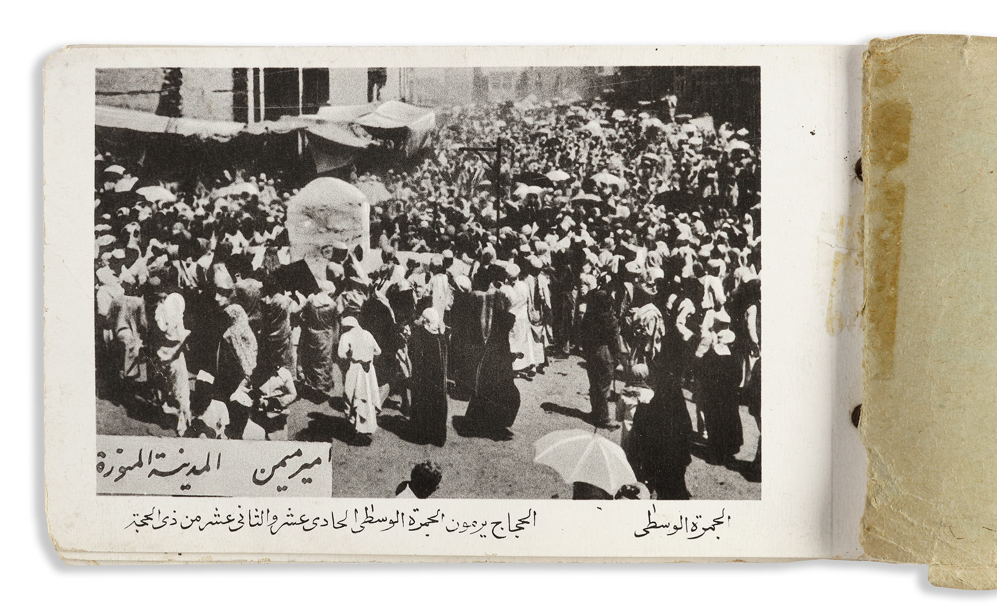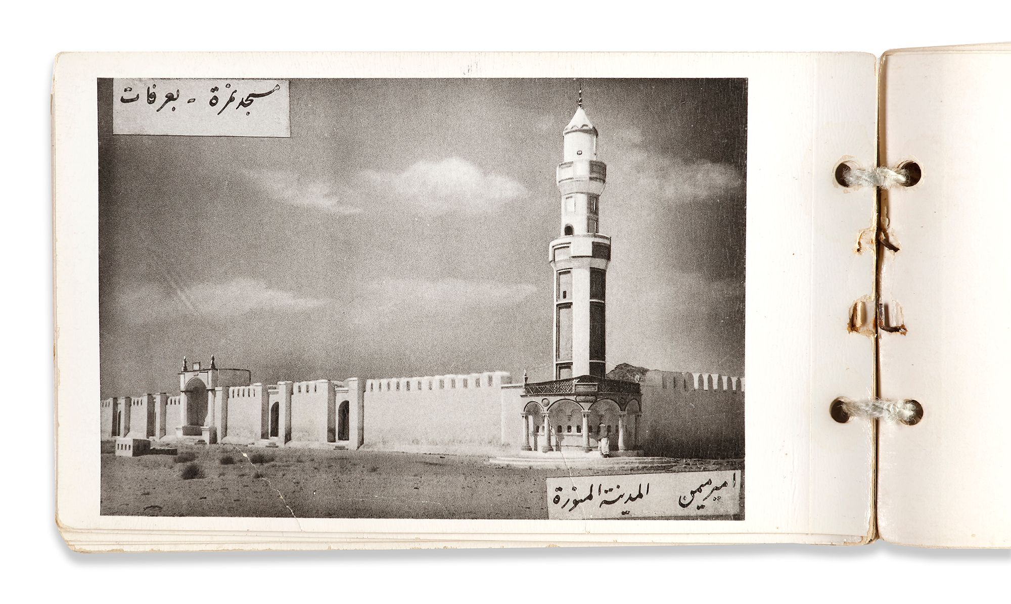 A Hajj souvenir album with twenty-four (24) black and white printed photo cards, the sepia ink title on paper reading The Views of The Two Noble Shrines (Mecca and Medina), The Order of Hajj and Pilgrimage, made by Amir Meyman, Medina 'the Enlightened', each photo card showing important landmarks of the pilgrimage sites, all accompanied by descriptive and identifying captions.