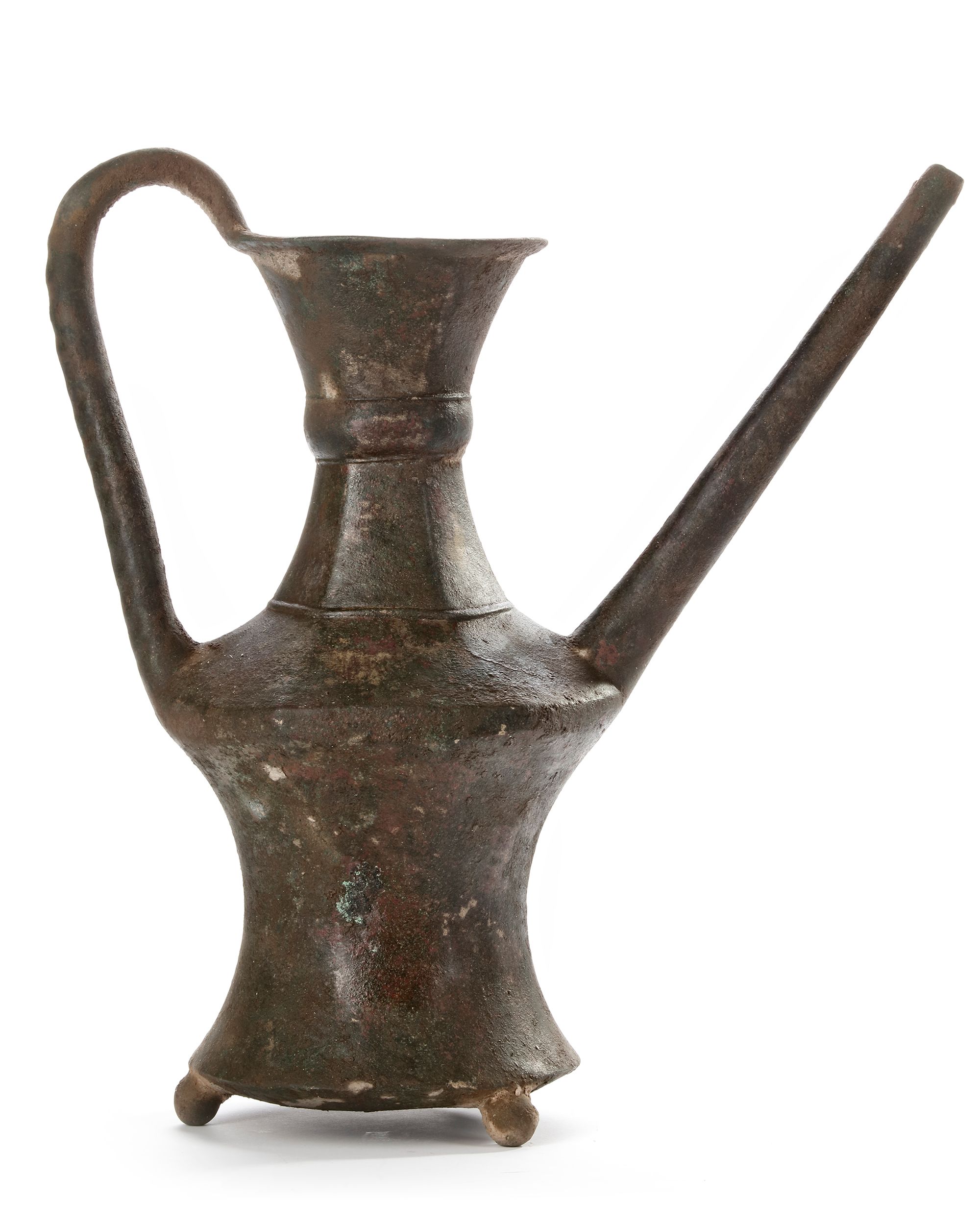 With waisted cylindrical body and flaring cylindrical neck widening to an everted rim around the mouth, and straight tubular angled spout, a curved handle with ball knob linking the shoulder and mouth, on three ball knob feet.