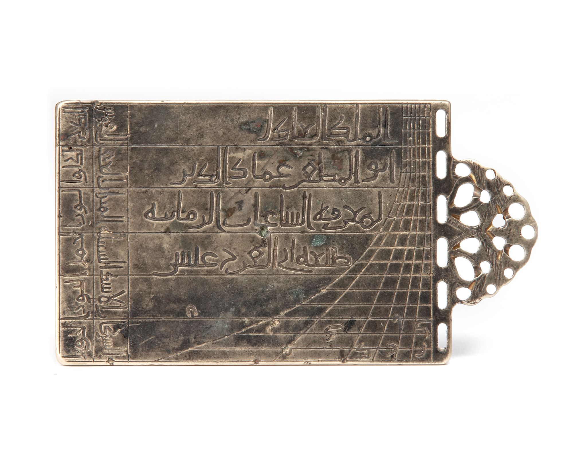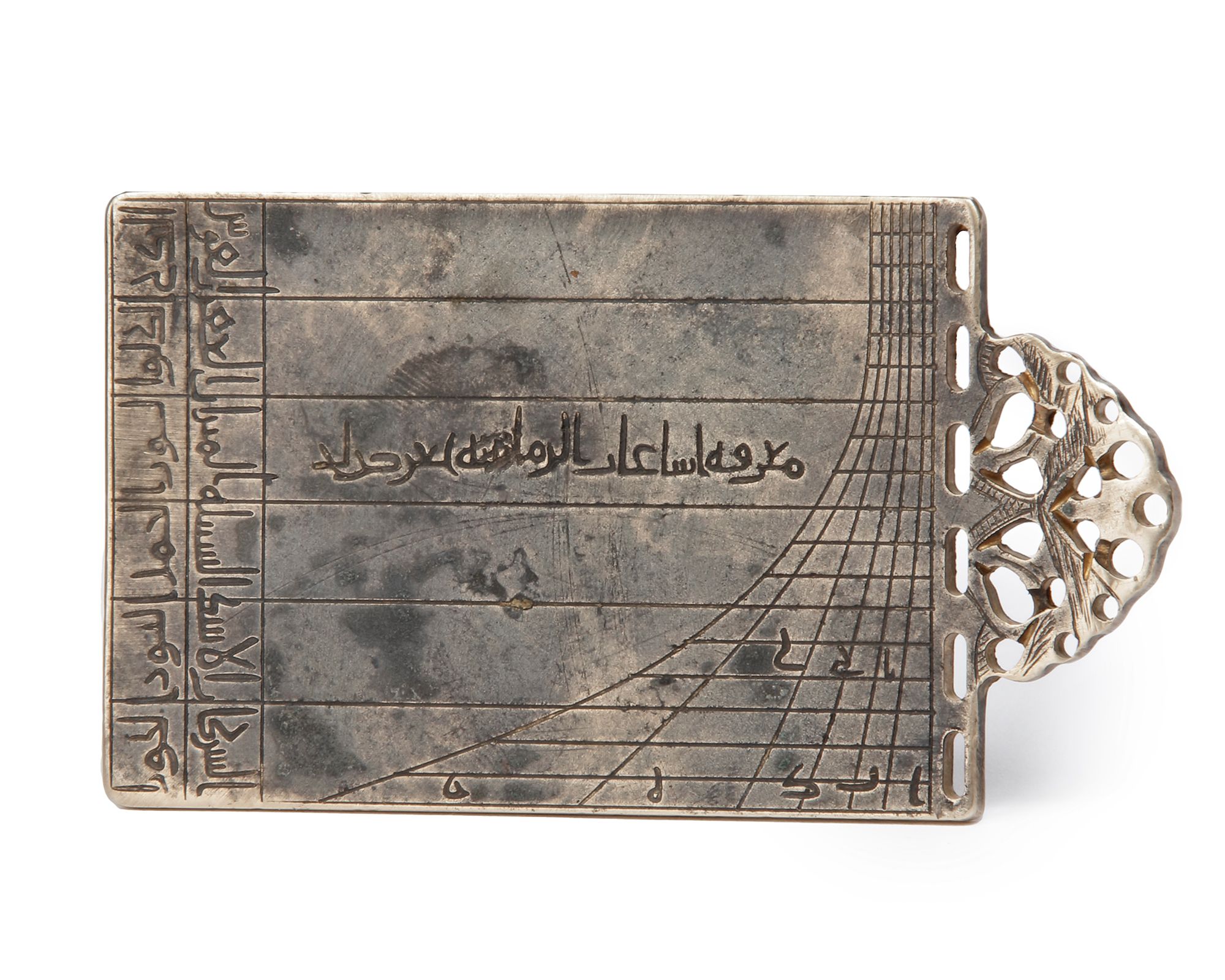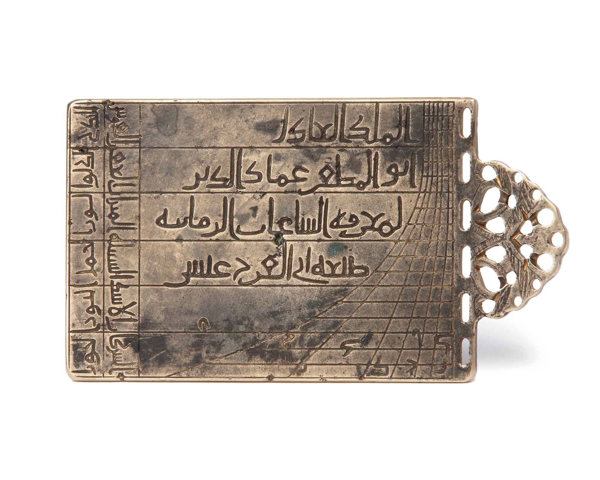 This “locust leg” pocket sundial, made for the Zangid ruler Malik al-Adil Abu Muzaffar Imad al-Din, the famous Turkoman commander known for his known his accomplishments surrounding the Fall of Edessa in 1144, was previously unknown to literature. The instrument is very similar to the exemplar made for the son of Imad al-Din, Nur al-Din Zangi, and which is now kept at the Bibliotheque Nationale in Paris (International Instrument Checklist #7315).