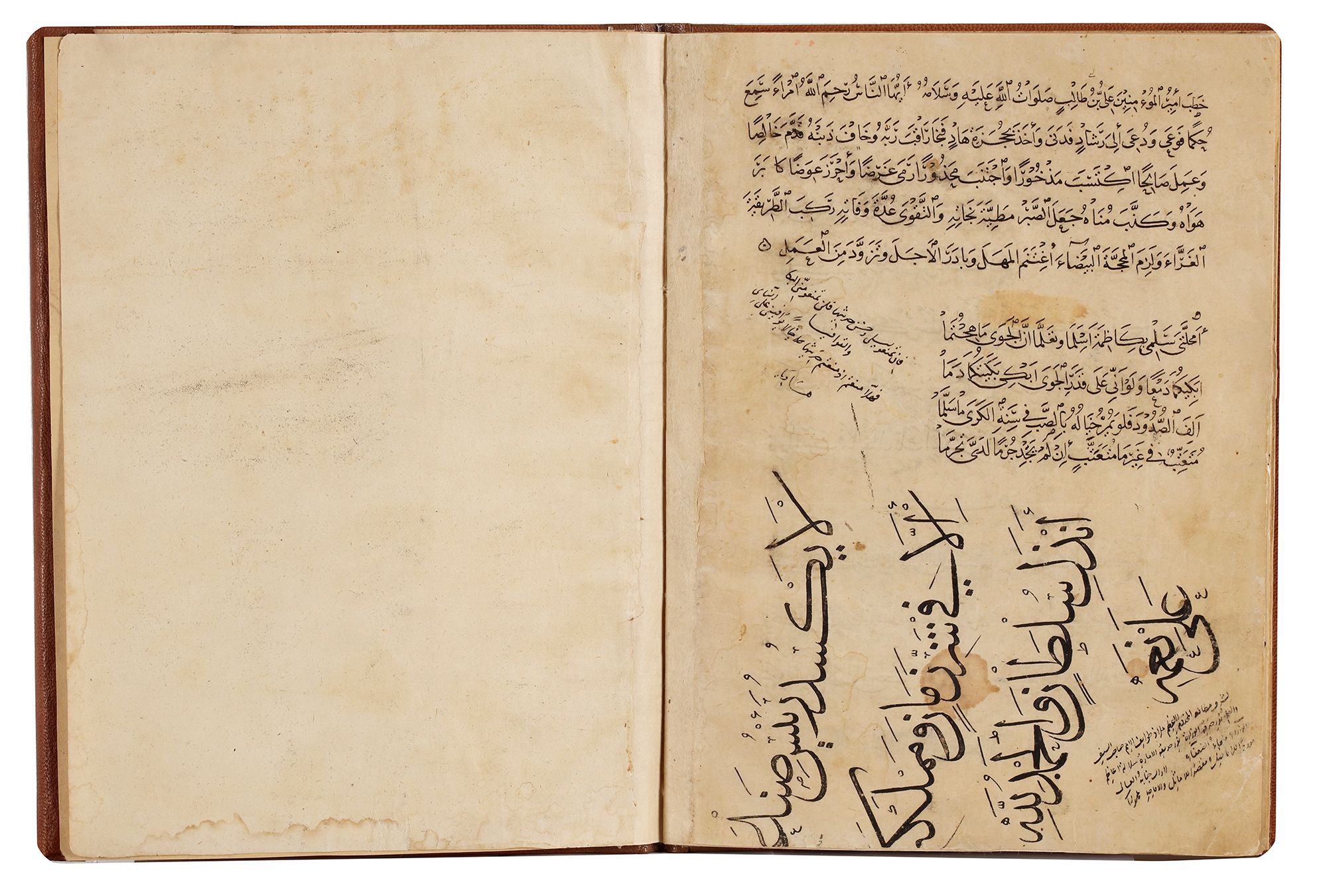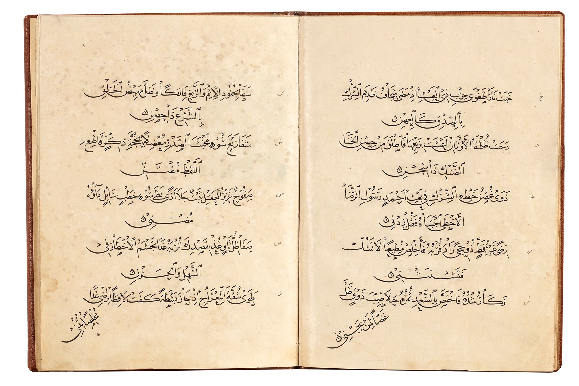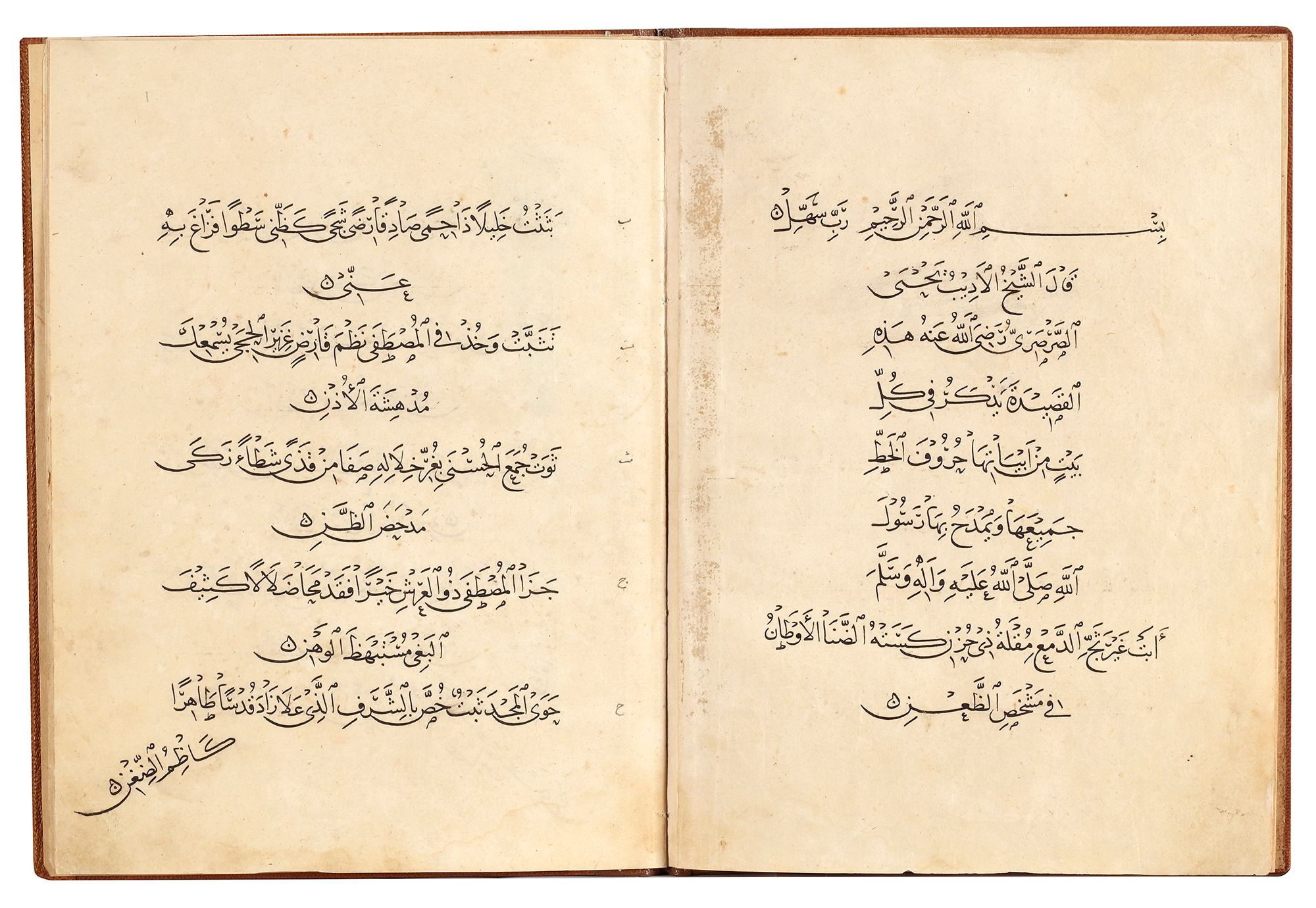 Arabic manuscript on paper, 7 leaves with 4 fly-leaves, 9 lines to each page, written in elegant black naskh script on a cream paper, poems of al-Sarsari and other poets in praise of the prophet. In deep brown morocco binding with flap.