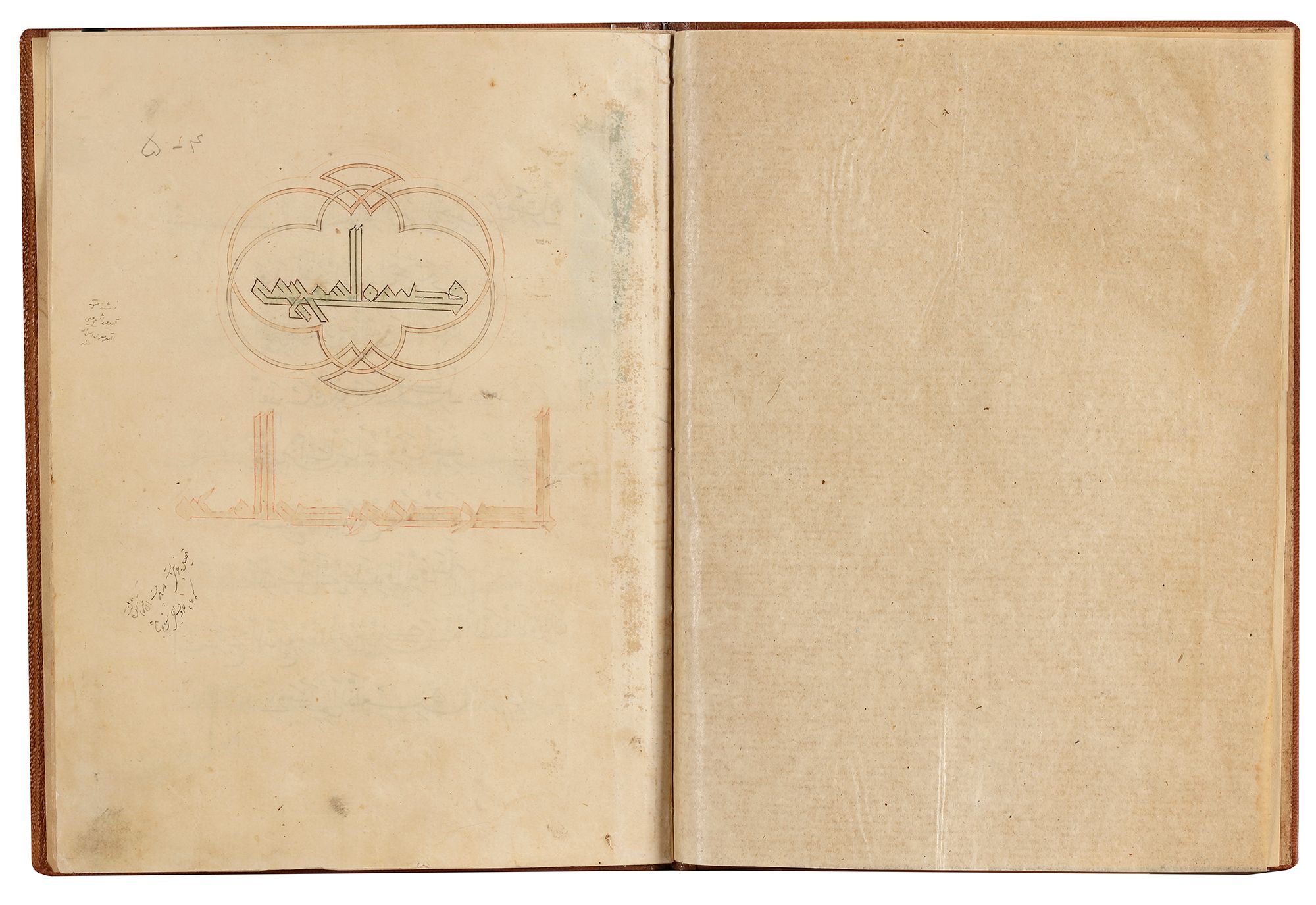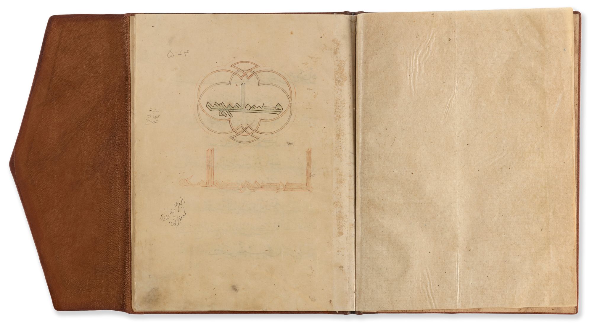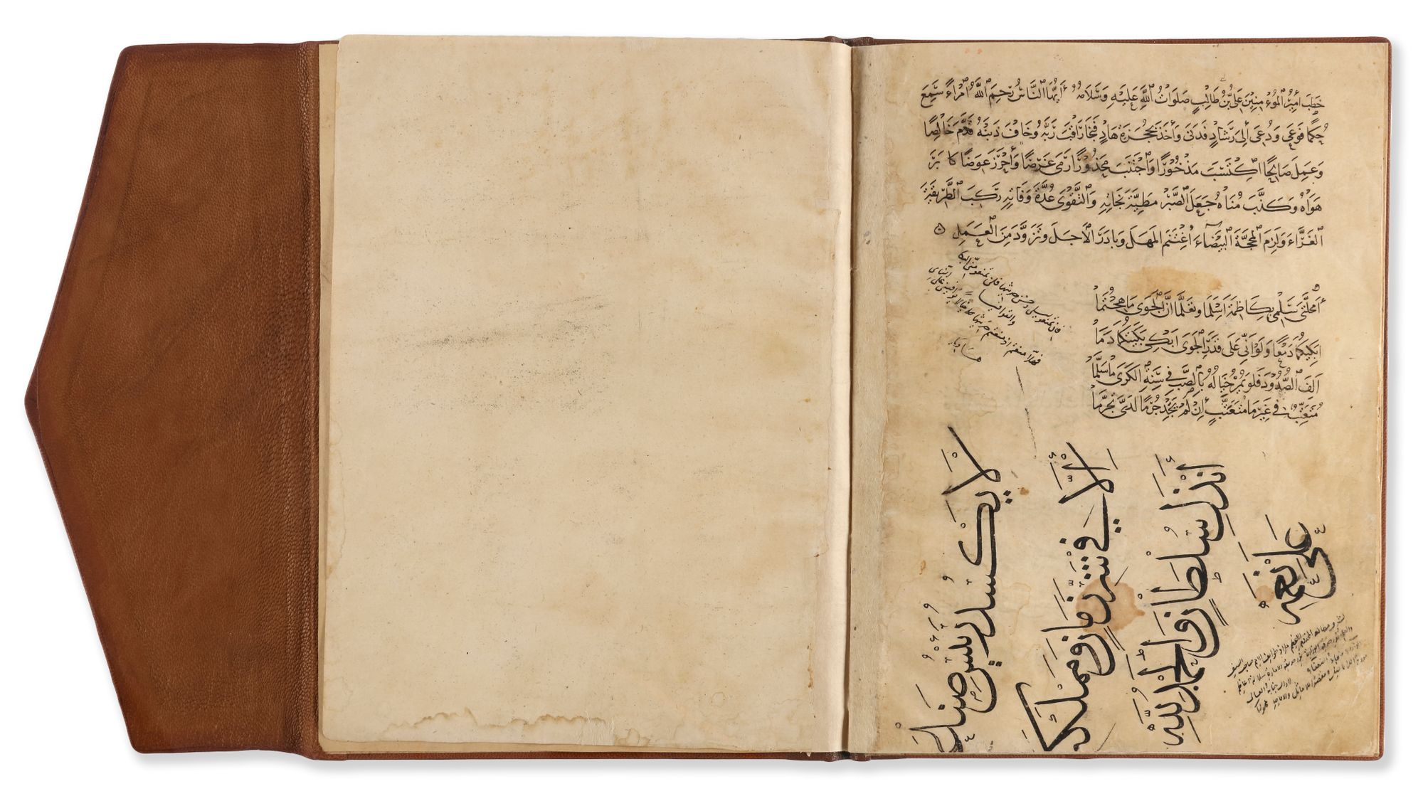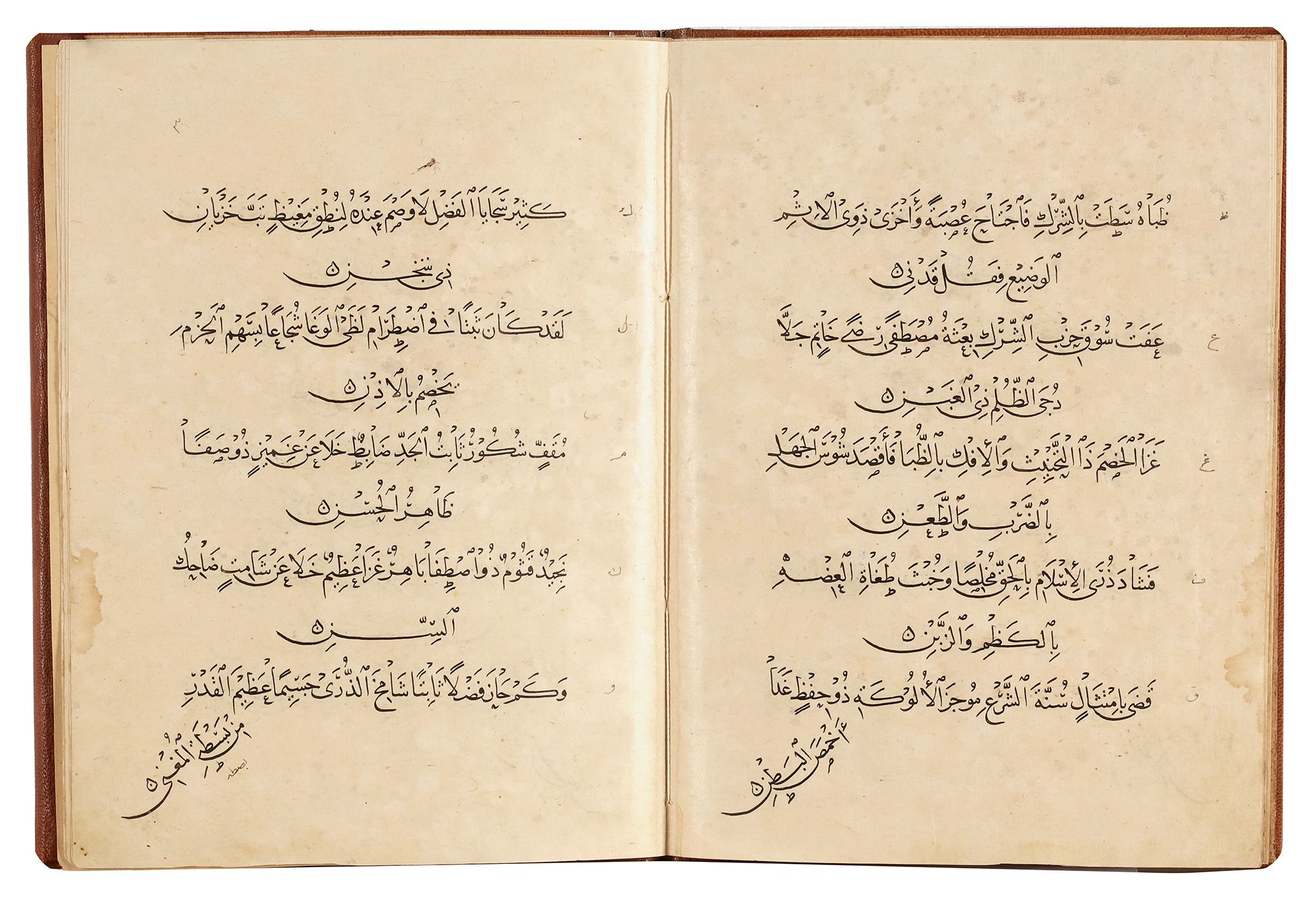 Arabic manuscript on paper, 7 leaves with 4 fly-leaves, 9 lines to each page, written in elegant black naskh script on a cream paper, poems of al-Sarsari and other poets in praise of the prophet. In deep brown morocco binding with flap.