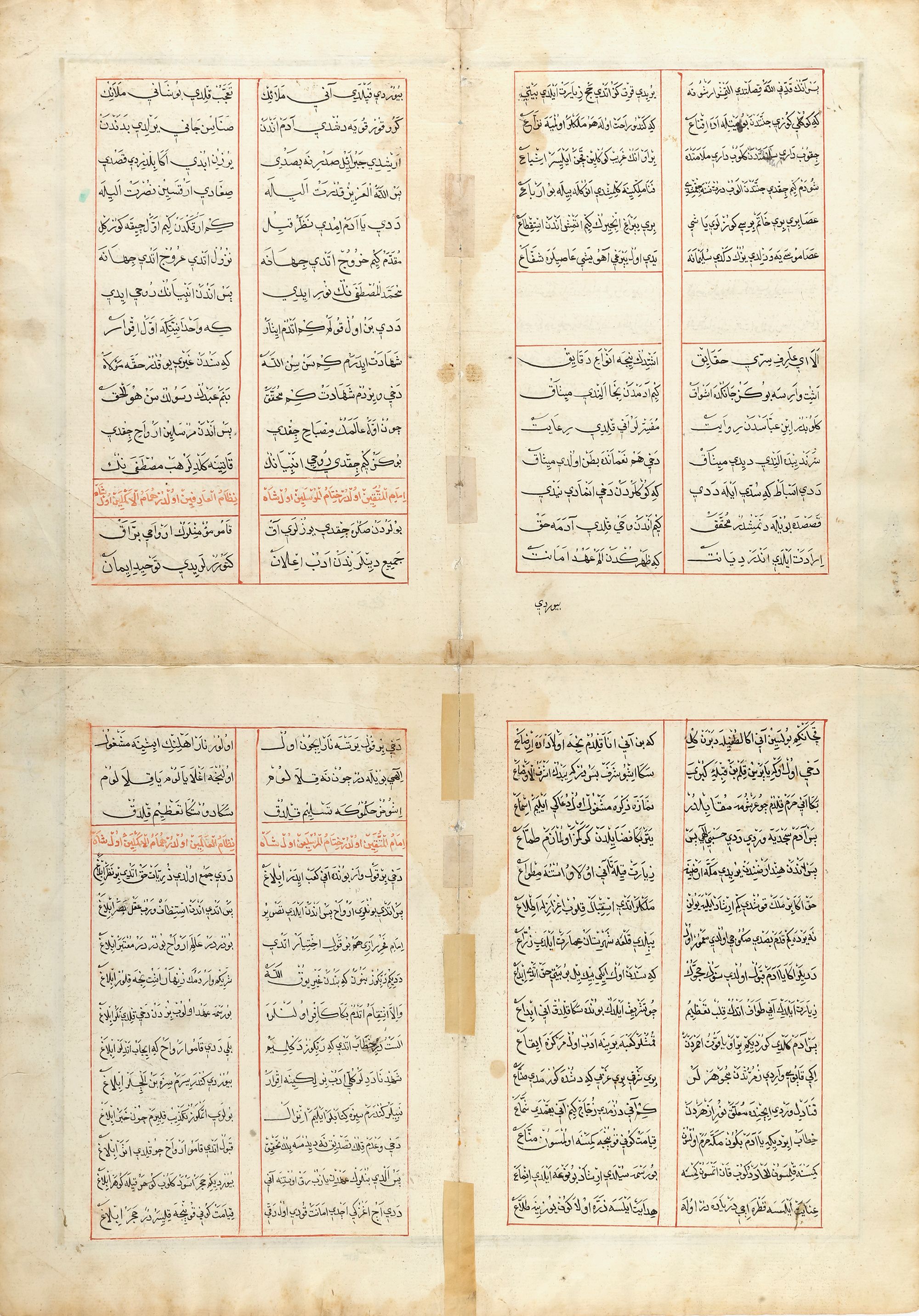 Gouche heightenend with gold on paper, depicting a drawing of a warship, illustraions of the length of the ship, numbers of oars, numbers and shapes of cannons, anchor lengths, unifroms of the sailers , and the instruments used for navigation. On the backside Arabic Ottoman manuscript in black ink arranged in two columns.