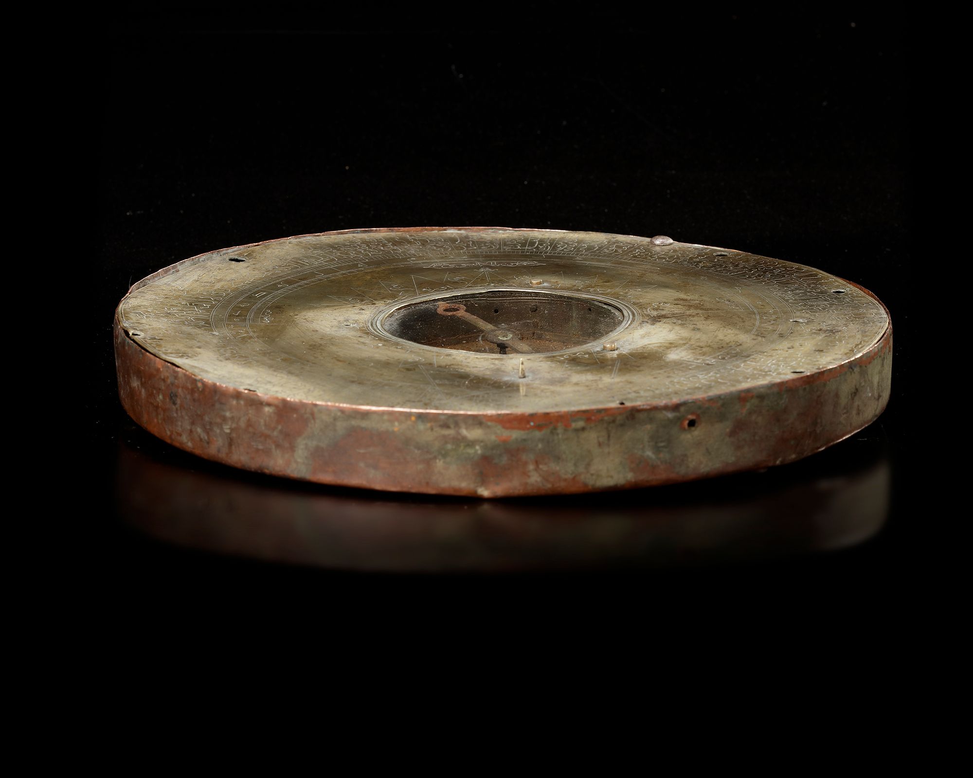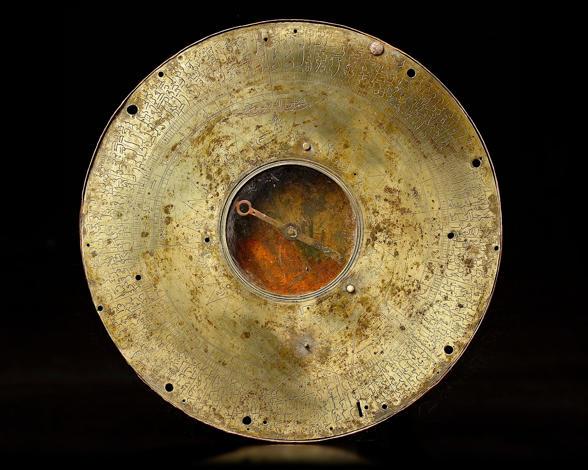 The main disk of the instrument consists of a circular brass plate. The center of a disk features a magnetic compass. Around the magnetic compass is a wind-rose with the typical four quarters of the compass: shimal (north), junub (south), sharq (west), garb (east)], and in between alternatingly in Ottoman Turkish “orta” (intermediary winds) and “kerte” (rhumb lines).