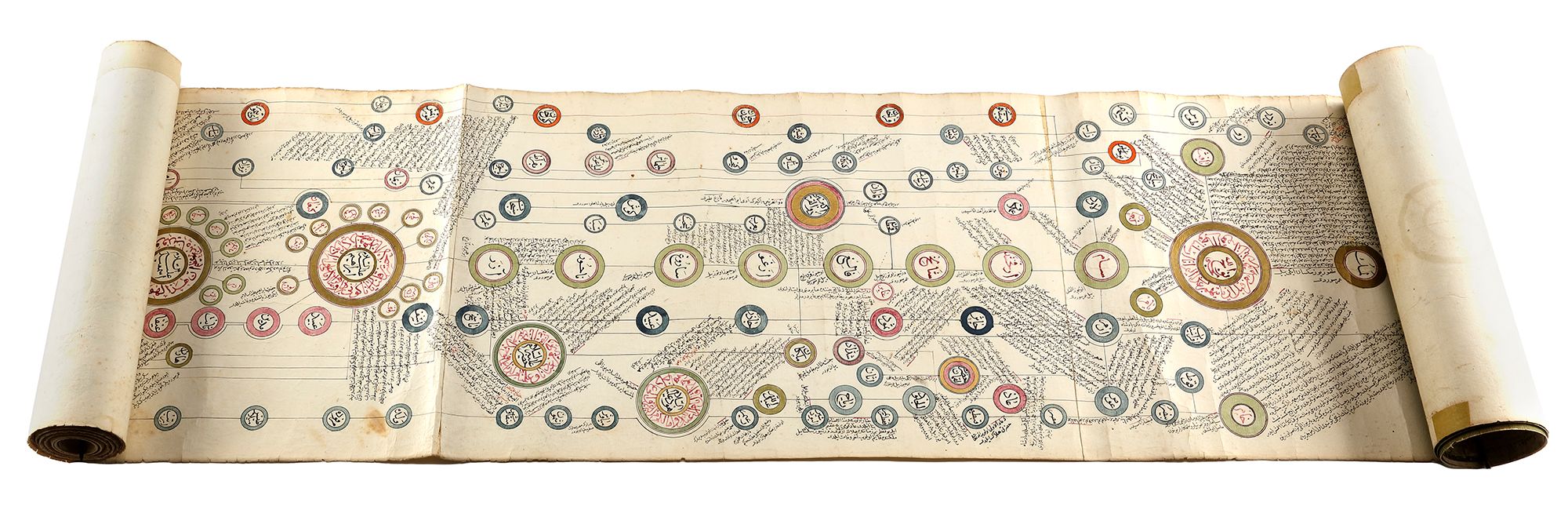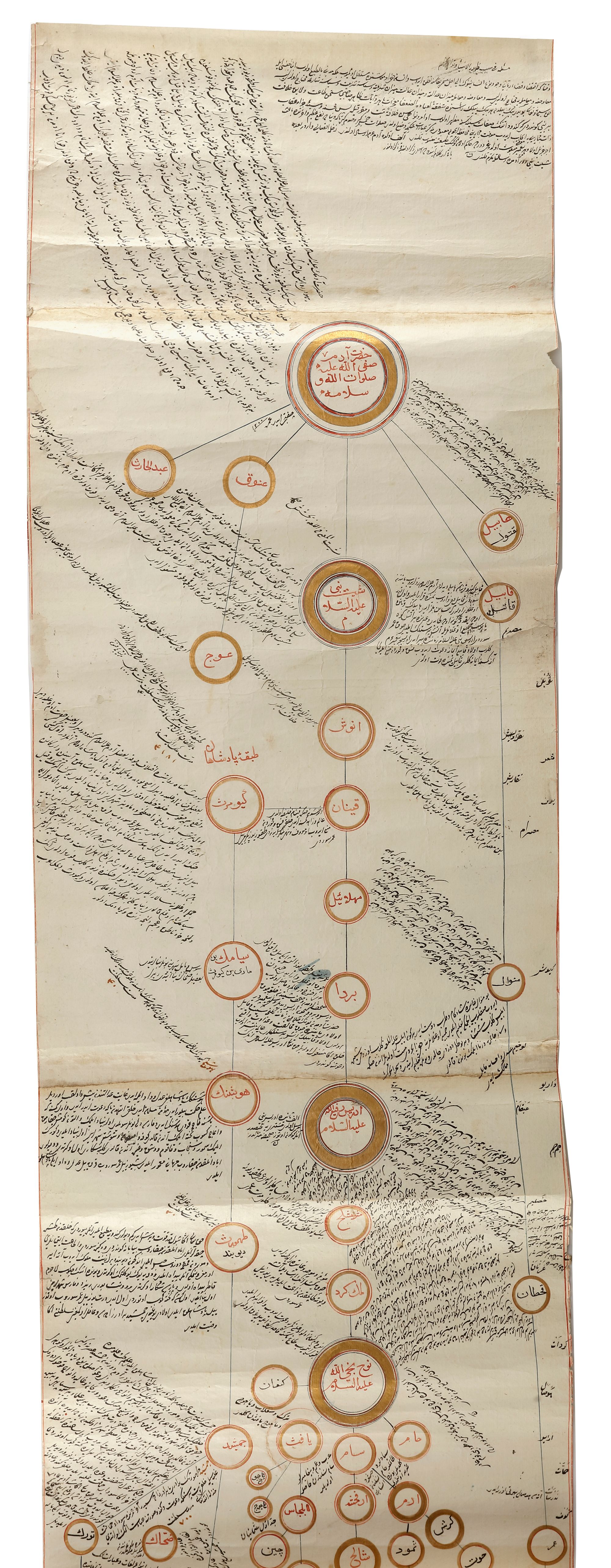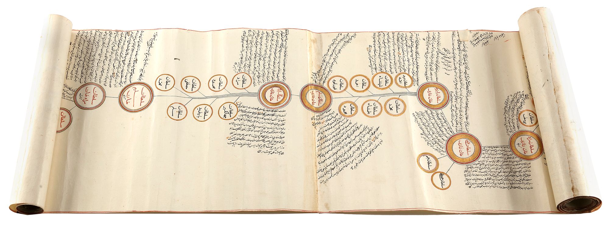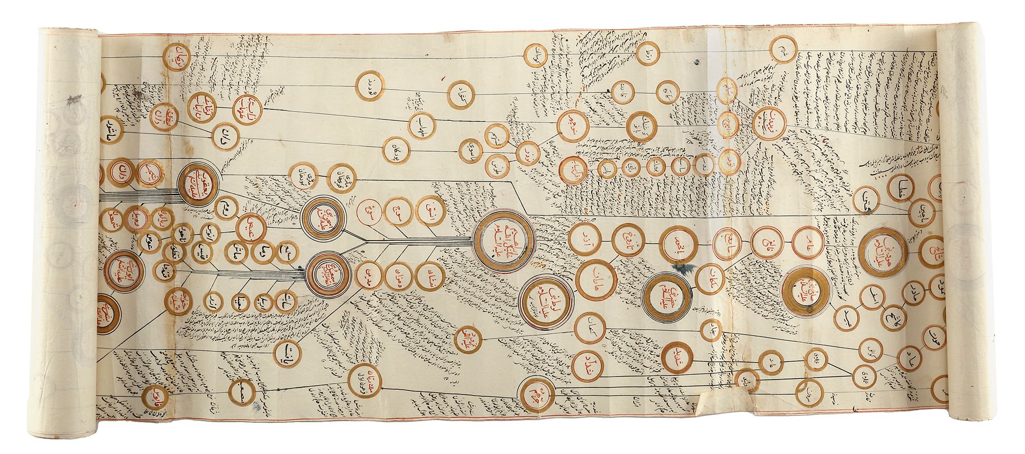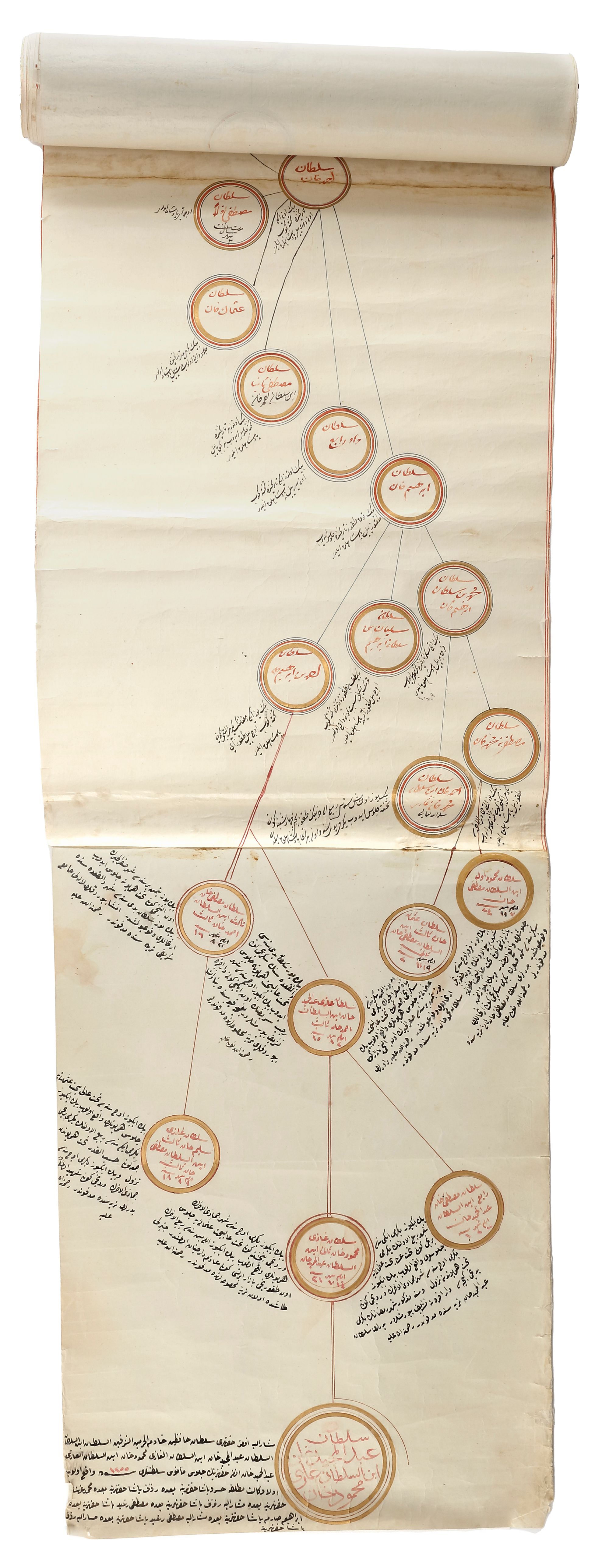 Arabic and Ottoman Turkish manuscript on paper, with roundels outlined in gold containing names and titles of historical figures in red diwani linked together by red lines, the scroll starts with Adam and finishes with the Ottoman Sultan Abülmecid I, the roundels surrounded by notes in black diwani, the margins with red rules, dated in the lower left hand corner.