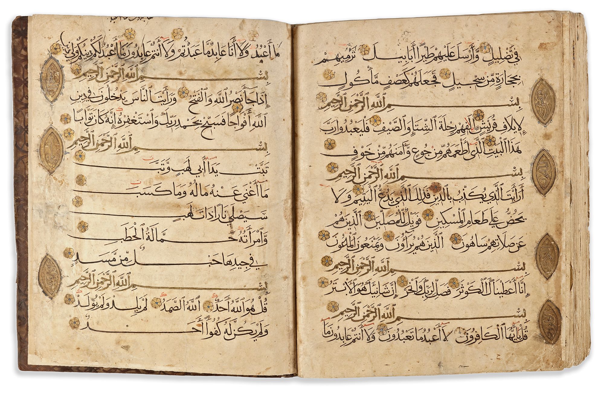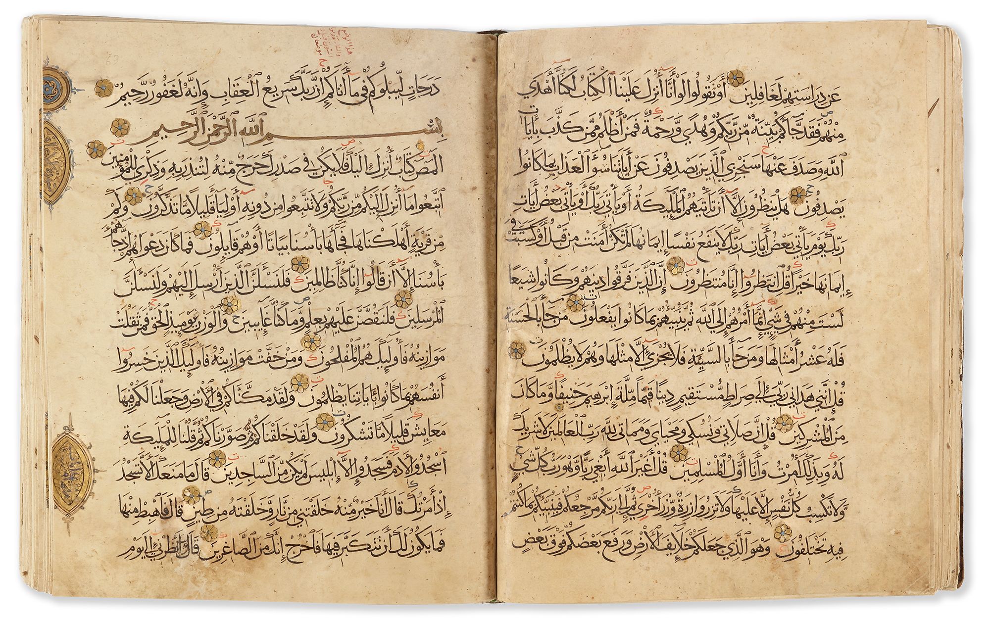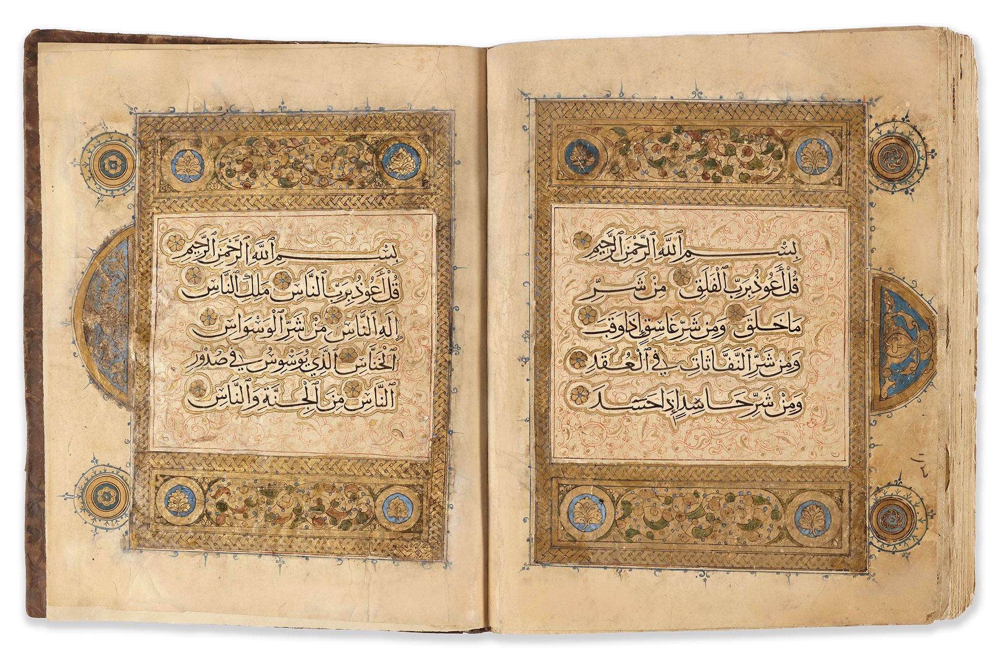 A complete Quran, Arabic manuscript on paper, 260 leaves, each folio with 13 lines of elegant black muhaqqaq script, diacritics and vowels in red, gold roundel verse markers outlined in black with polychrome dots, large gilt and polychrome floral marginal 'juz and hizb' medallions. Notes of the names of the surahs, rab'a hizb, nisf hizb, rab'a wa nisf hizb and sajda marked in thulth script outlined in black in the margins. The Basmallah of surah headings in gold thuluth outlined in black. Opening bifolio with double carpet page with geometric panels followed by two pages fully illuminated in gold and polychrome framing 5 lines of black muhaqqaq script in clouds reserved against a sprinkled gilt ground. The last three pages similarly decorated.