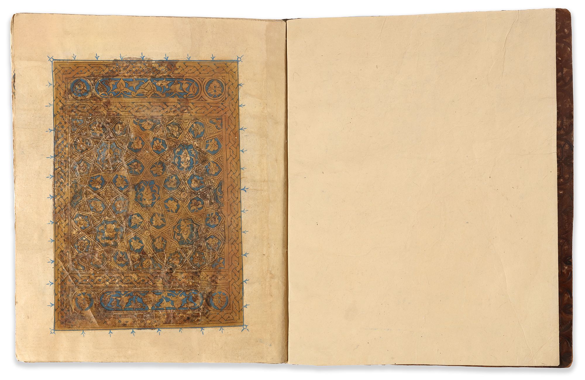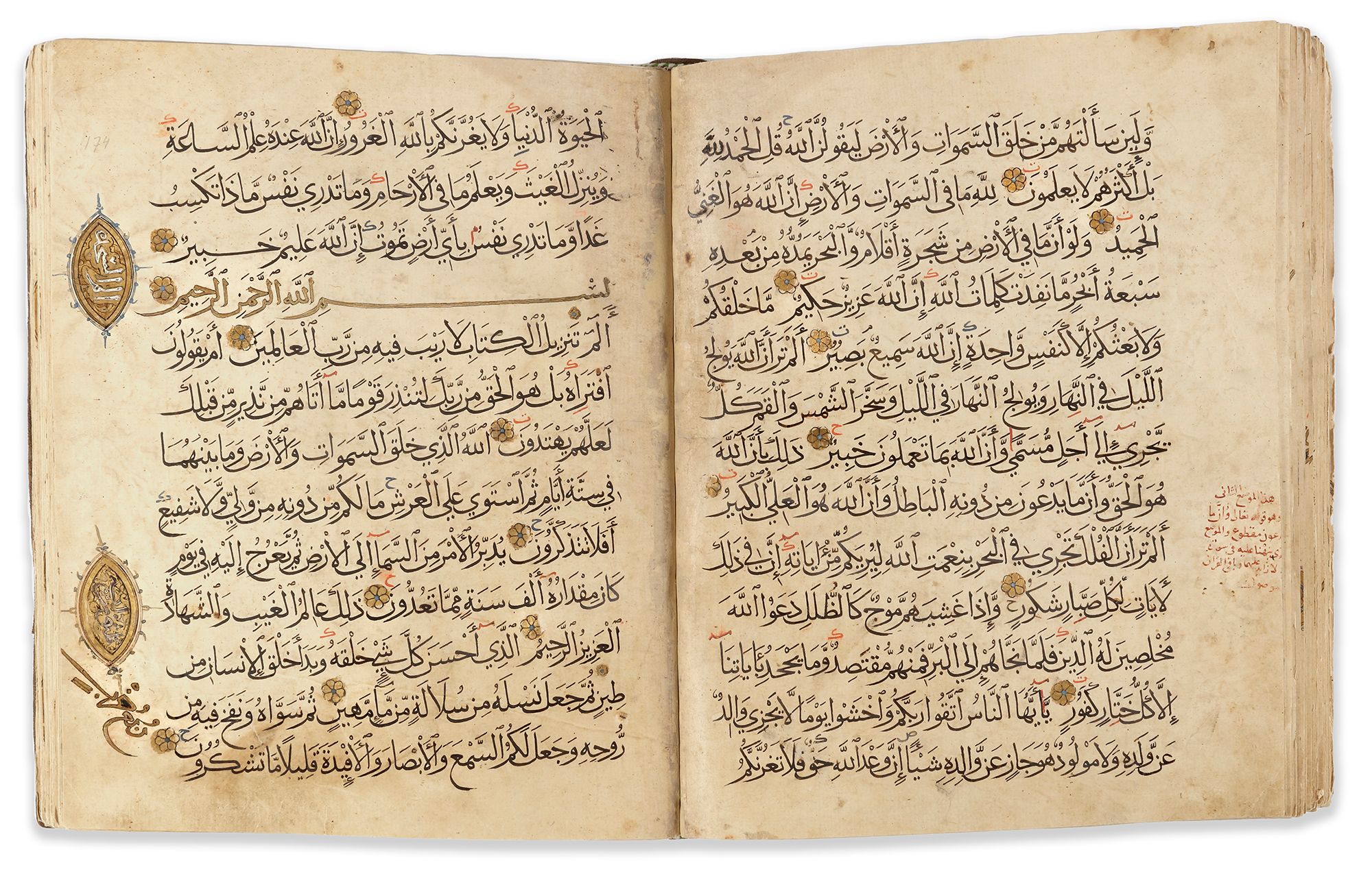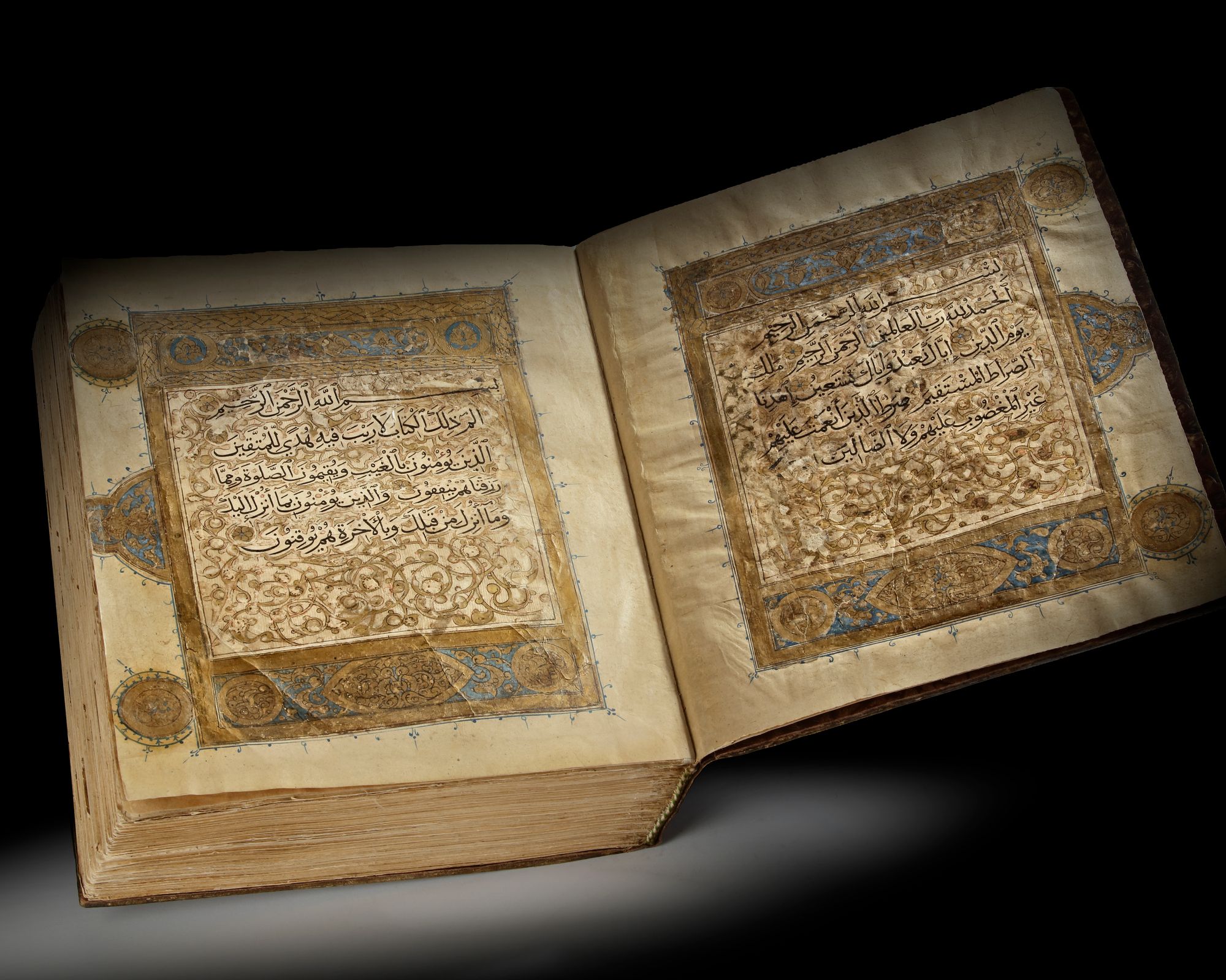 A complete Quran, Arabic manuscript on paper, 260 leaves, each folio with 13 lines of elegant black muhaqqaq script, diacritics and vowels in red, gold roundel verse markers outlined in black with polychrome dots, large gilt and polychrome floral marginal 'juz and hizb' medallions. Notes of the names of the surahs, rab'a hizb, nisf hizb, rab'a wa nisf hizb and sajda marked in thulth script outlined in black in the margins. The Basmallah of surah headings in gold thuluth outlined in black. Opening bifolio with double carpet page with geometric panels followed by two pages fully illuminated in gold and polychrome framing 5 lines of black muhaqqaq script in clouds reserved against a sprinkled gilt ground. The last three pages similarly decorated.