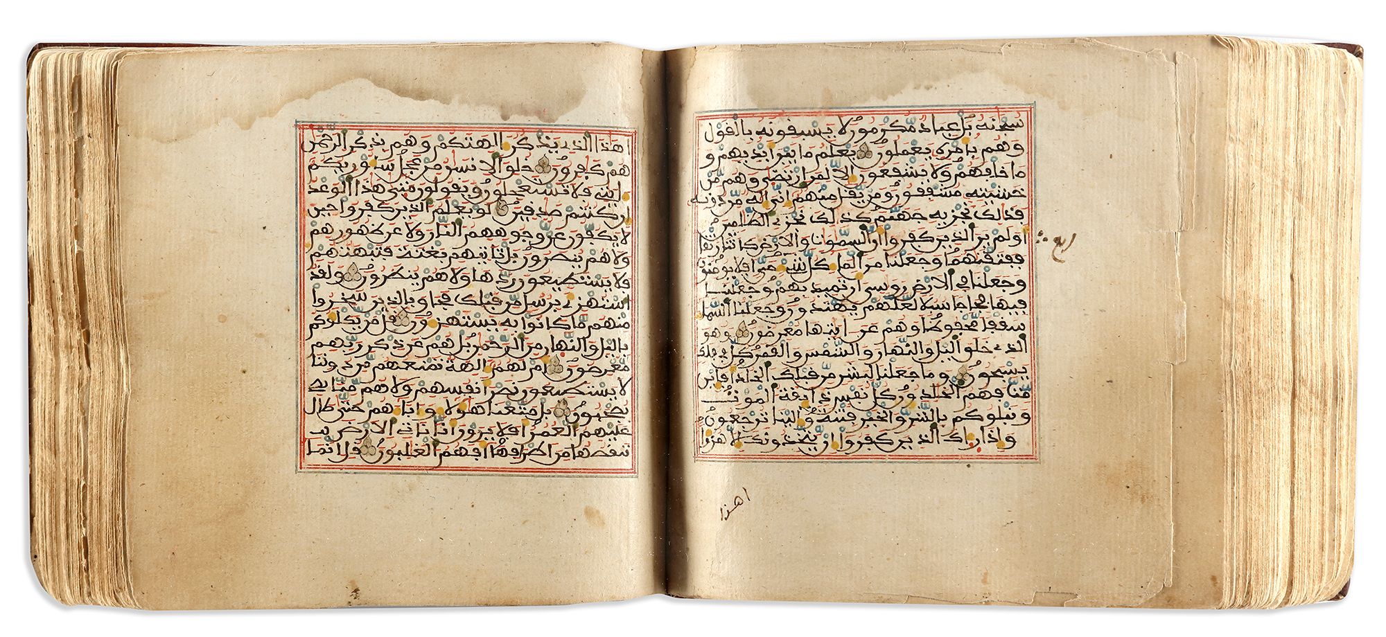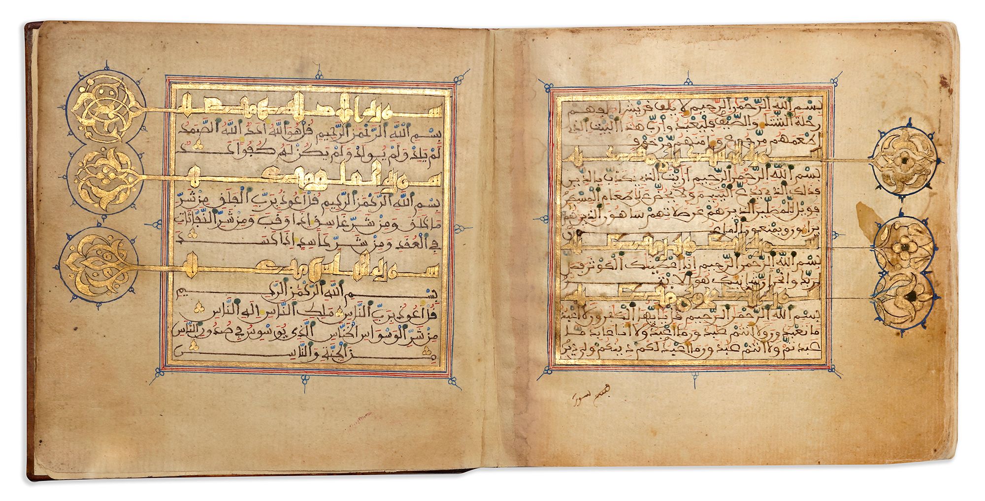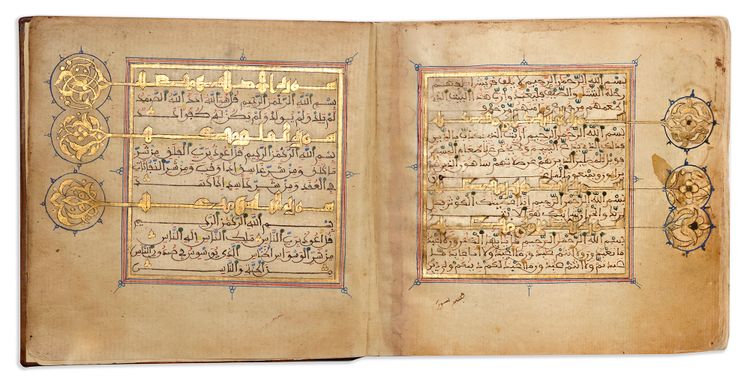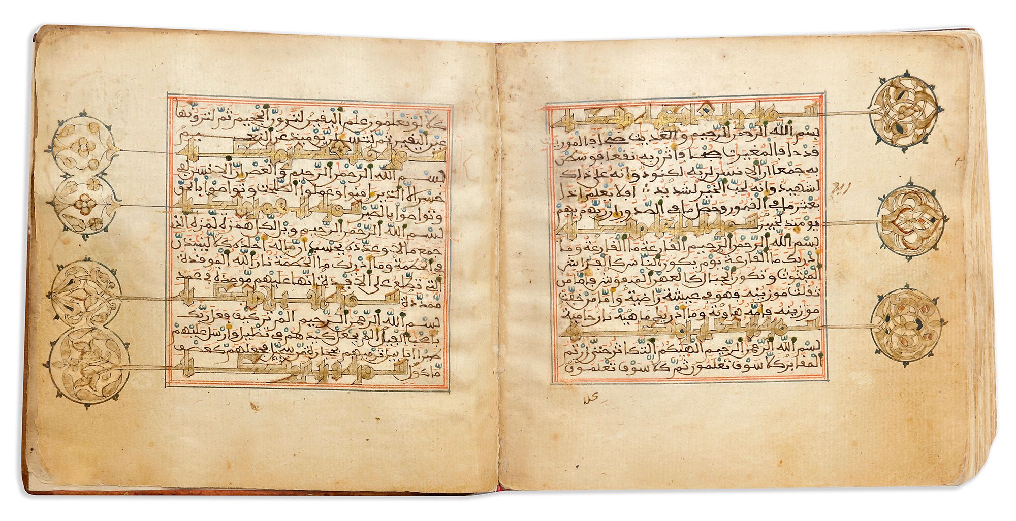 A complete Quran, Arabic manuscript on cream paper, each page with 15 lines written in brown maghribi script, diacritics and vowel in red and blue, ruled in red and blue borders, gold roundel verse markers. Surah headings in gilt earstern Kufic script outlined in black with an interlacing scroll medallion on the margin, large gold and polychrome marginal floral motifs indicating 'the Juz and Hizb'.