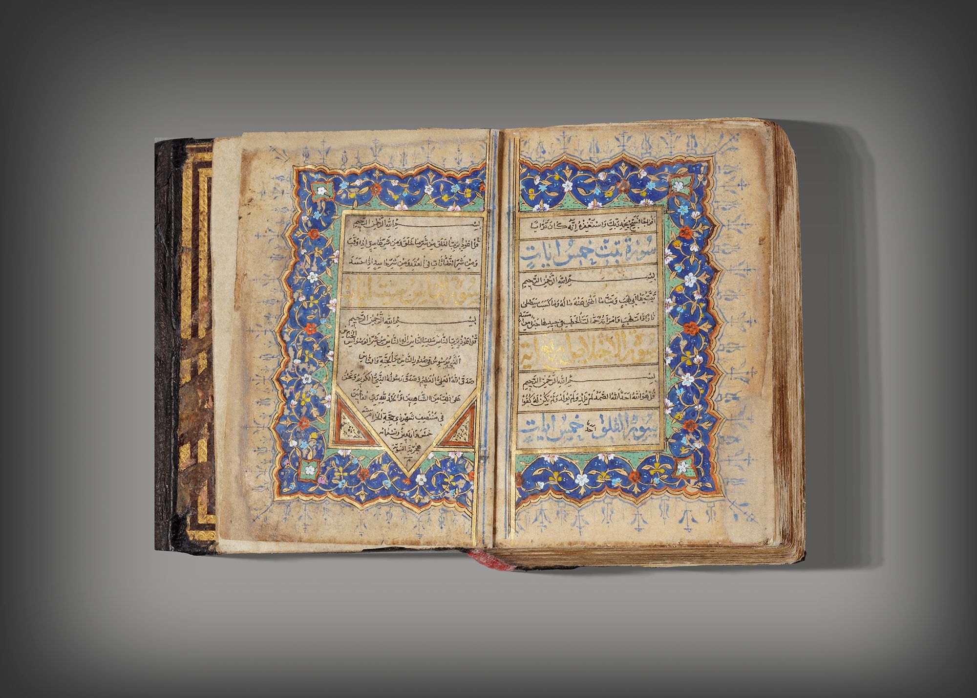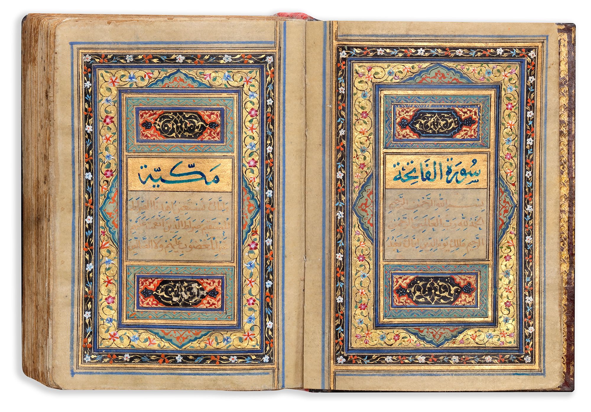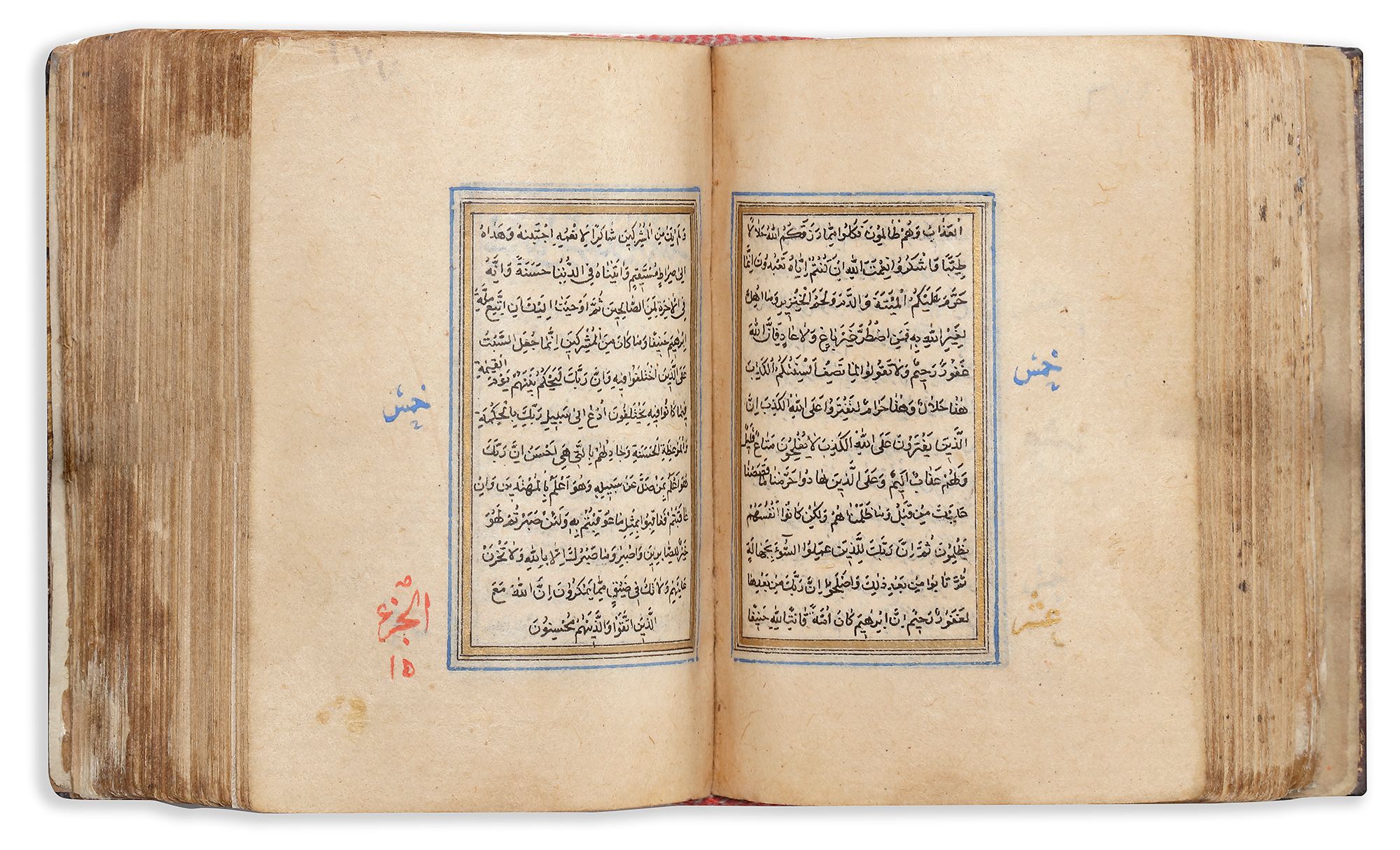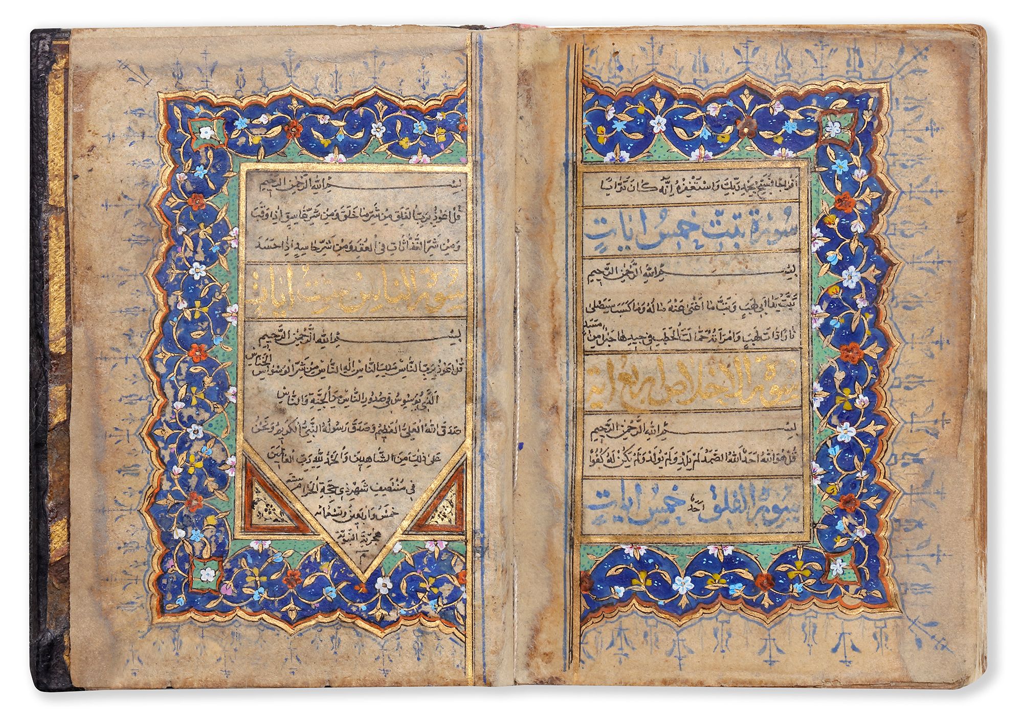 A complete Quran, Arabic manuscript on cream paper, each page with 12 lines written in black naskh script within gold and blue rules. Surah headings in gold and blue thuluth script marginal occasional notes of khums and ashore in gold and blue. Two opening biofolia heavily with gilt and polychrome decoration framing 3 lines of gold naskh script with tajwid in blue. Final folio with a prayer for completion of the recitation of the Quran (Due- al-Khatm) and dated Dhu al-Hijjah 945 AH.