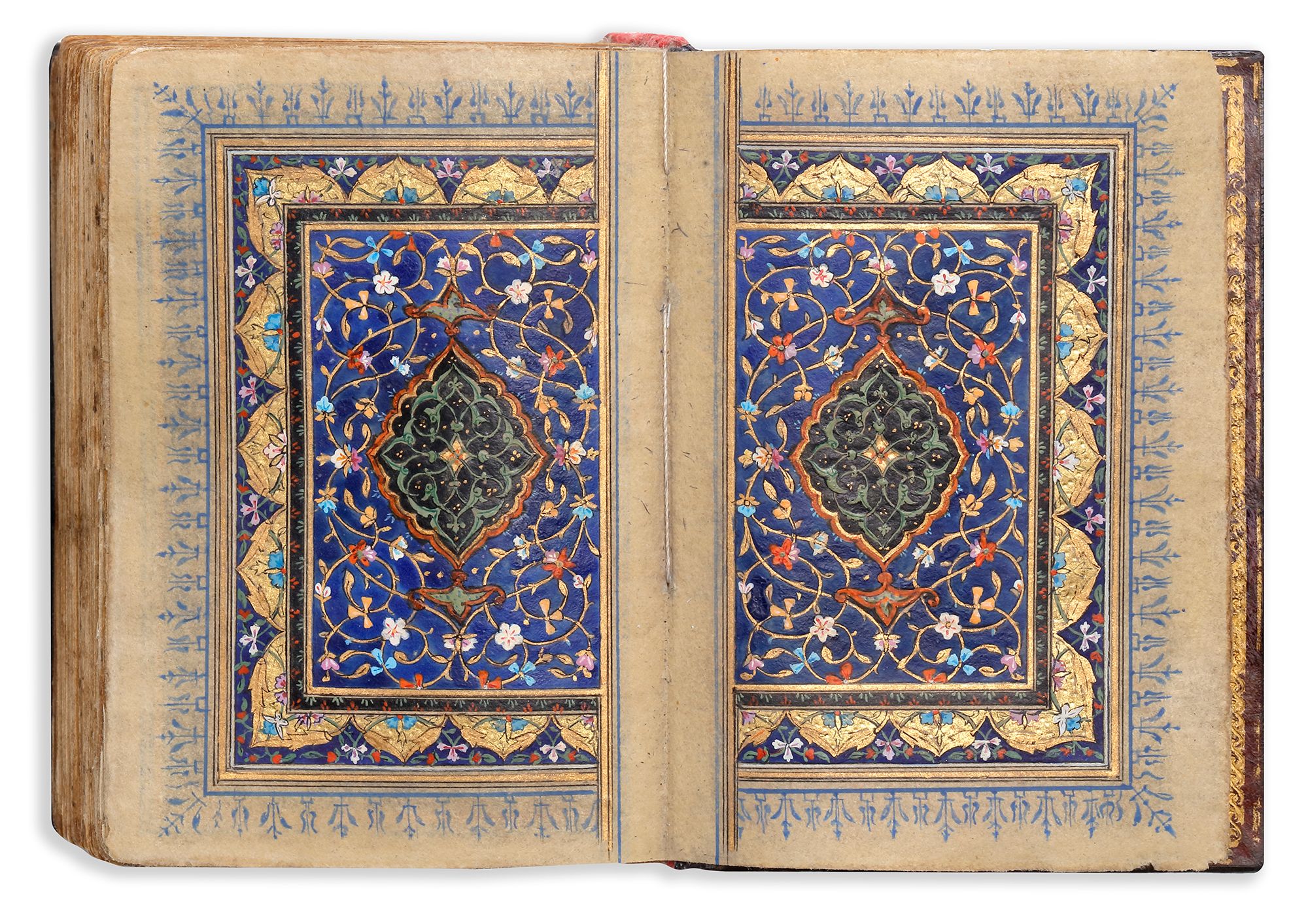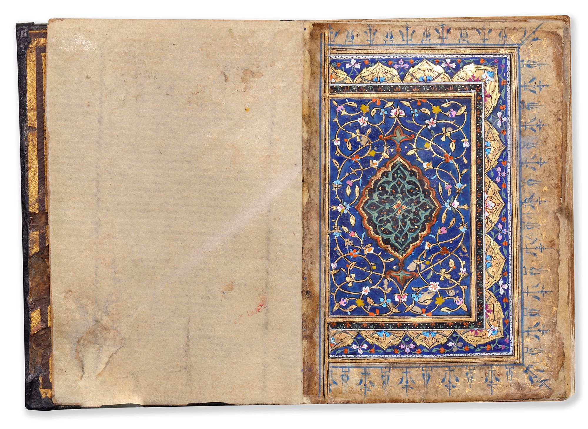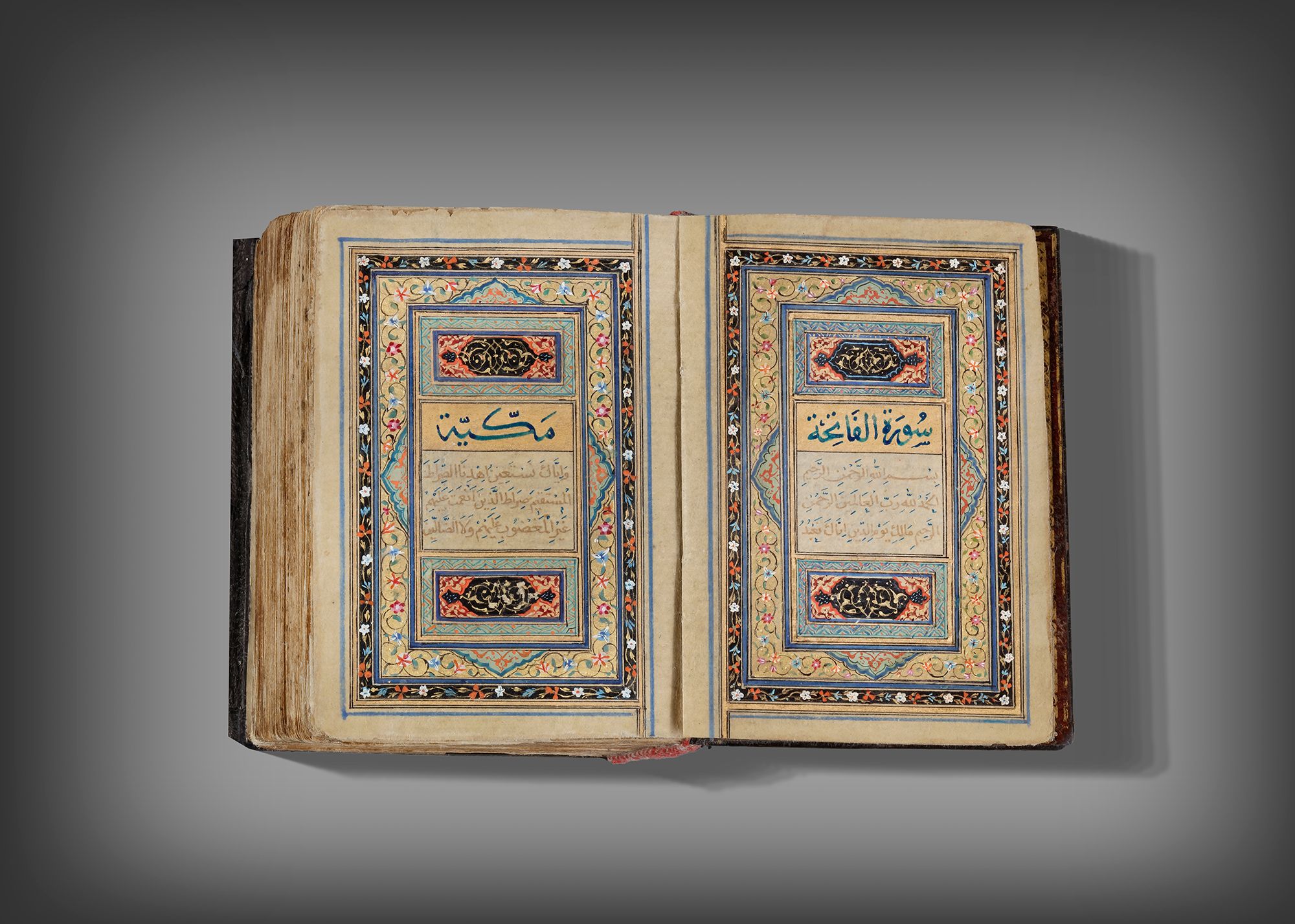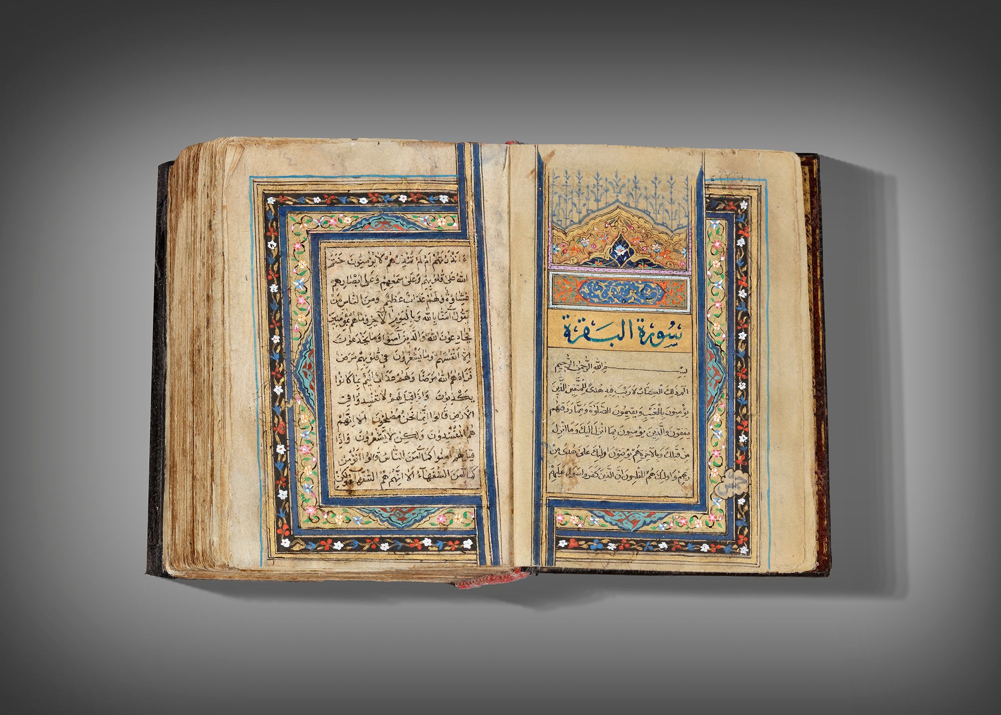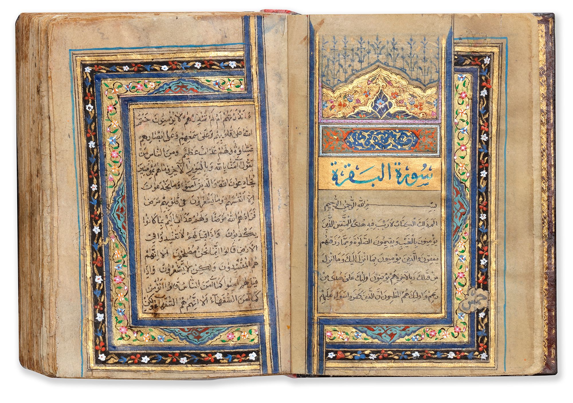 A complete Quran, Arabic manuscript on cream paper, each page with 12 lines written in black naskh script within gold and blue rules. Surah headings in gold and blue thuluth script marginal occasional notes of khums and ashore in gold and blue. Two opening biofolia heavily with gilt and polychrome decoration framing 3 lines of gold naskh script with tajwid in blue. Final folio with a prayer for completion of the recitation of the Quran (Due- al-Khatm) and dated Dhu al-Hijjah 945 AH.