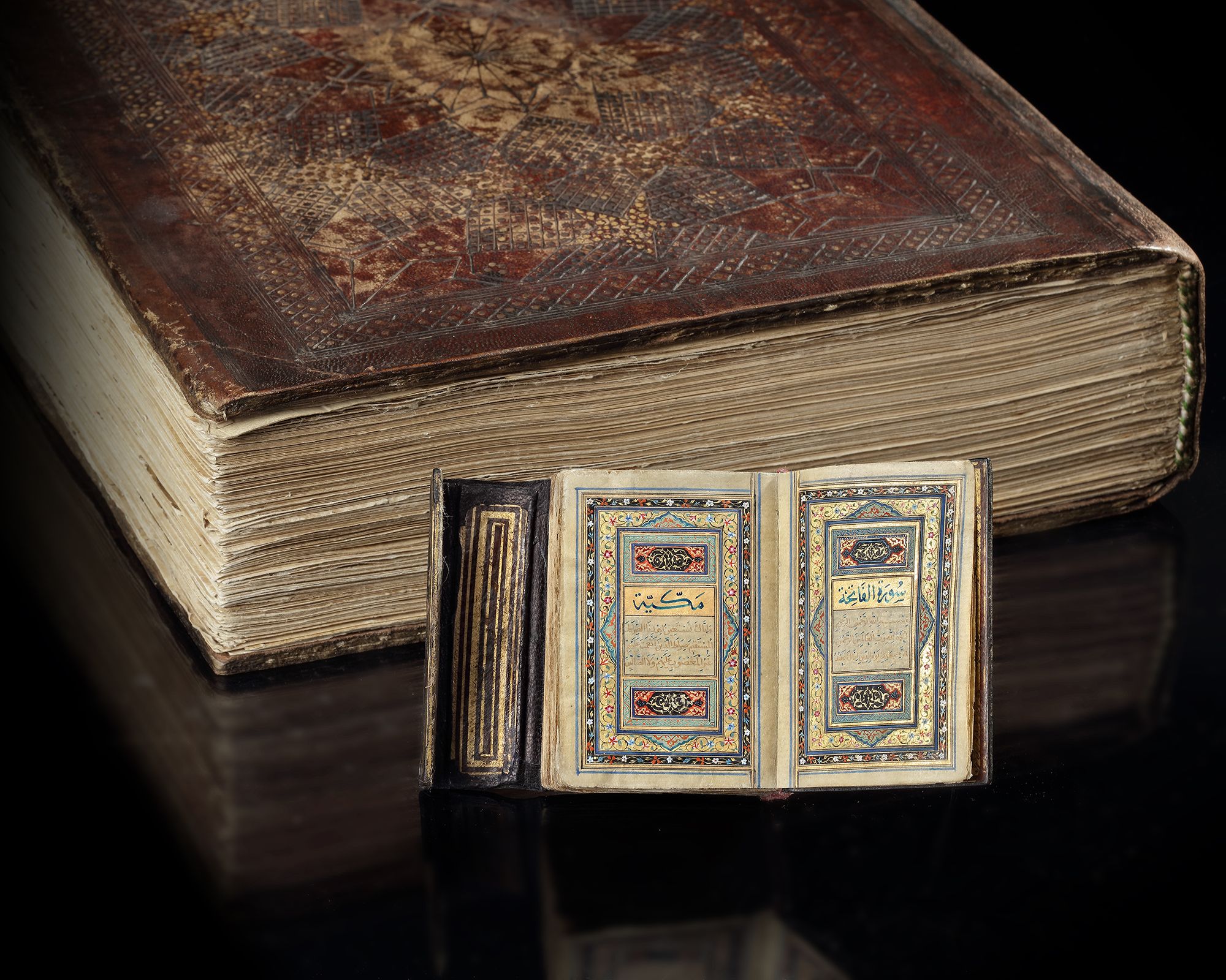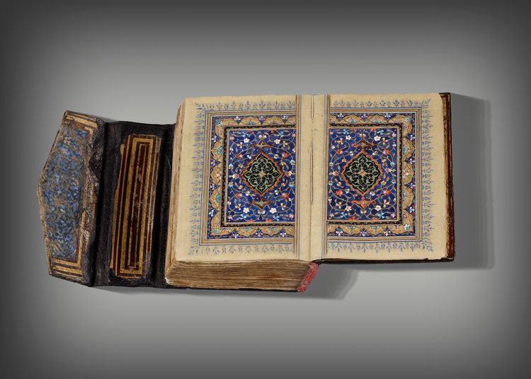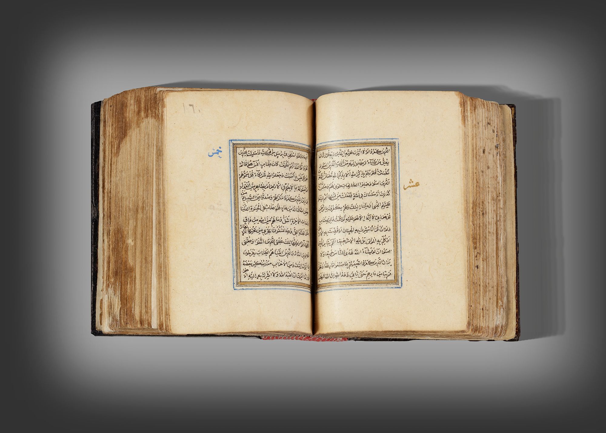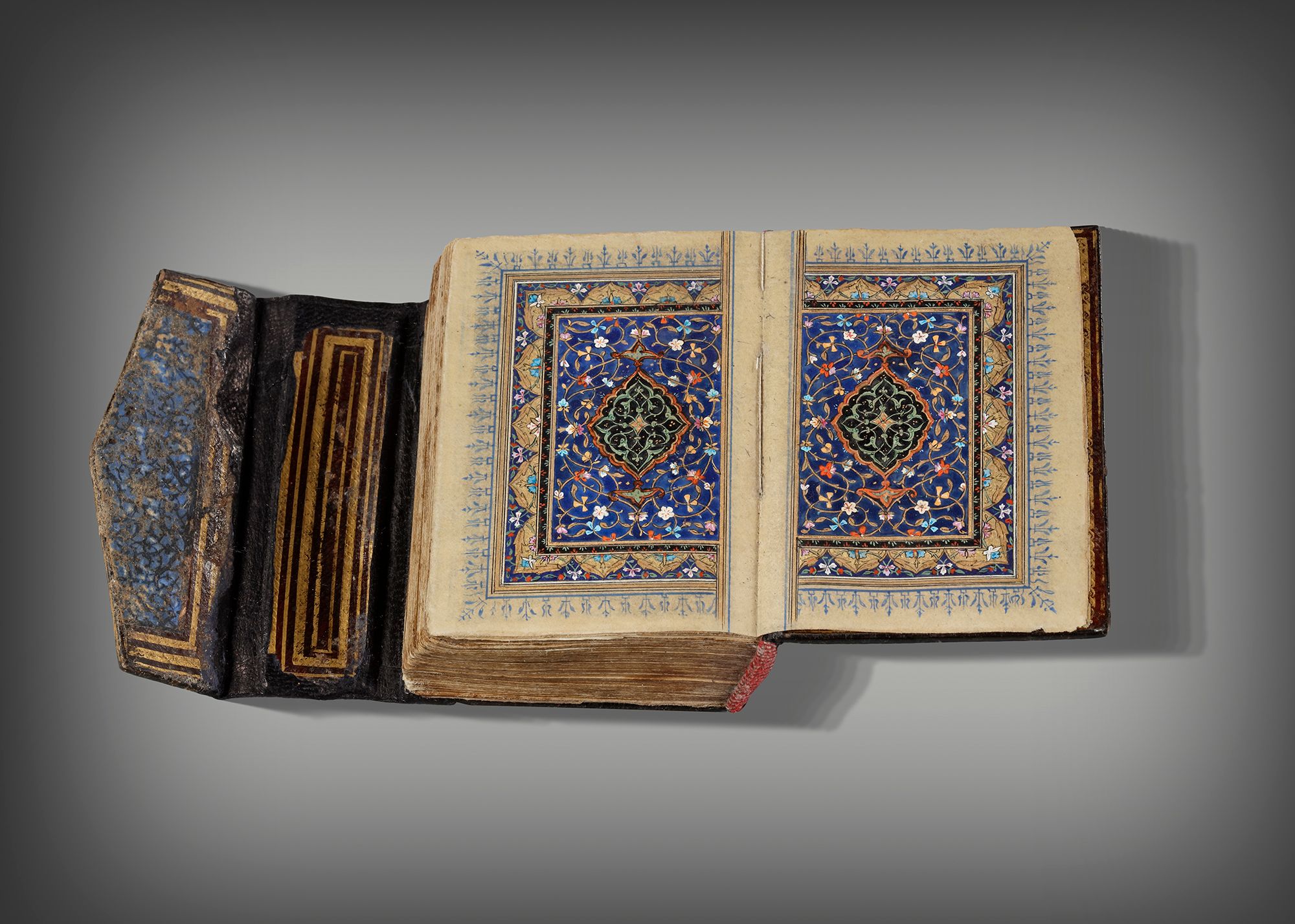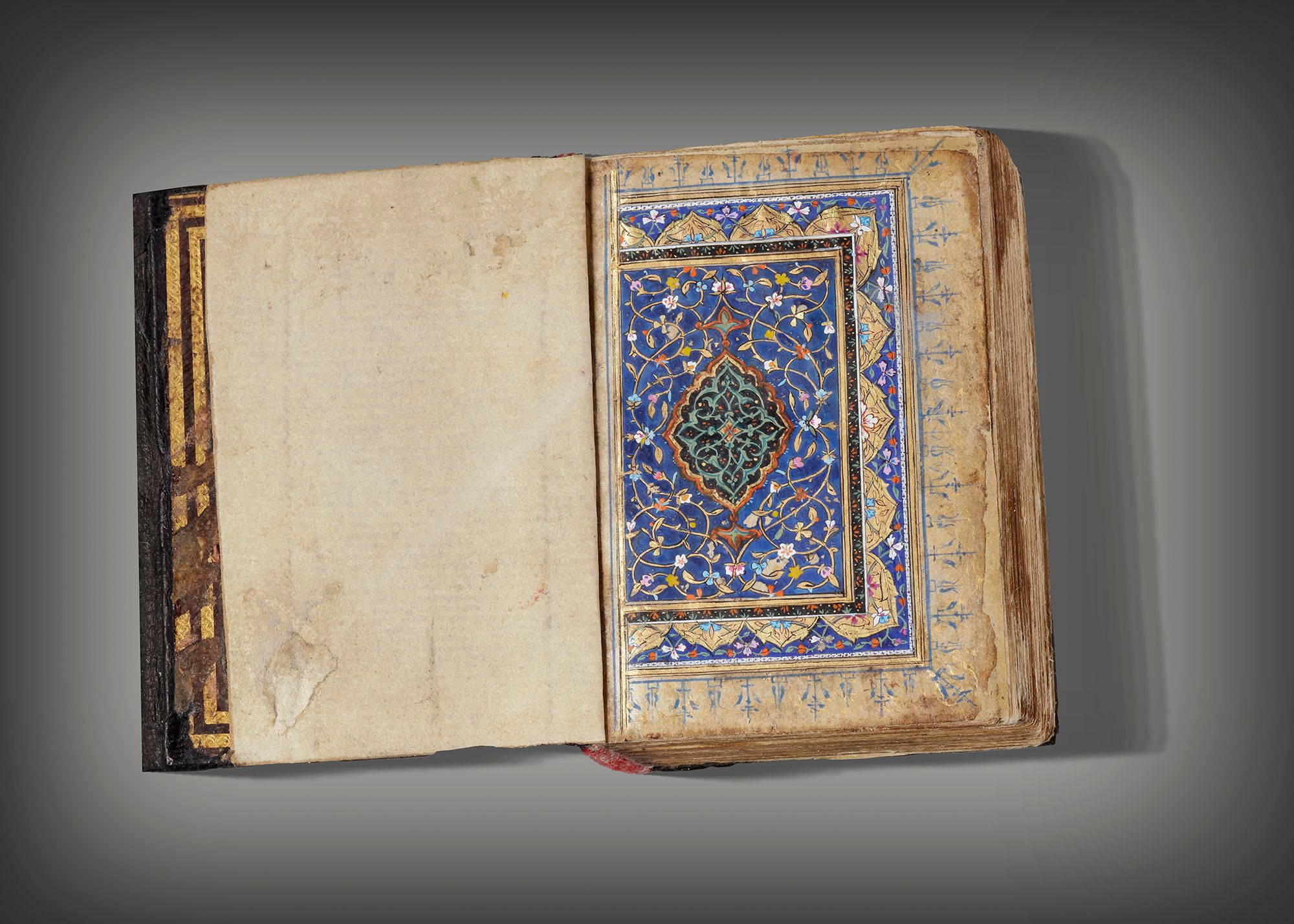 A complete Quran, Arabic manuscript on cream paper, each page with 12 lines written in black naskh script within gold and blue rules. Surah headings in gold and blue thuluth script marginal occasional notes of khums and ashore in gold and blue. Two opening biofolia heavily with gilt and polychrome decoration framing 3 lines of gold naskh script with tajwid in blue. Final folio with a prayer for completion of the recitation of the Quran (Due- al-Khatm) and dated Dhu al-Hijjah 945 AH.