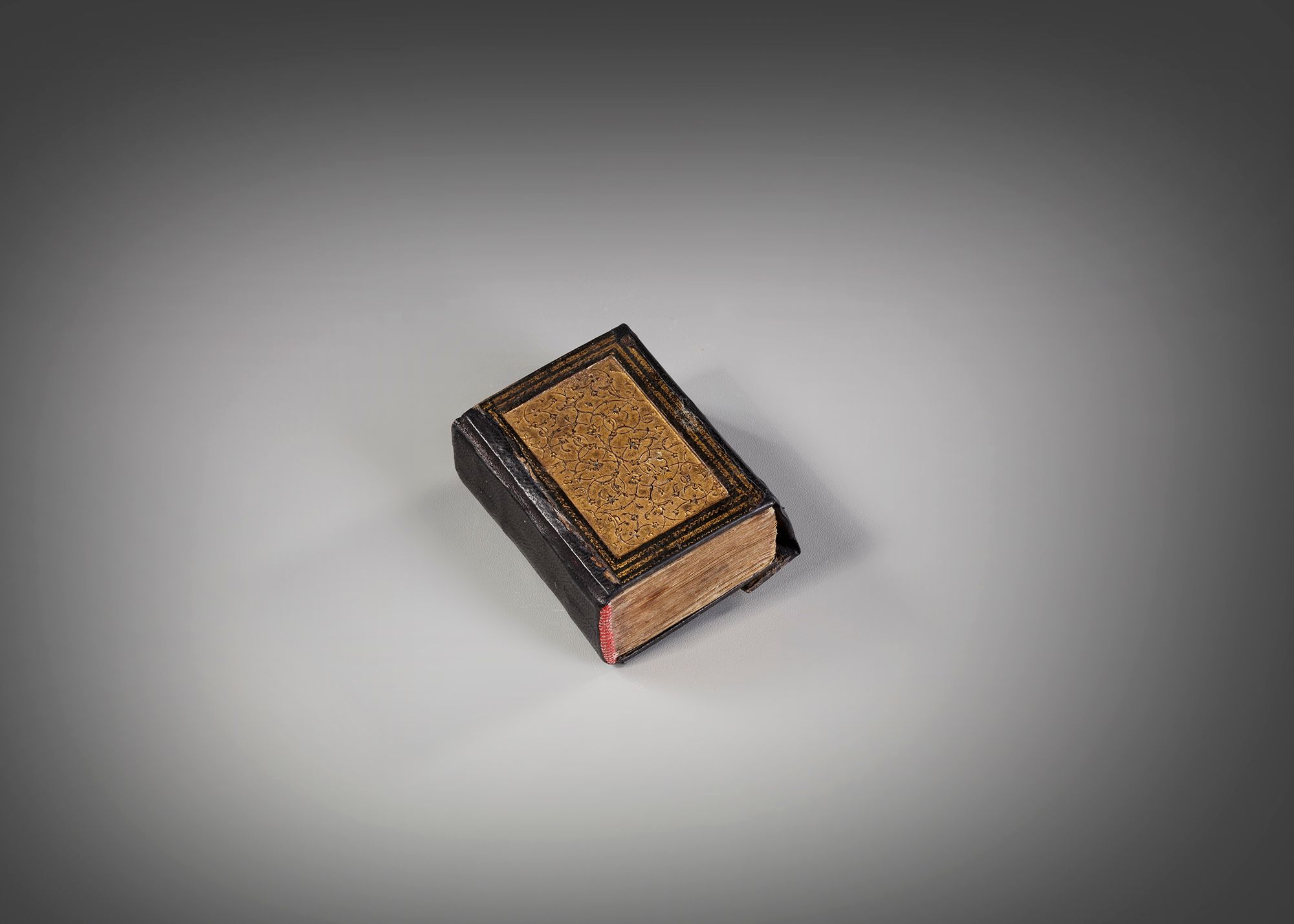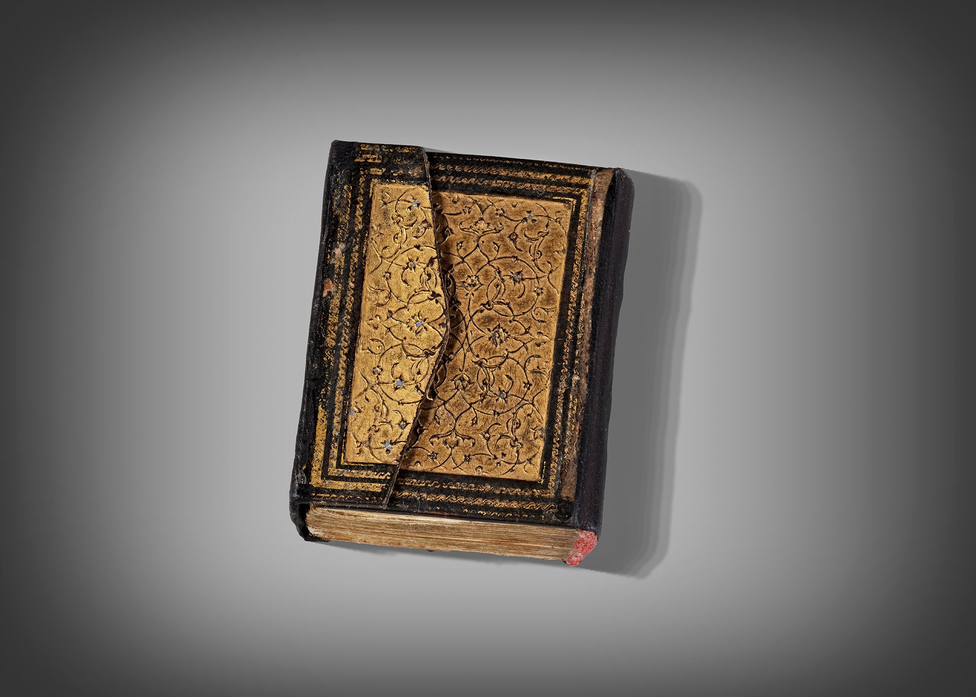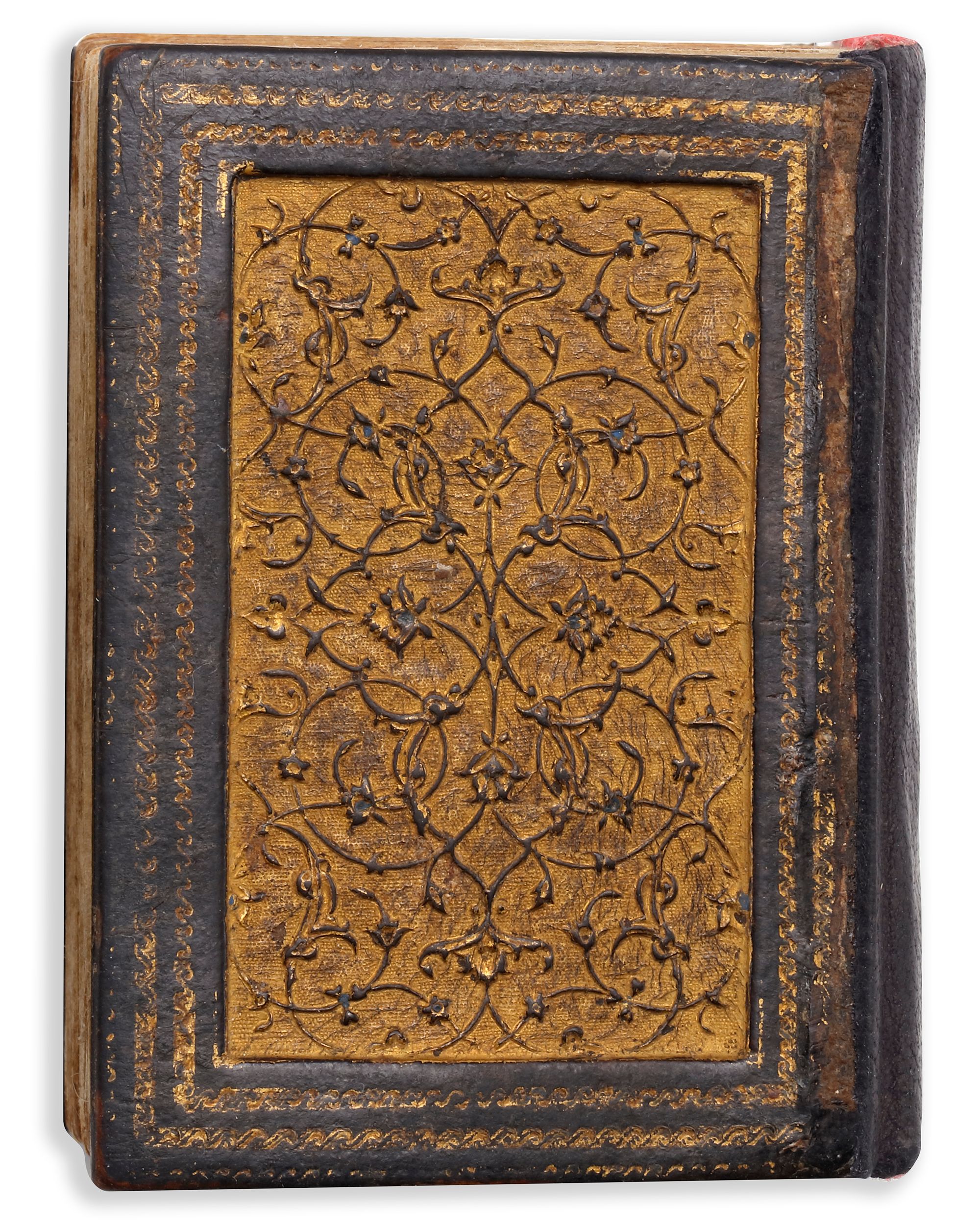 In brown morocco binding with flap decorated with gilt floral motifs.