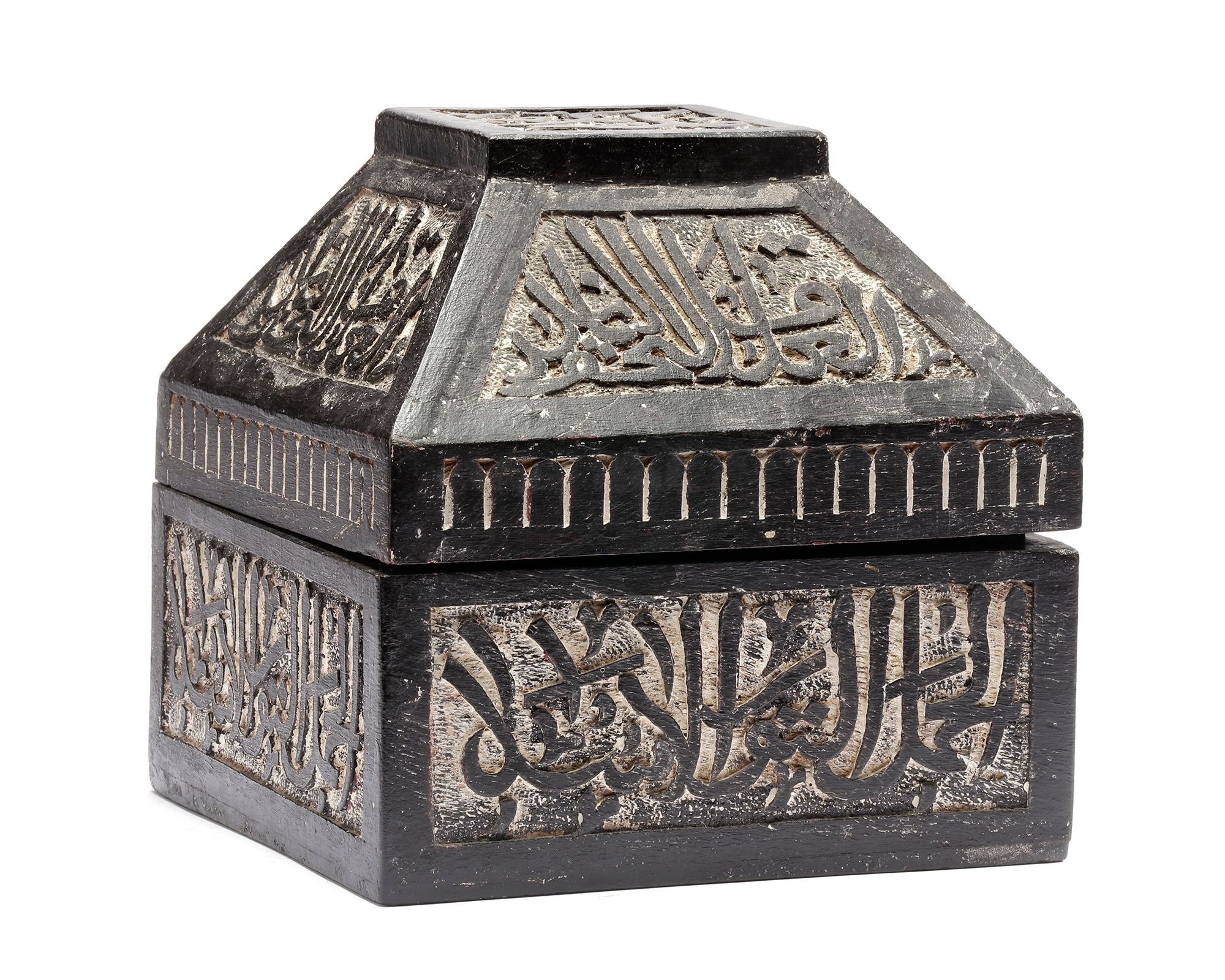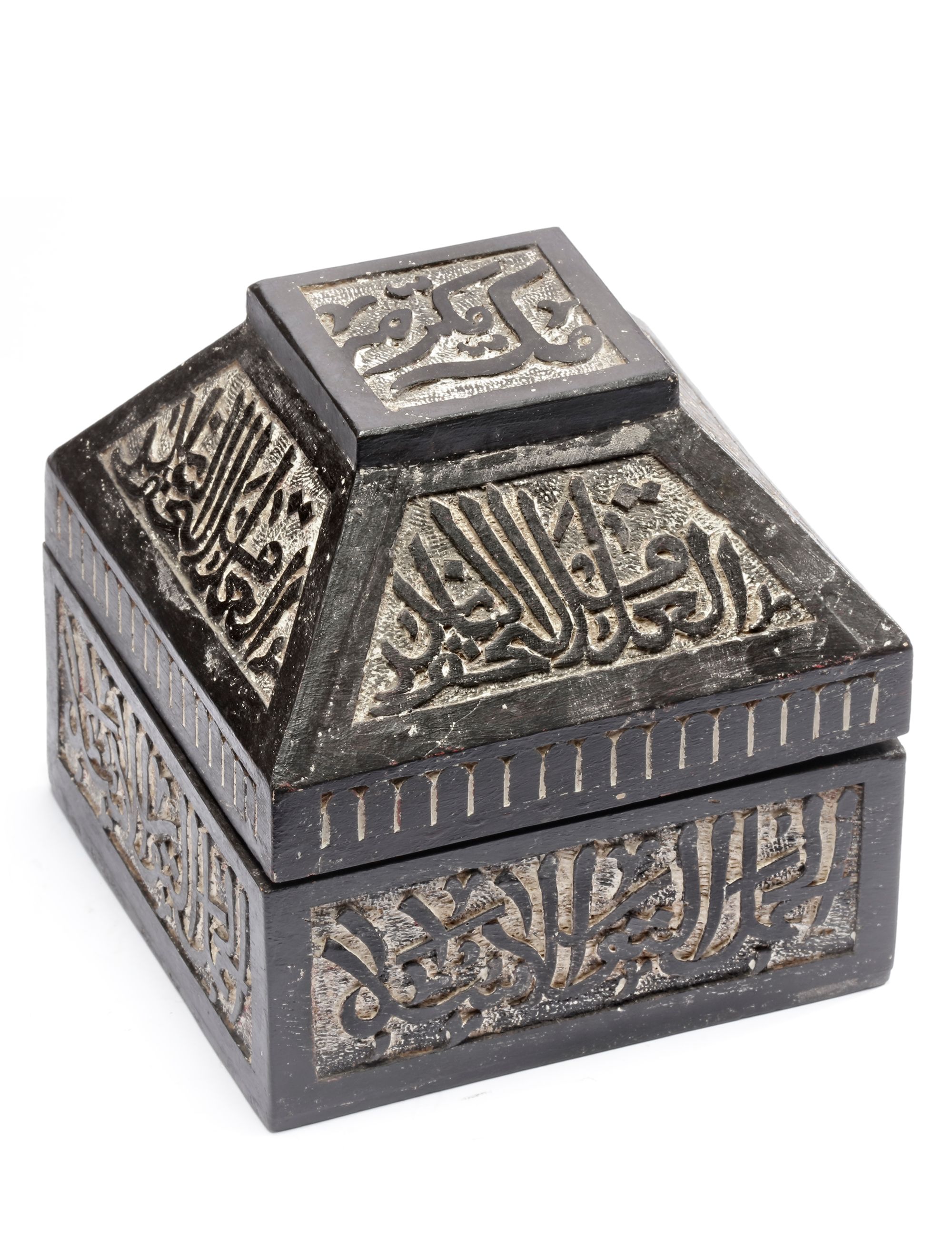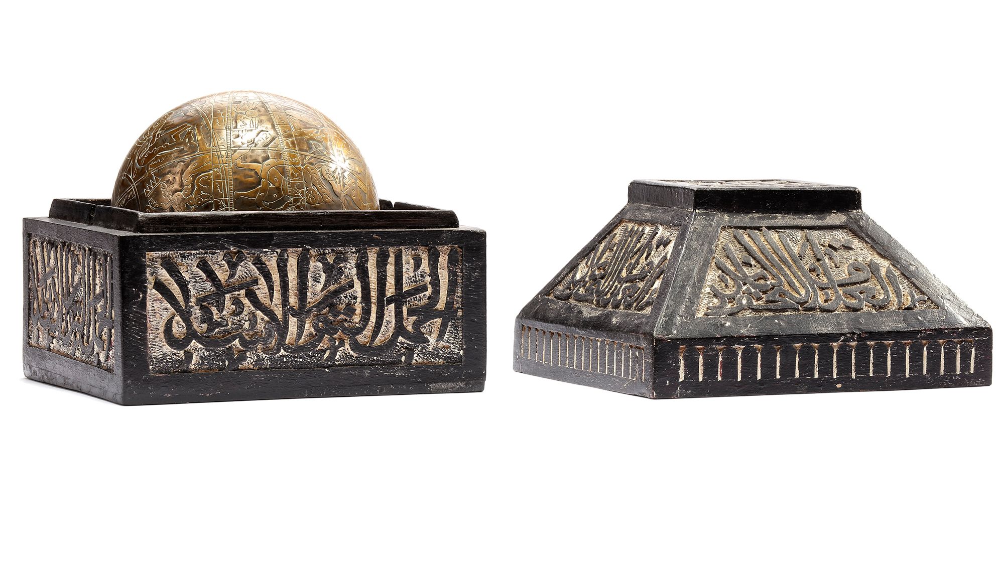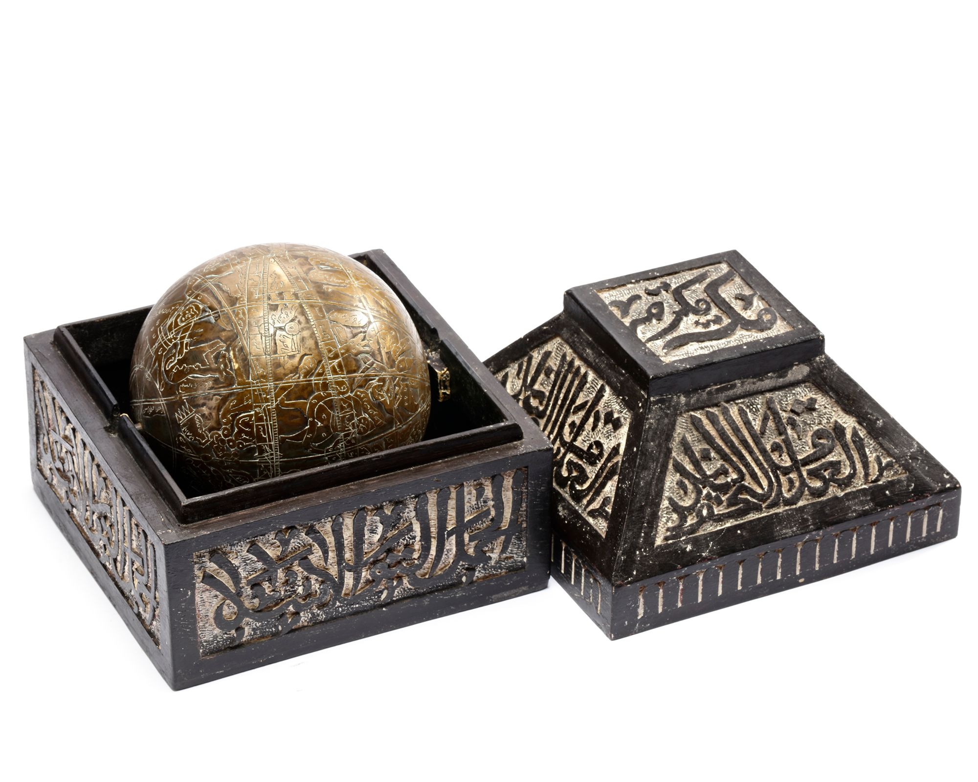 The sphere is apparently cast in one piece, The entire surface highly decorated with incised script, figures and graphical representations of constellations, the lines for the Equator, the Ecliptic and the ecliptic meridians. In a fitted calligraphic engraved wooden box. Diameter: 15 cm Box: 21 by 21 cm