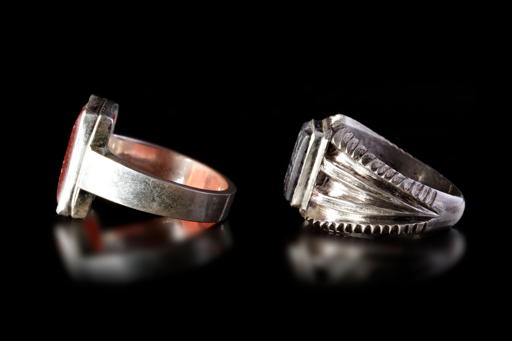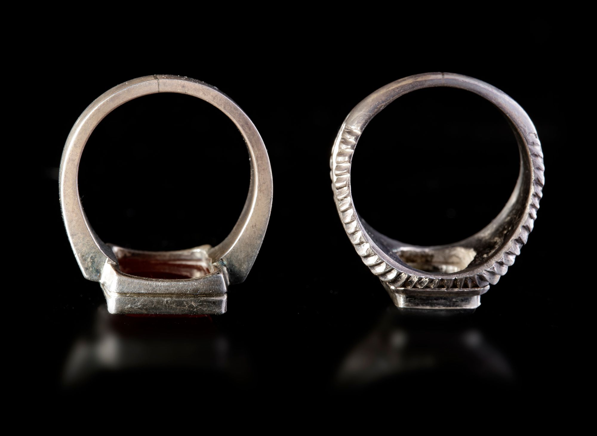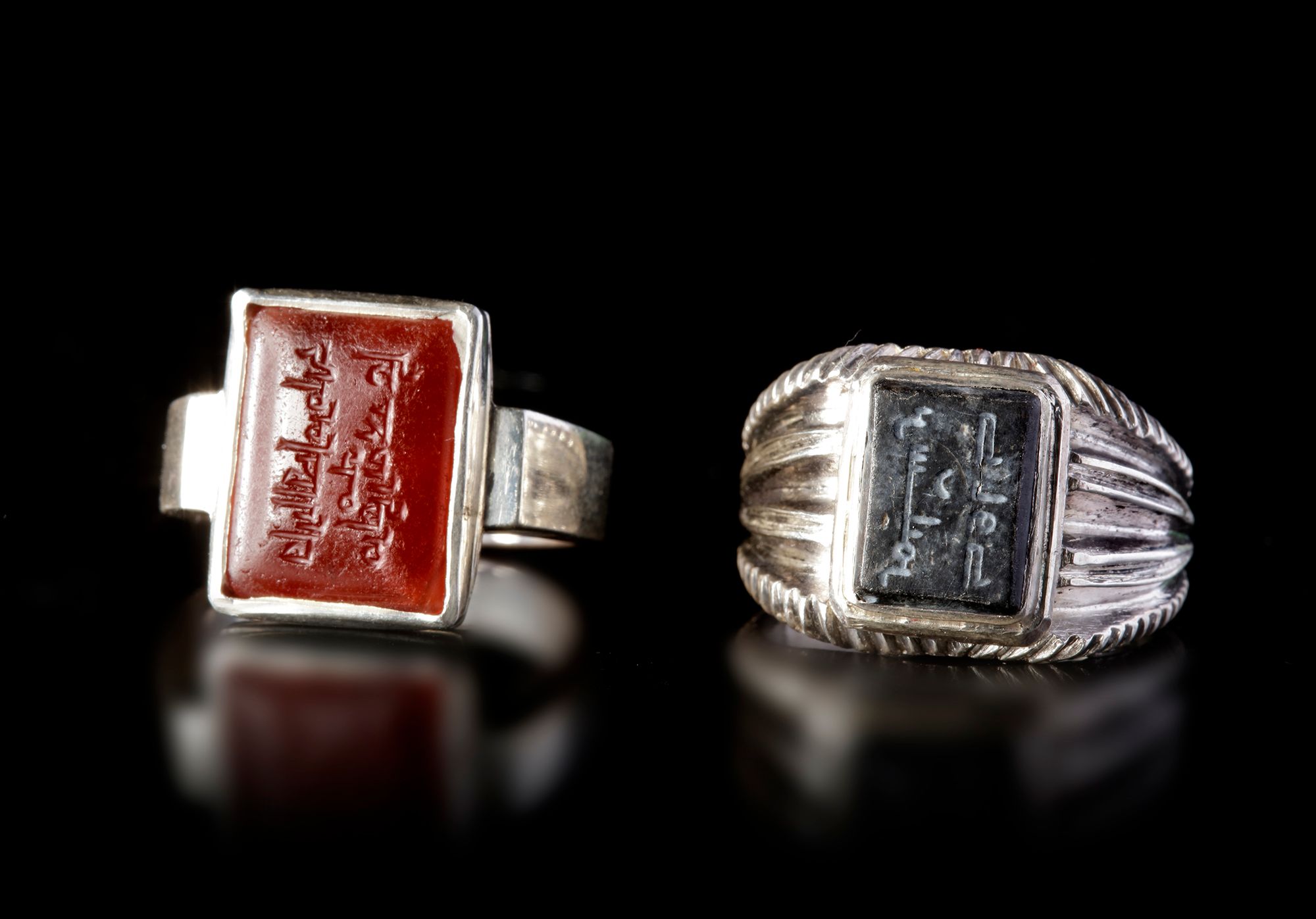 An agate seal of square shape, set in silver ring and engraved with the text " داوود بن سليمان,Daoud bin Suleiman "in kufic script.