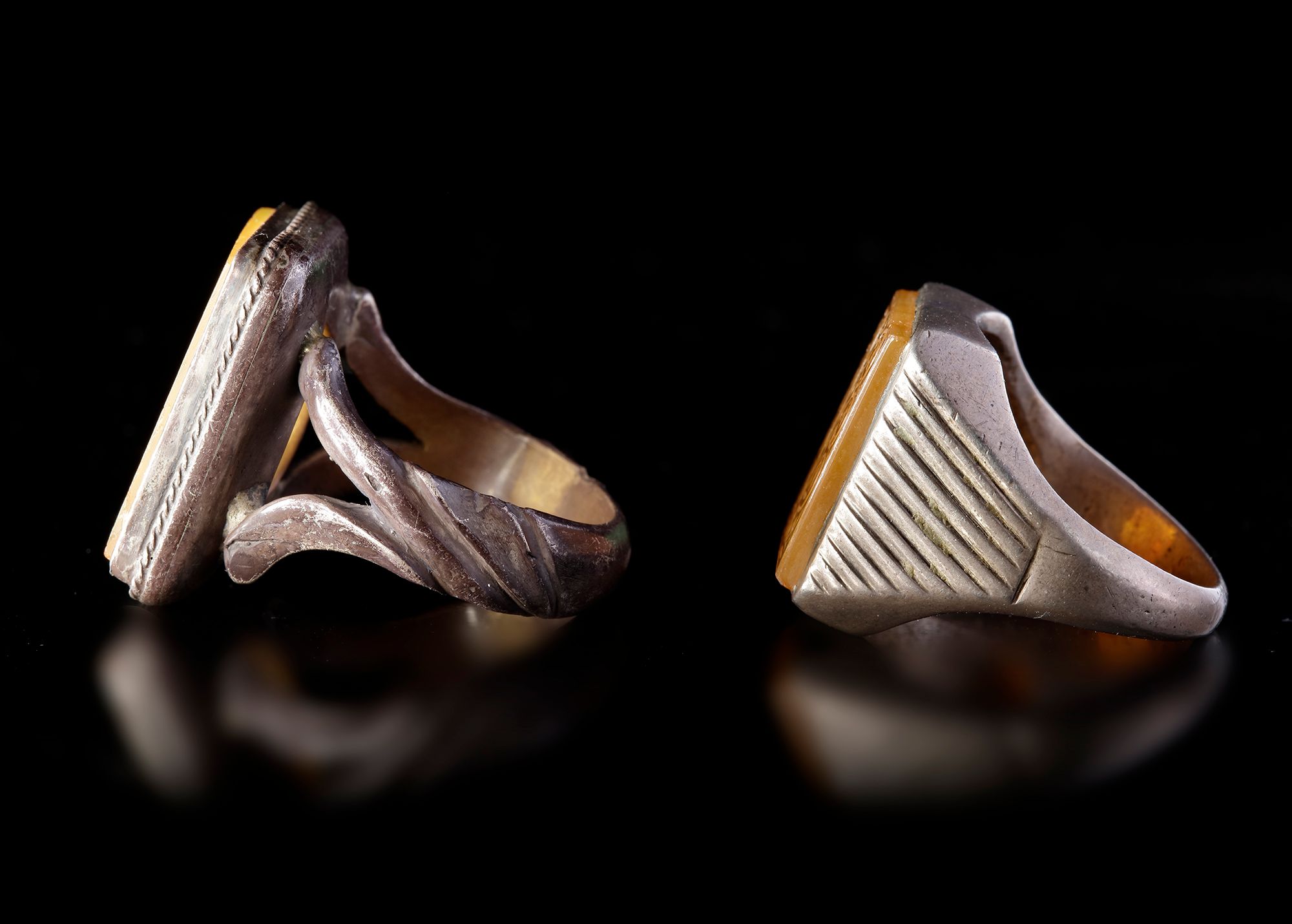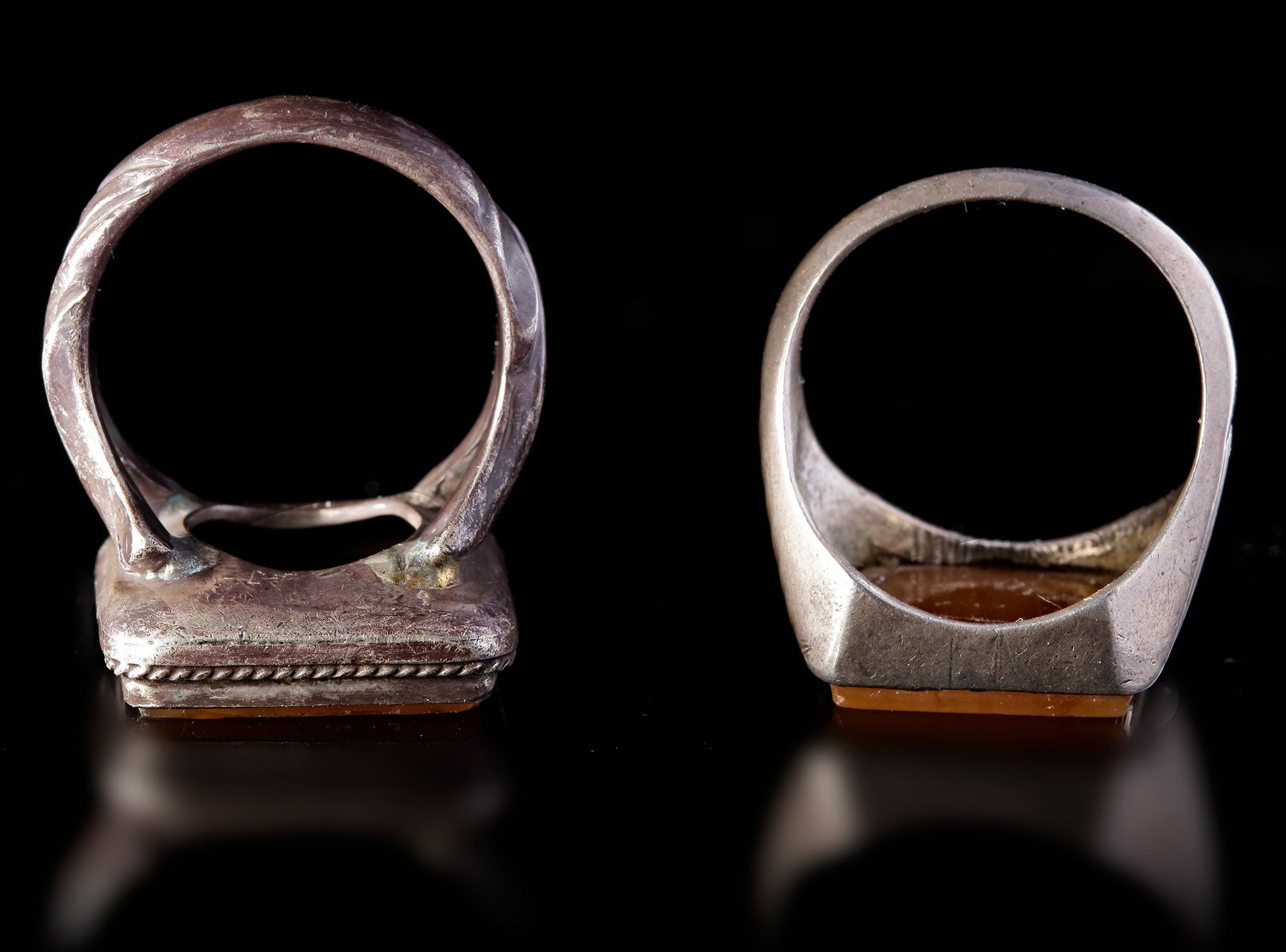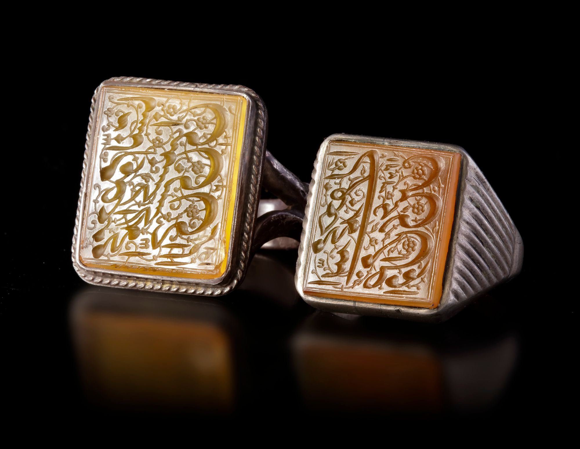 An agate seal of square shape, set in silver ring and engraved with the text " محمد معصوم النساي الراجي الحسني الحسيني, Muhammad Masoum Al-Nasai Al-Raji Al-Hasani Al-Husseini " in nastali'q script.