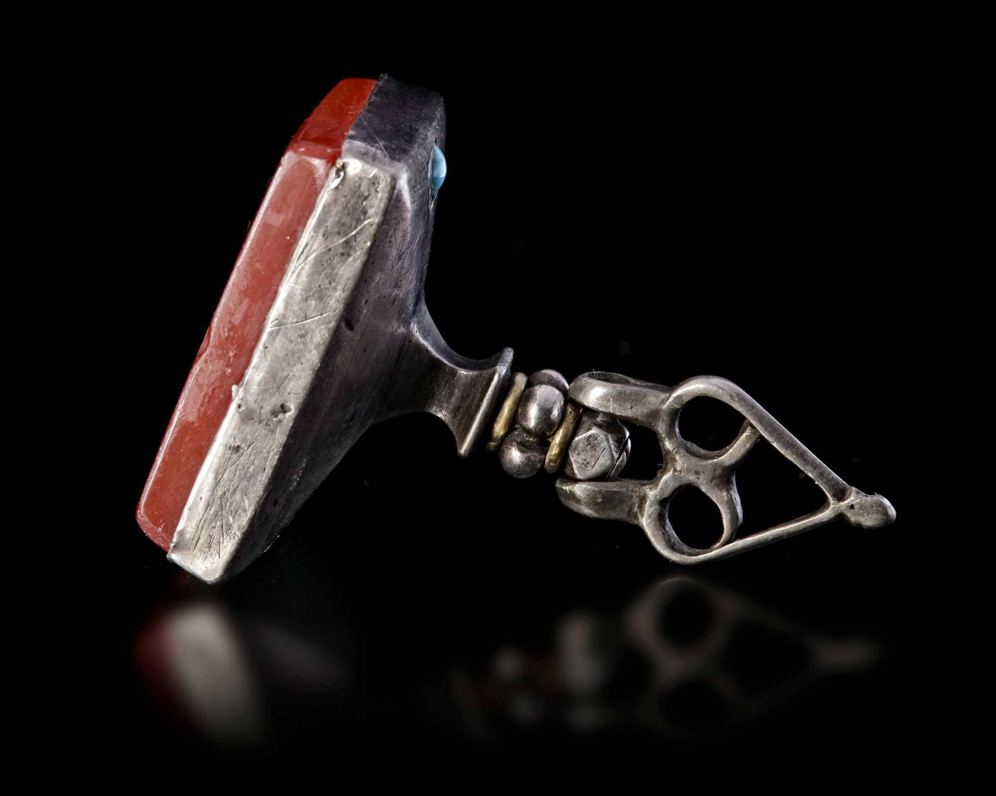 An agate seal of square shape, set in silver ring and engraved with the text "فالله خير حافظا وهو ارحم الراحمين, v.64 from surah al-Saff" in nastali'q script. 13th AH/19th AD century