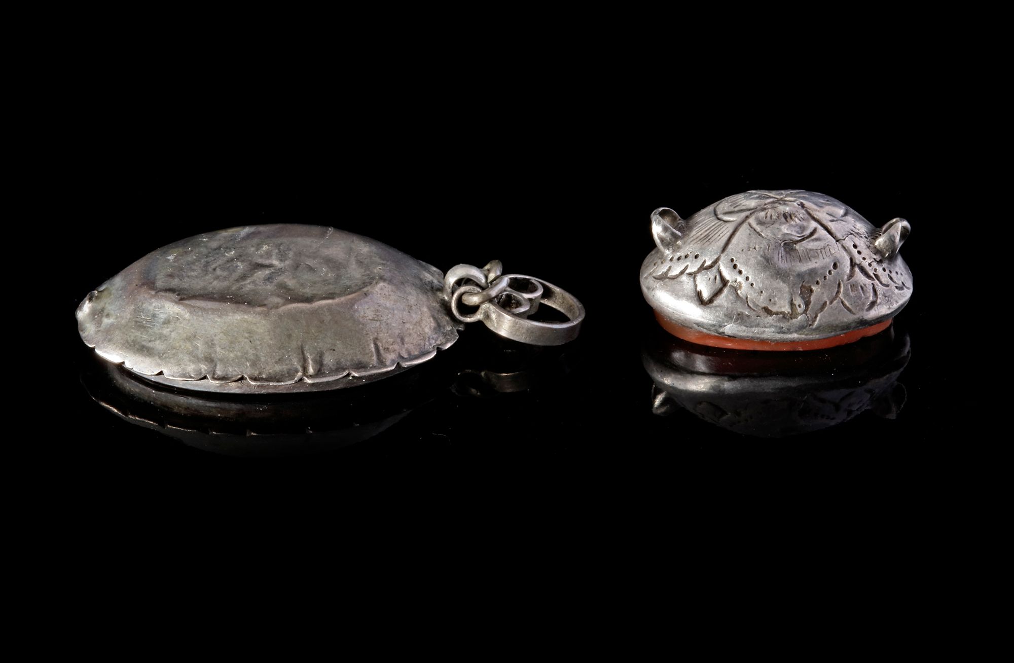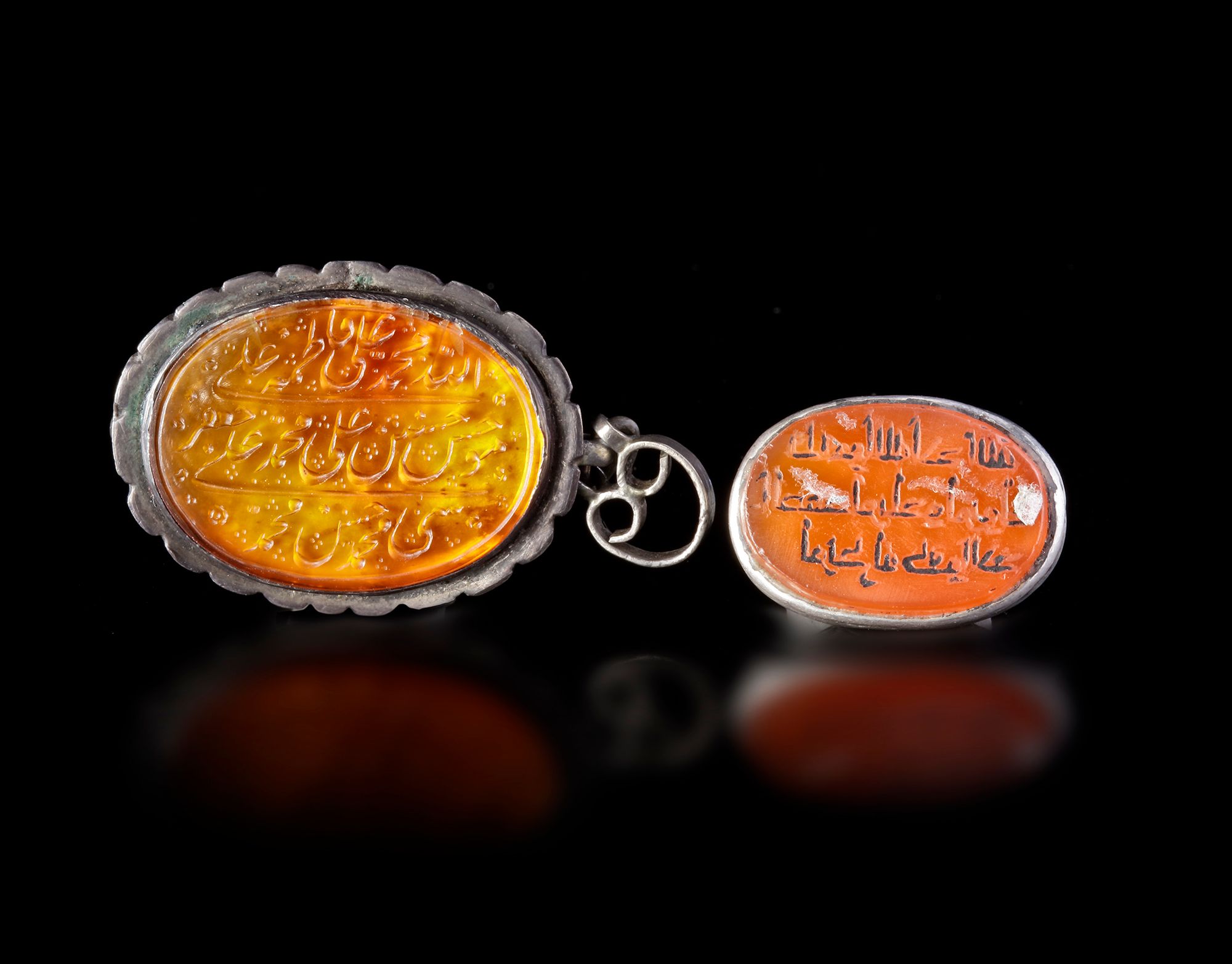 An agate seal of oval shape, set in silver mounting and engraved with the text "الله وأسماء الأئمة, Allah and the names of the imams" in nastali'q script.
