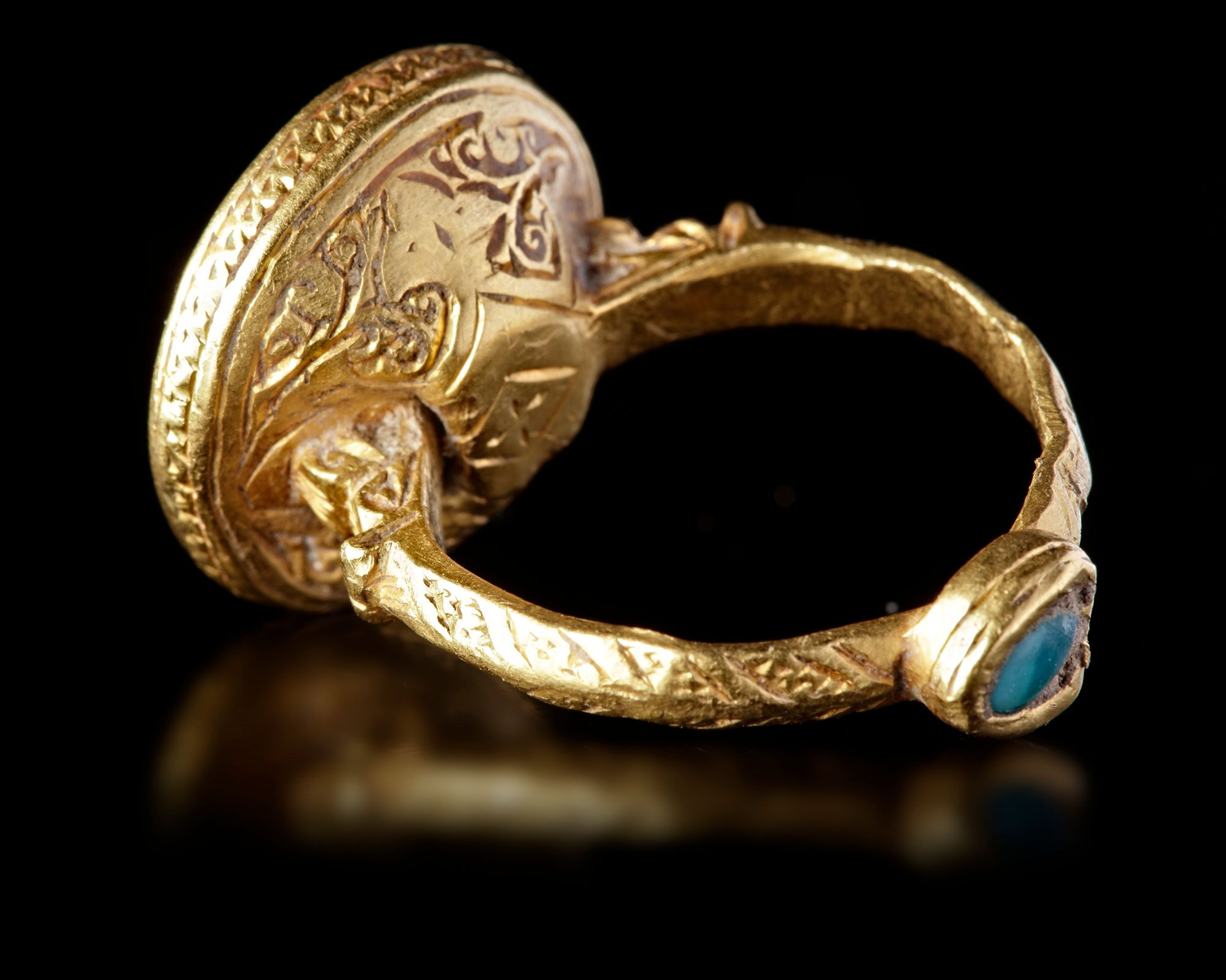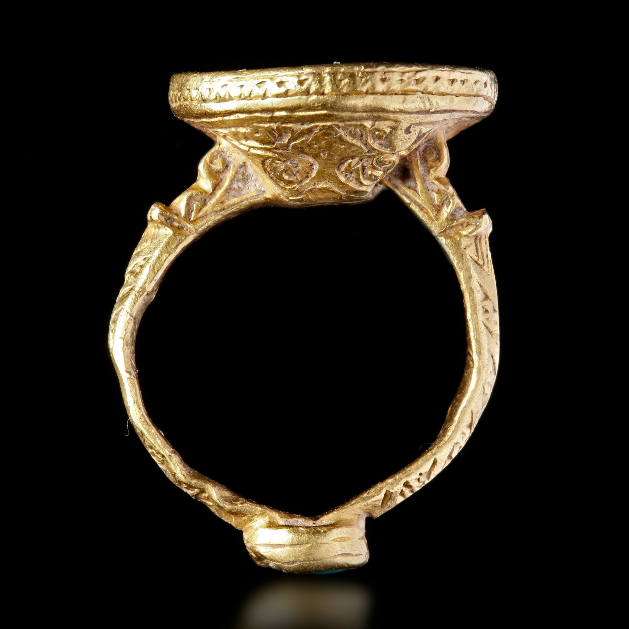 A gold ring with circular top engraved with the text "عمر جان شاه خان, Omar Jan Shah Khan"in nastaliq script. 9th AH/15th AD century