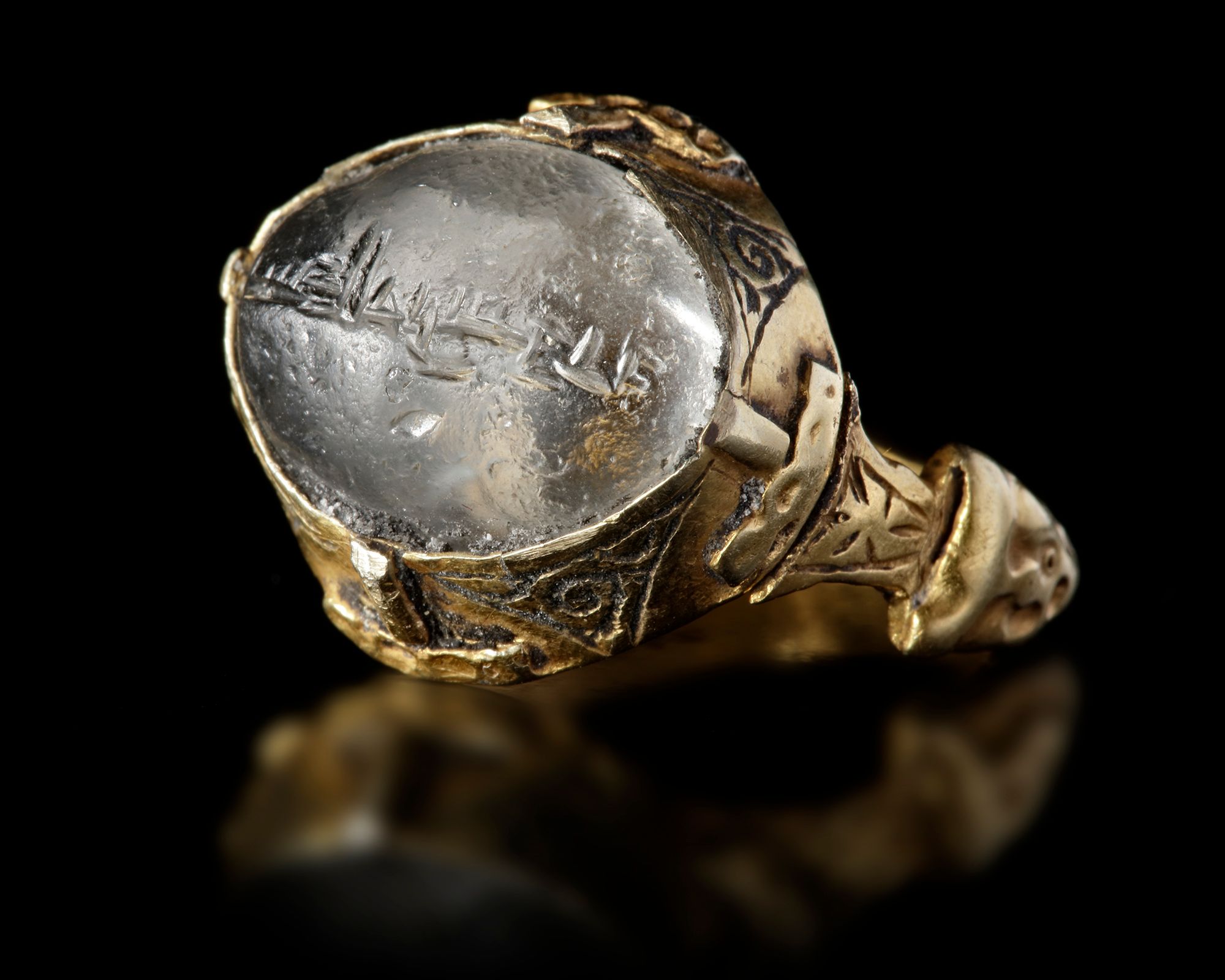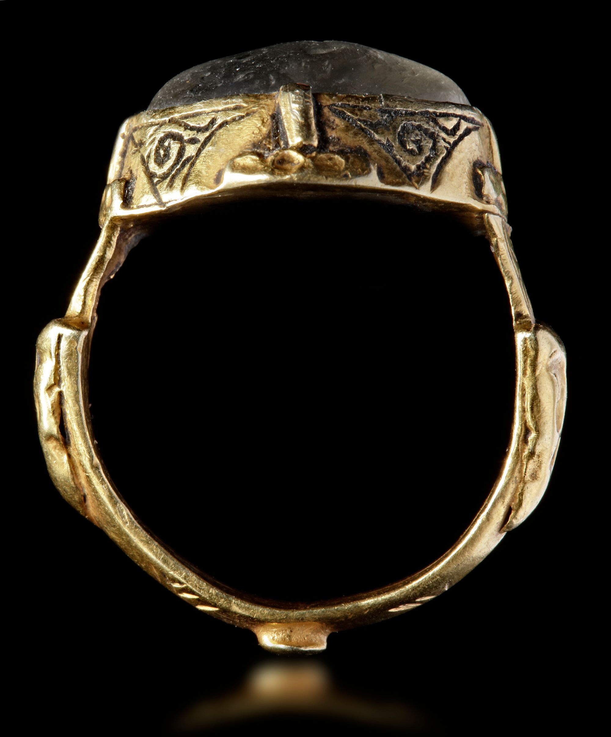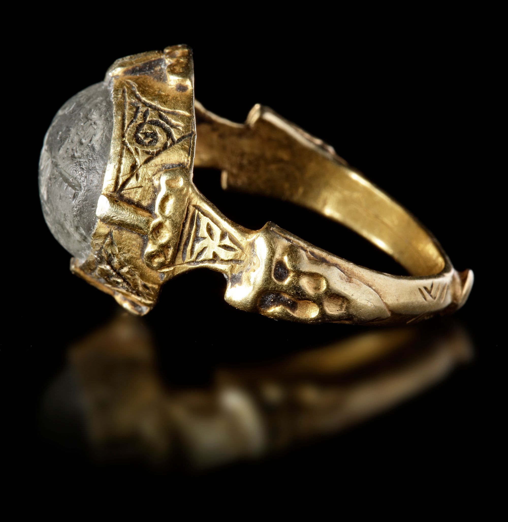 A crystal seal of rounded shape, set in gold ring and engraved with the text "هذال بن سدرة, Hazal bin Sidra "in kufic script.