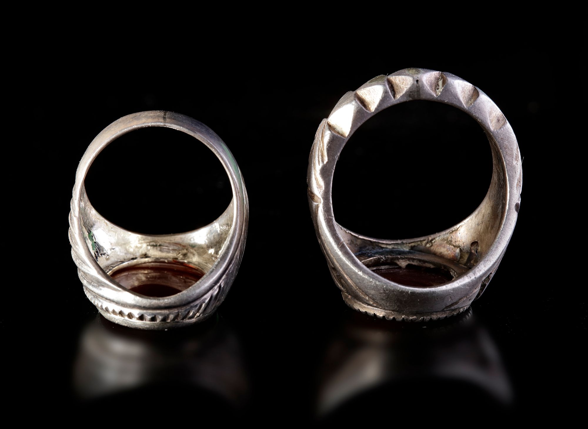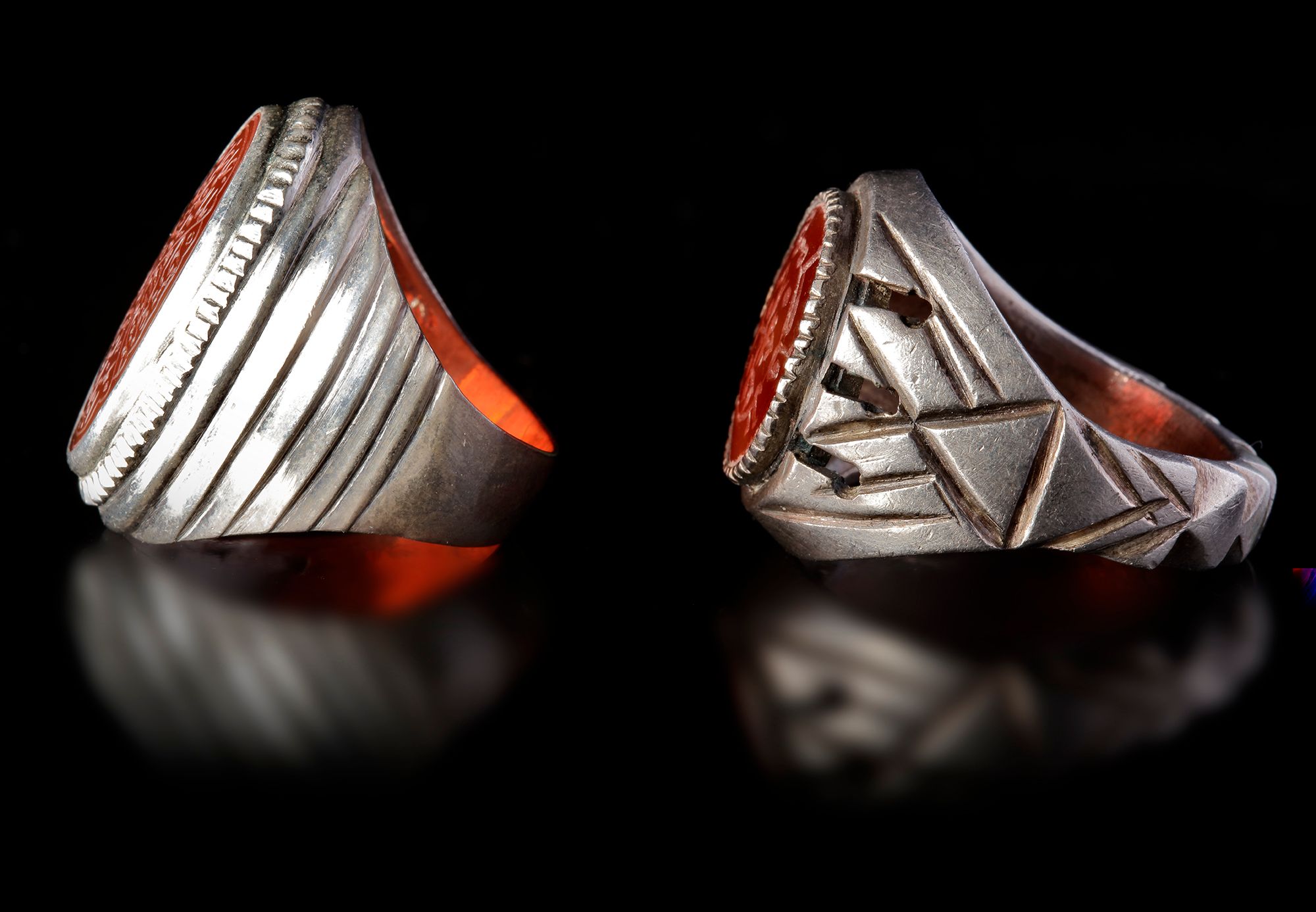 An agate seal of circular  shape, set in silver ring engraved with the text "محمد علي فاطمة حسن وحسين,Muhammad Ali Fatima Hassan and Hussein" in Kufic script.