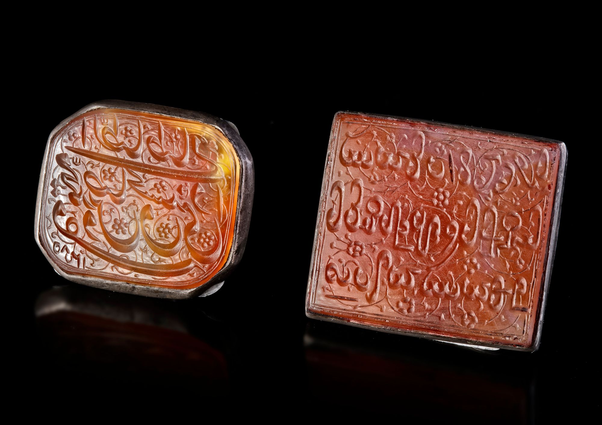 An agate seal of square shape, set in silver and engraved with the text " محمد صادق الحسني الطناطنائي, Muhammad Sadiq Al-Hasani Al-Tanatani "in nastali'q script.