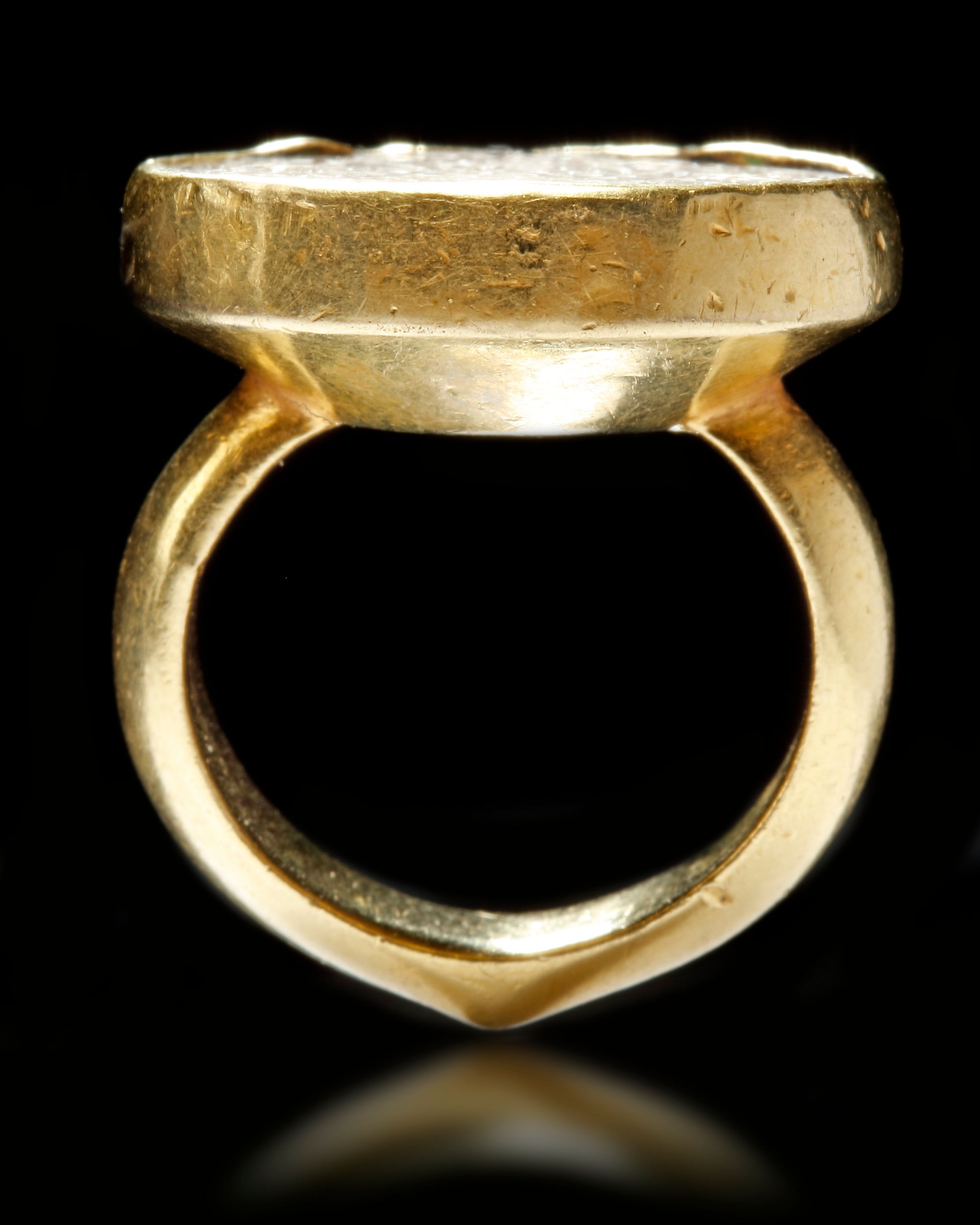 A crystal seal set in gold ring engraved with the text "حضرت غلام جولي شاه علي محمد حسن علي محمد حسين علي محمد حسن علي جعفر موسي,