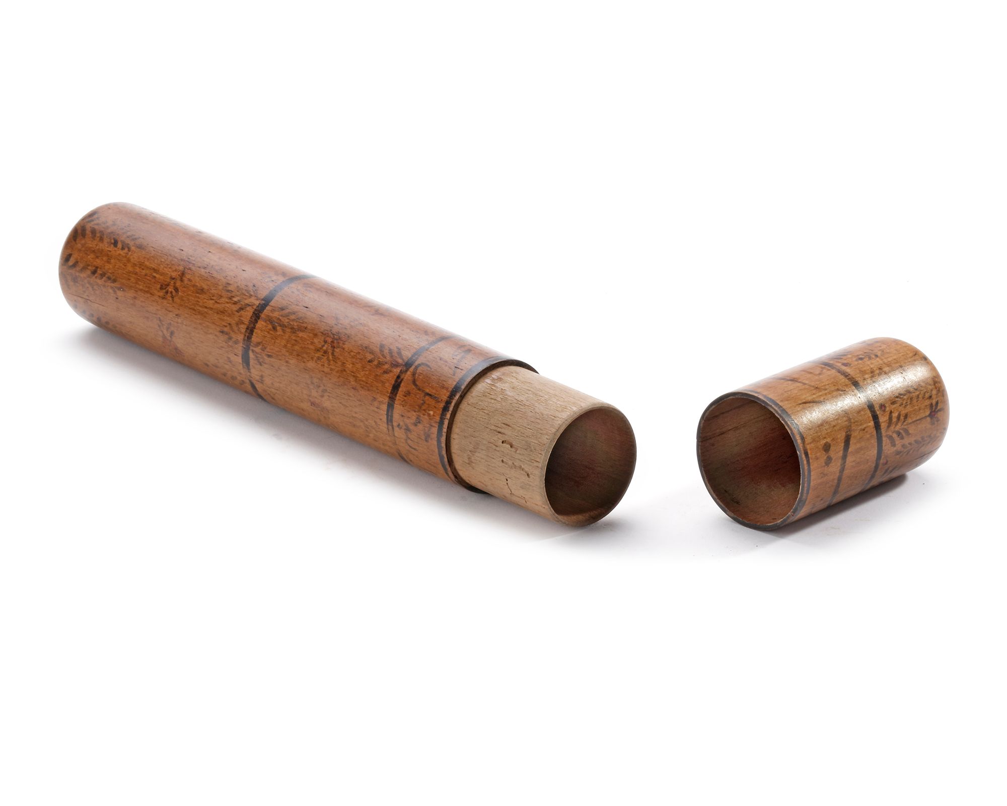 A cylindrical scroll case made of wood and stylized with inscripitions of al-Basmallah and a Hadith in a black thuluth script. 30 cm.