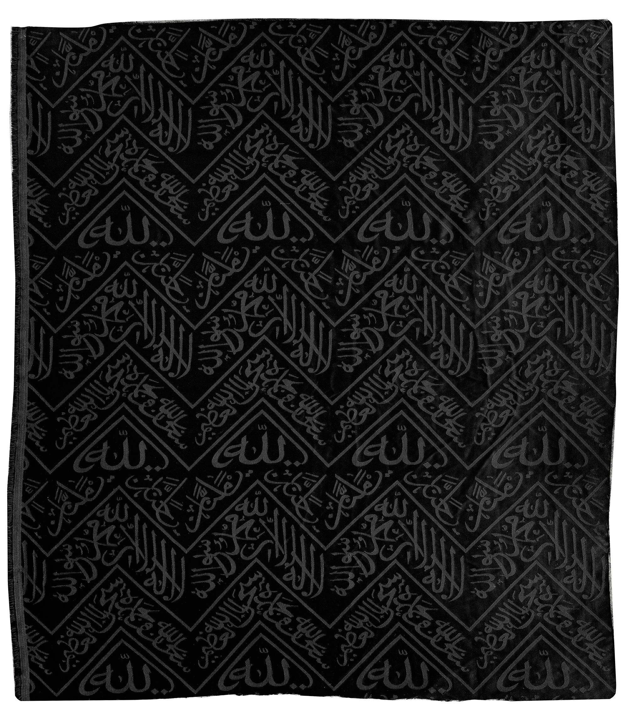 A fragment of the inner curtain of sacred kiswa for the inner wall of the Kabaa with an inscribed weave in silver-colored silk over a dark black ground. Embellished with undulating bands running from the beginning to the end of the cloth enclosing different inscriptions. The inscriptions: -The prominent inscription of 'Takbir, Allahu akbar'. -Kalimaat al-Tawhid, 'There is no God but Allah and Muhammad is his Prophet'. -‘I gratefully declare and believe Allah to be devoid of any deficiencies, I declare and believe the Omnipotent Allah is free of every defect’. 161 by 144 cm.