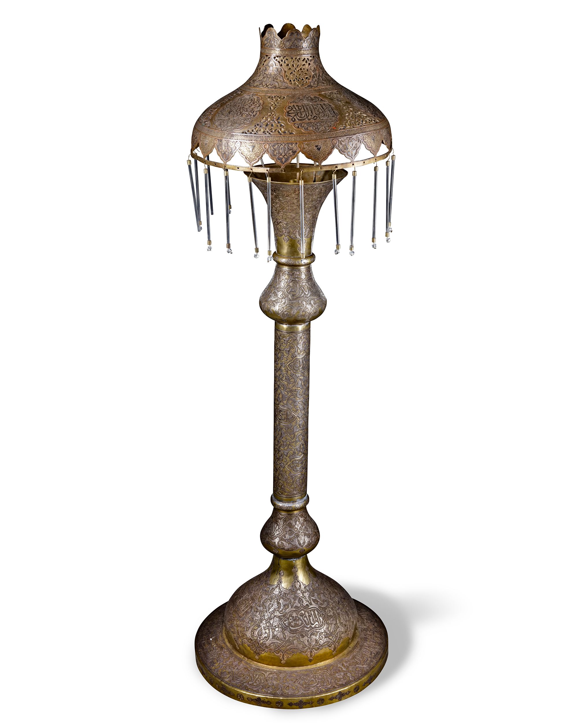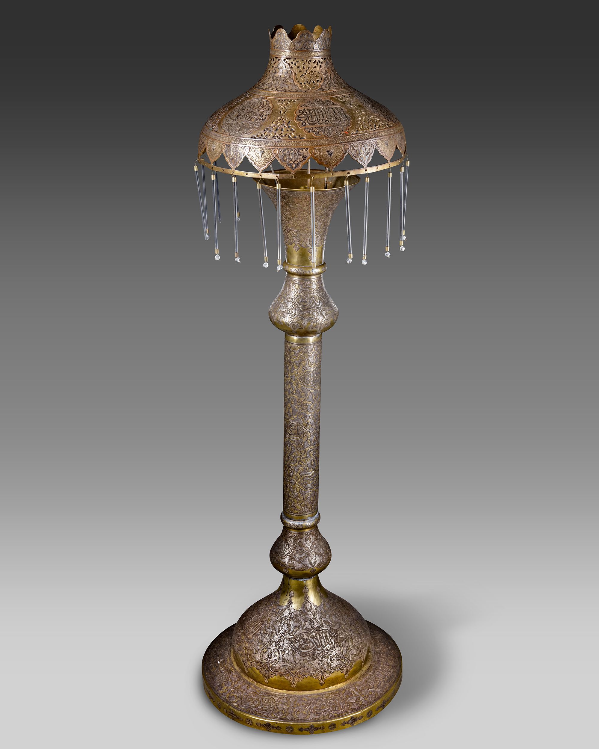 The lamp and the lamp shades decorated with scrolling foliage and Arabic inscriptions.