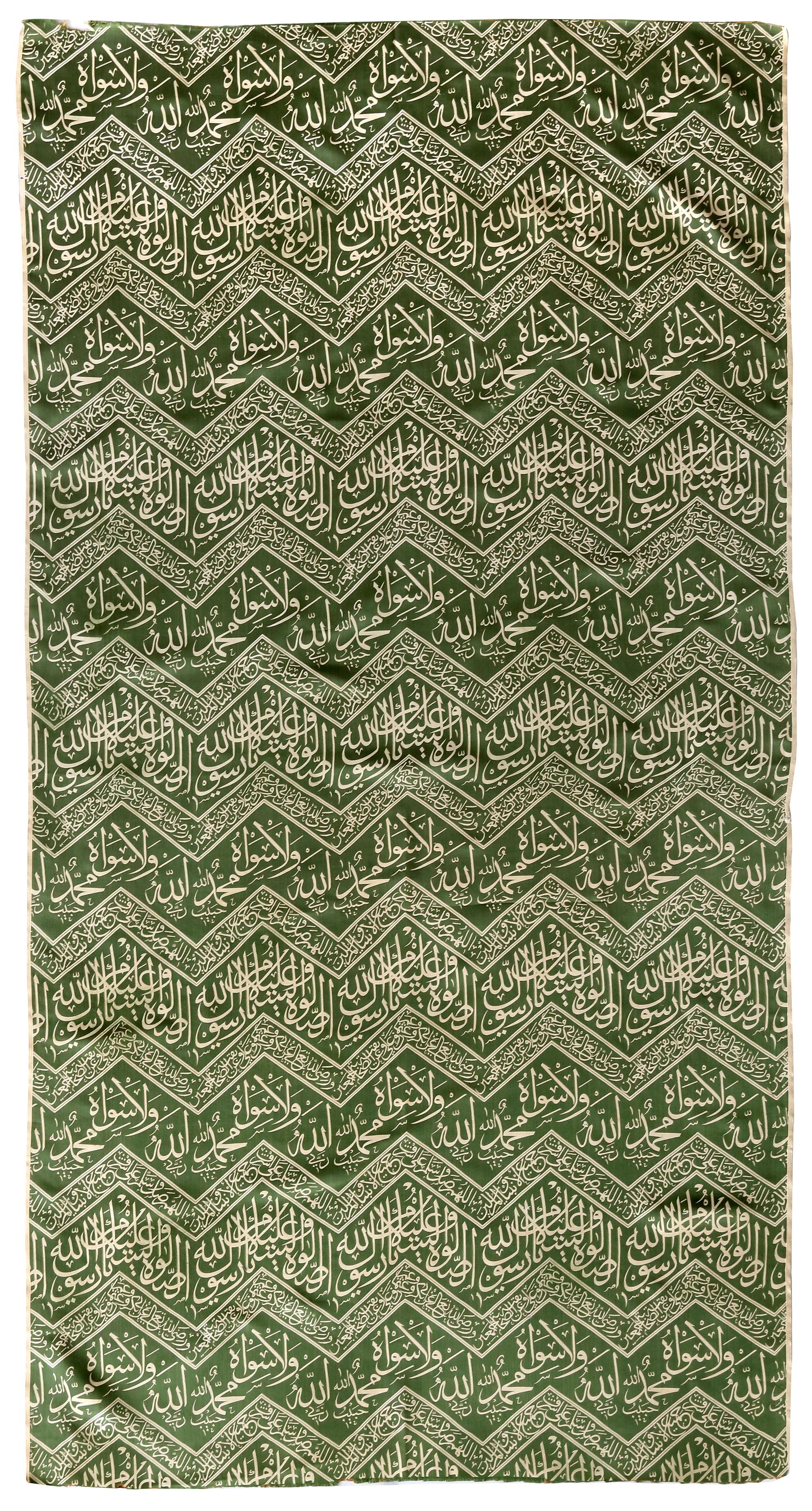 A fragment of hanging panel of the inner kiswa, with an inscribed weave in cream color over a light green silk ground. Embellished with a prominent inscription within a broad border in thuluth script of praise of the prophet ‘Prayer and peace be upon you, O Messenger of Allah’. Below with a narrow band containing prayers for the four righteous caliphs Abu Bakr, ‘Umar, ‘Uthman and ‘Ali as well as for the companions of the Prophet. At the top with a narrow band enclosing ‘O Allah, bless the Prophet Muhammad, the Seal of Prophets and Messengers’.