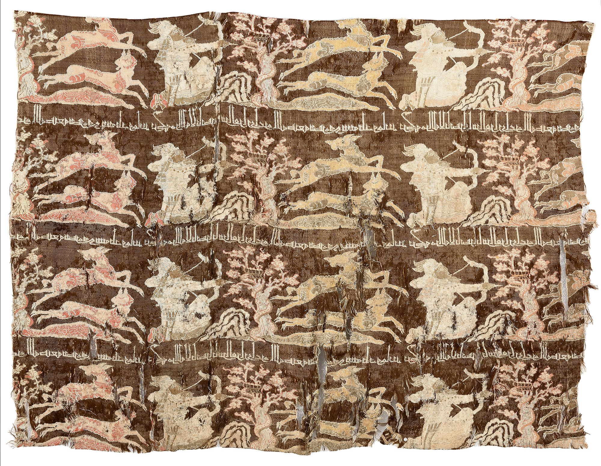 Of rectangular form, embroidered on a brown silk ground with four repetitieve bands of a figure with a bow throwing an arrow at deer in a hunting scene, below with Arabic inscriptions in kufic script.