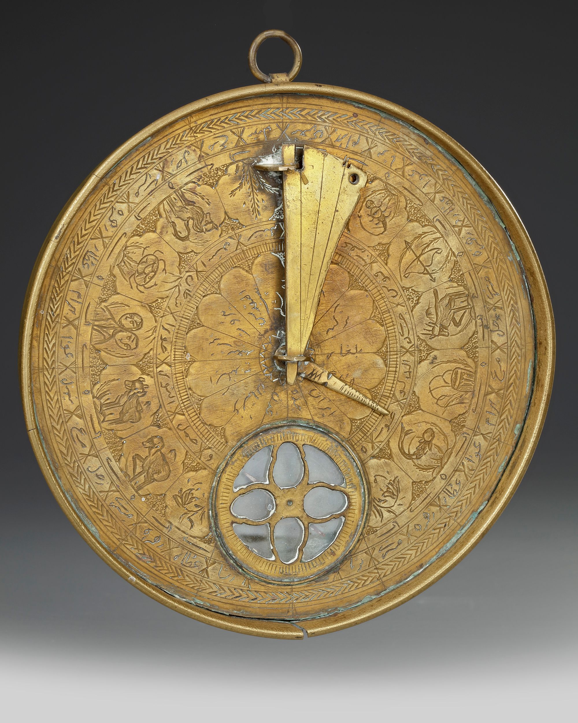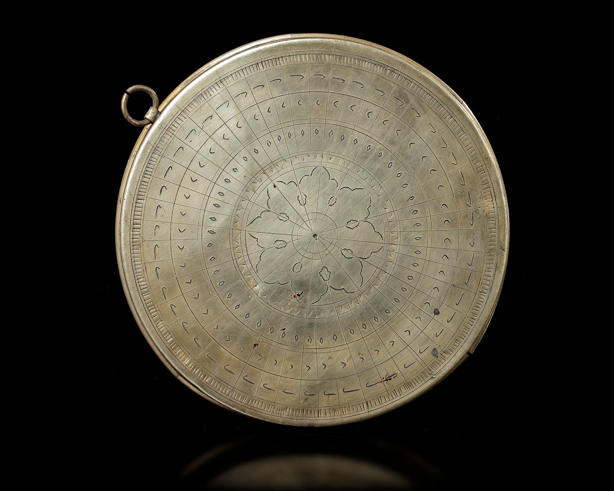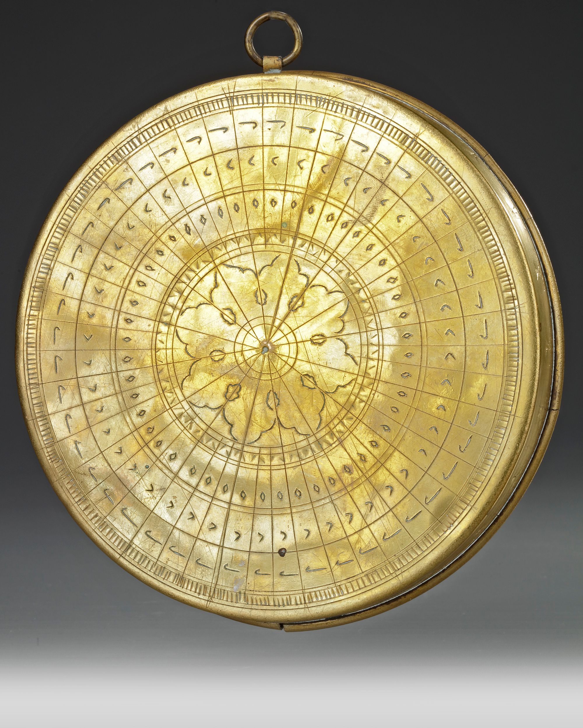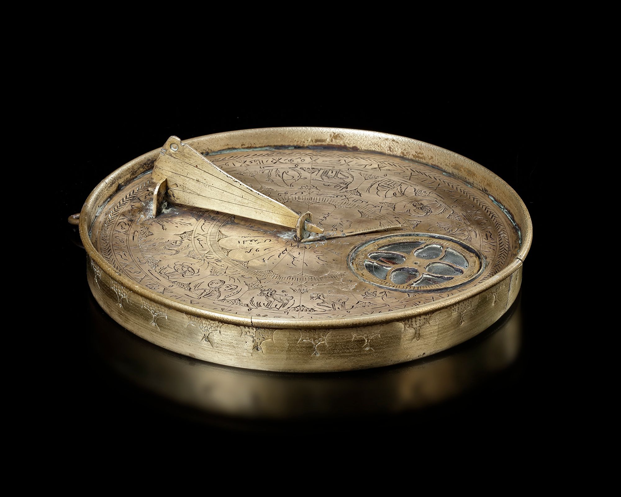The lid opening, the face engraved with astrological signs.Folding engraved string with engraved tables on underside and face. To use the sundial one first needs to set the instrument on a flat surface and rotate it until the needle on the compass is correctly aligned in a north-south direction. When the metal pin is due north then the string is properly aligned towards the north-pole and the sundial will indicate the correct time – but only for the latitude for which it was constructed. 14.5 by 2.2 cm
