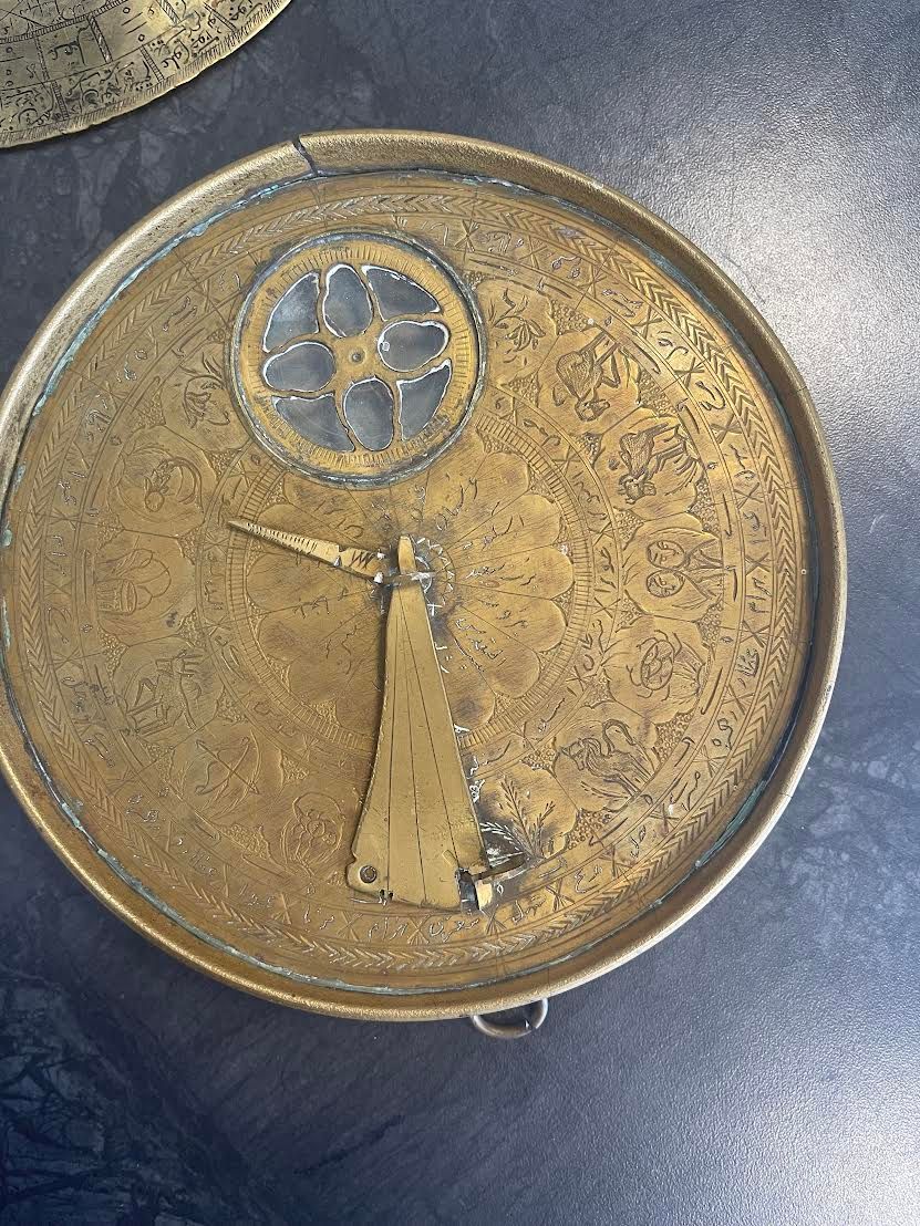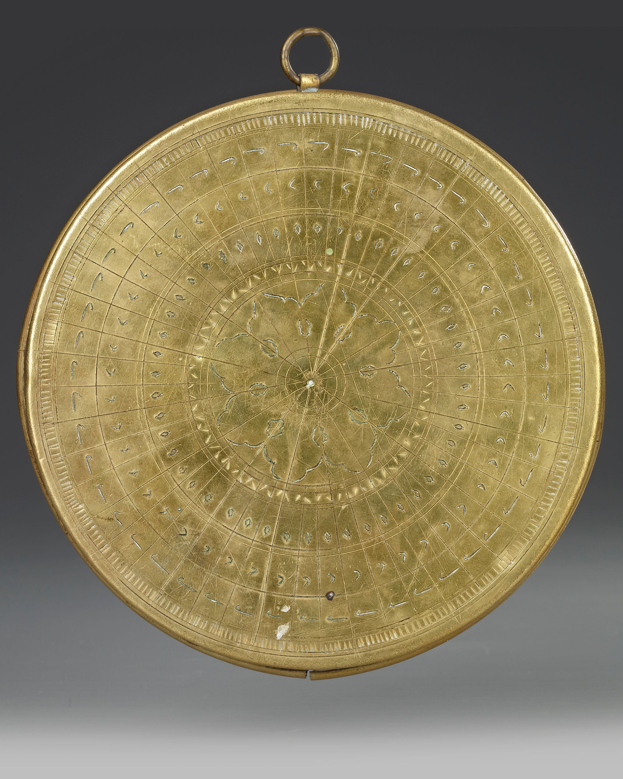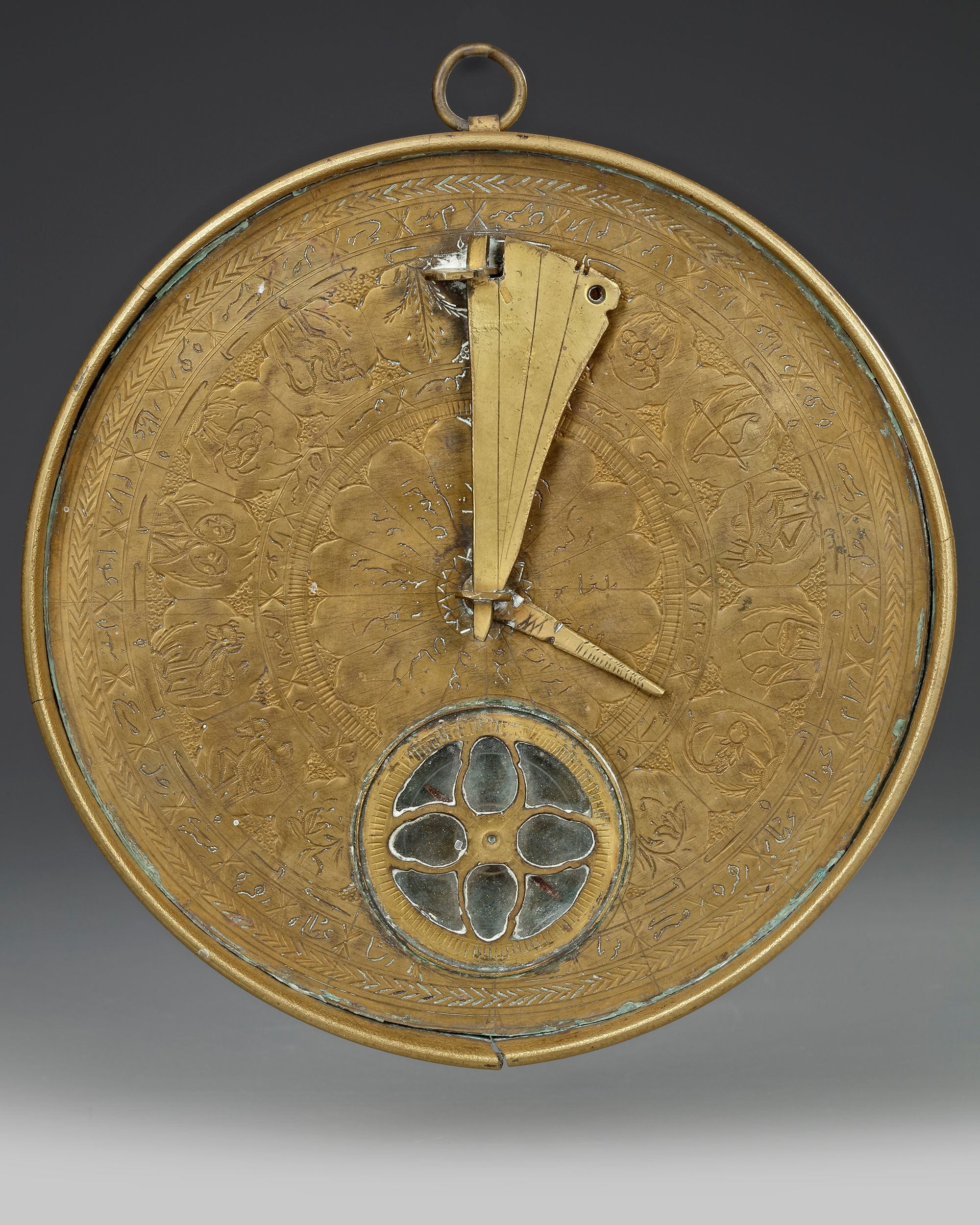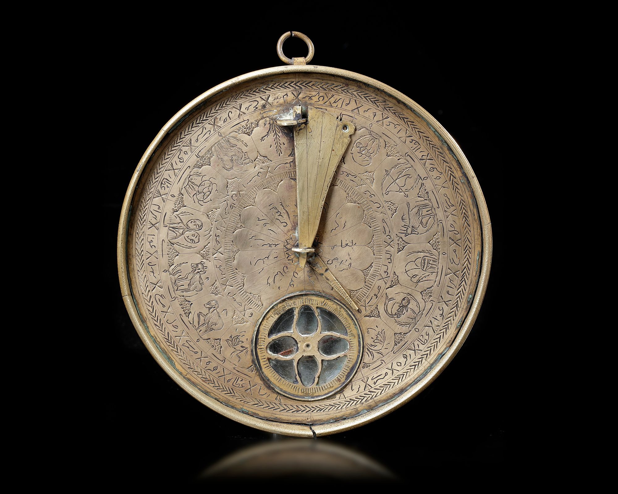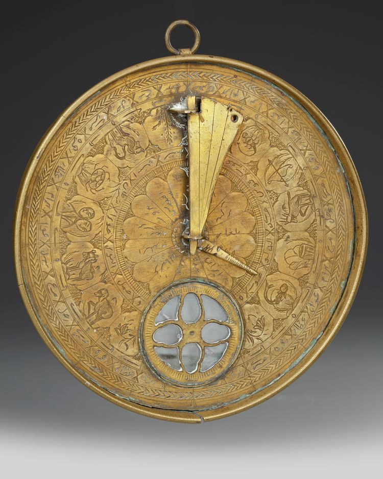 The lid opening, the face engraved with astrological signs.Folding engraved string with engraved tables on underside and face. To use the sundial one first needs to set the instrument on a flat surface and rotate it until the needle on the compass is correctly aligned in a north-south direction. When the metal pin is due north then the string is properly aligned towards the north-pole and the sundial will indicate the correct time – but only for the latitude for which it was constructed. 14.5 by 2.2 cm