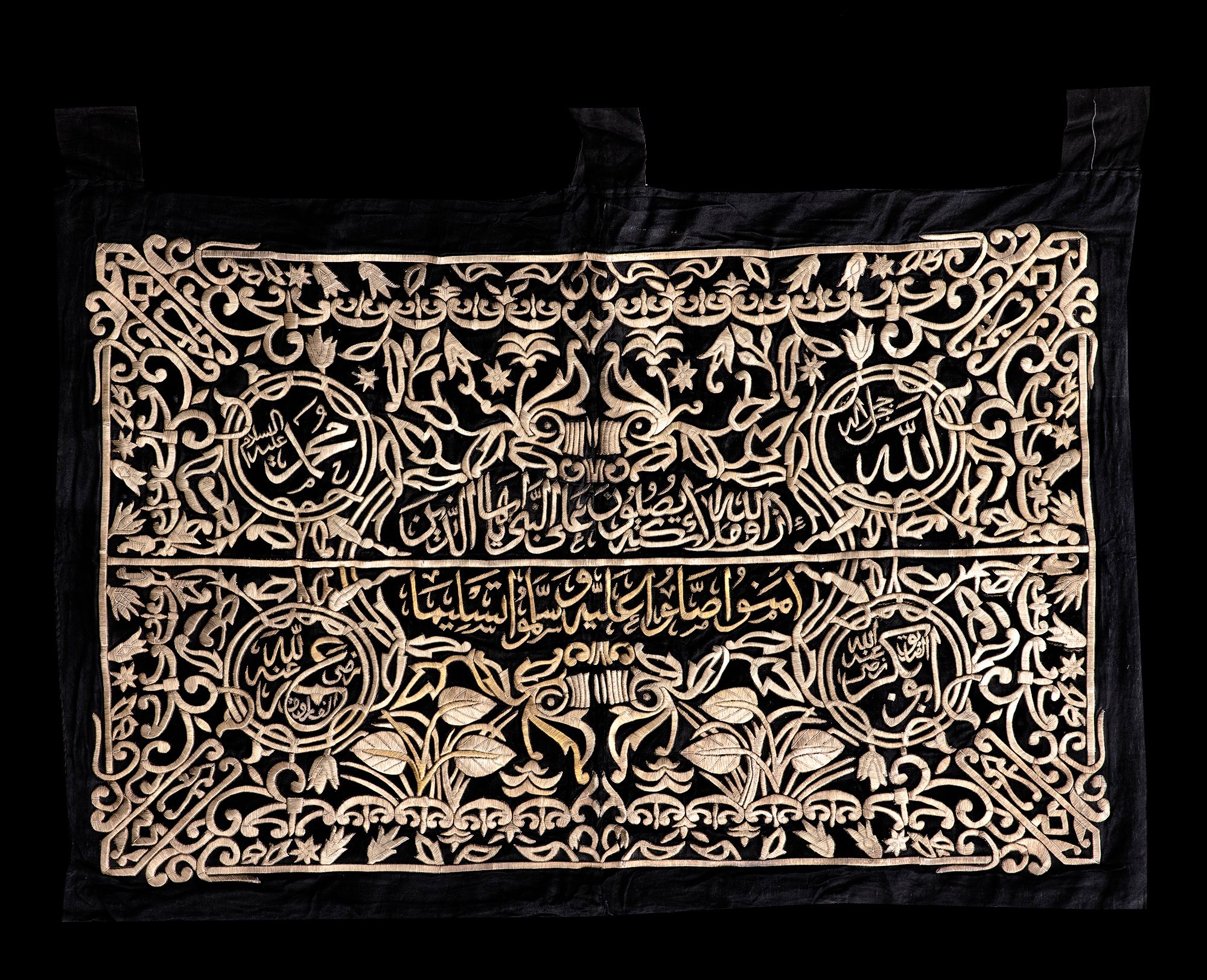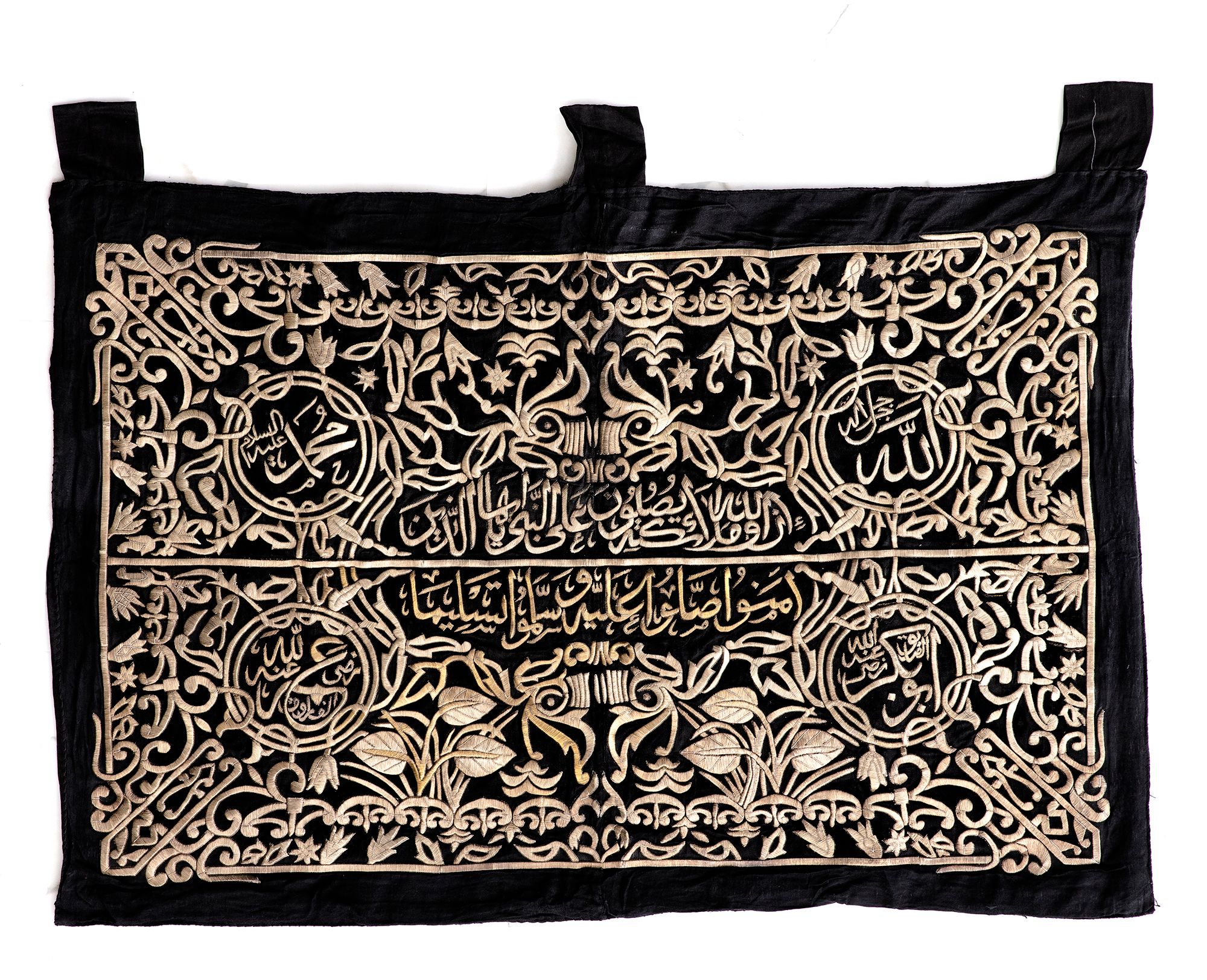 Rectangular form, heavily embroidered with gilt threads with a dense design of floral motifs and foliage. To the centre a roundel enclosing a Quran verse, surah al-Ahzaab v.56, flanked by four roundels enclosing the words "Allah, Muhammad, abu Bakr and Omar.