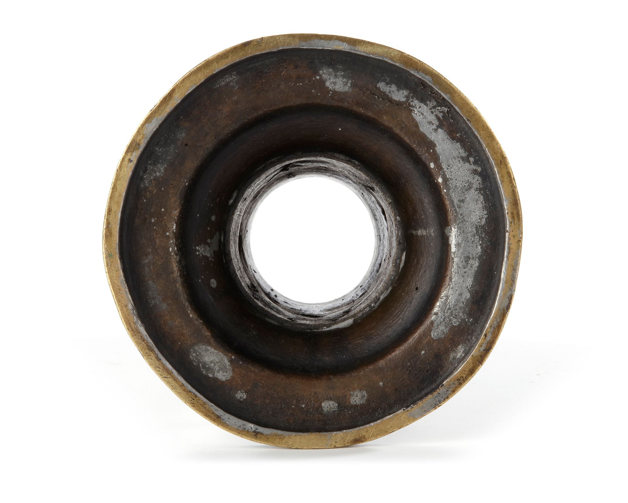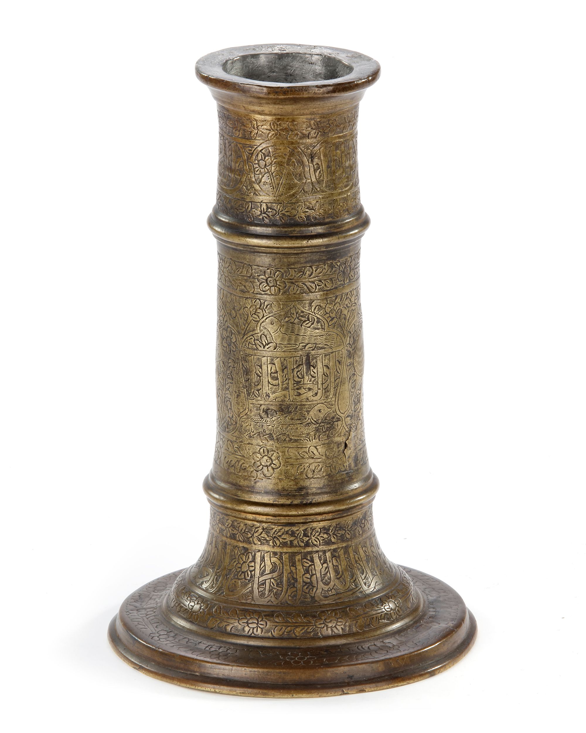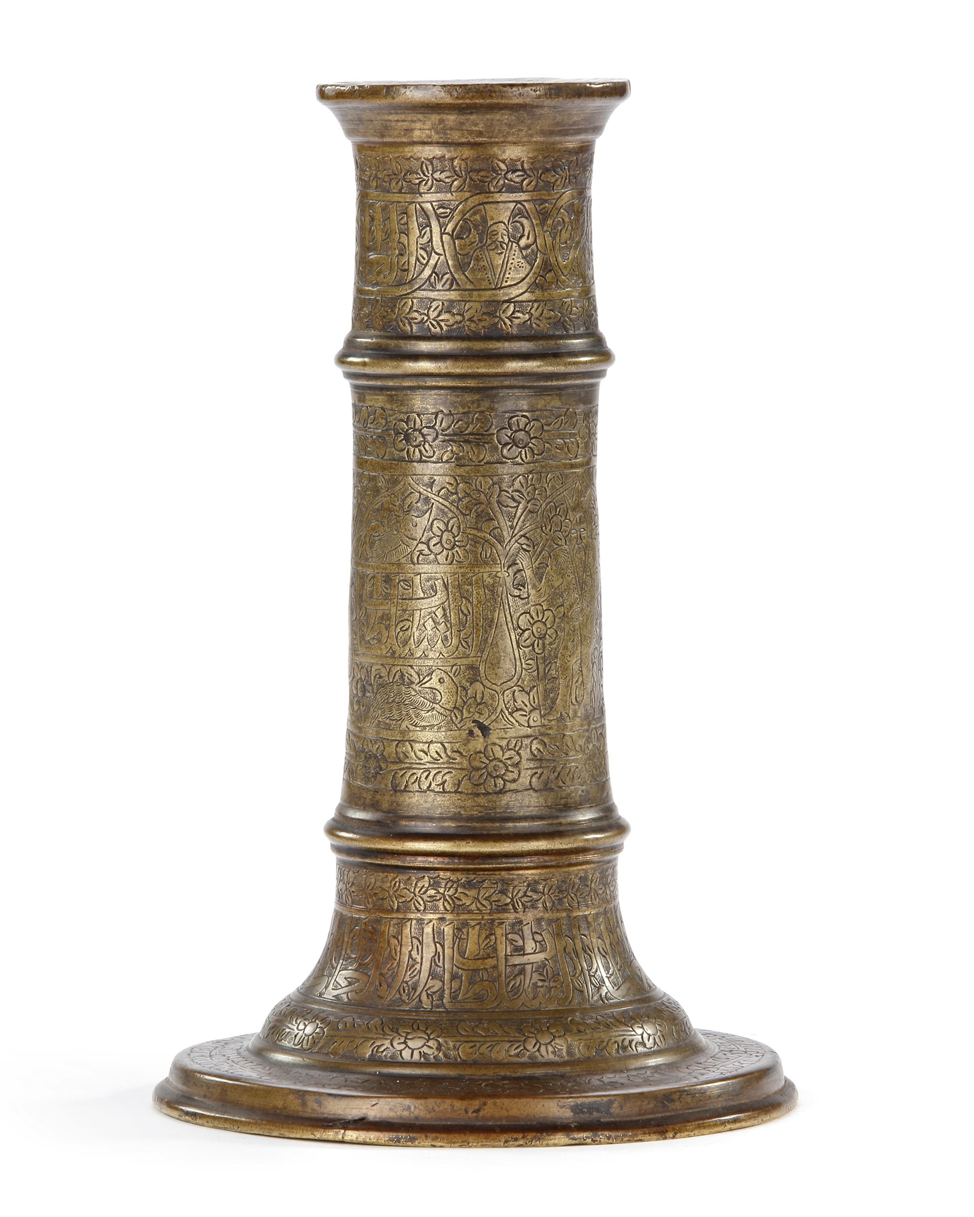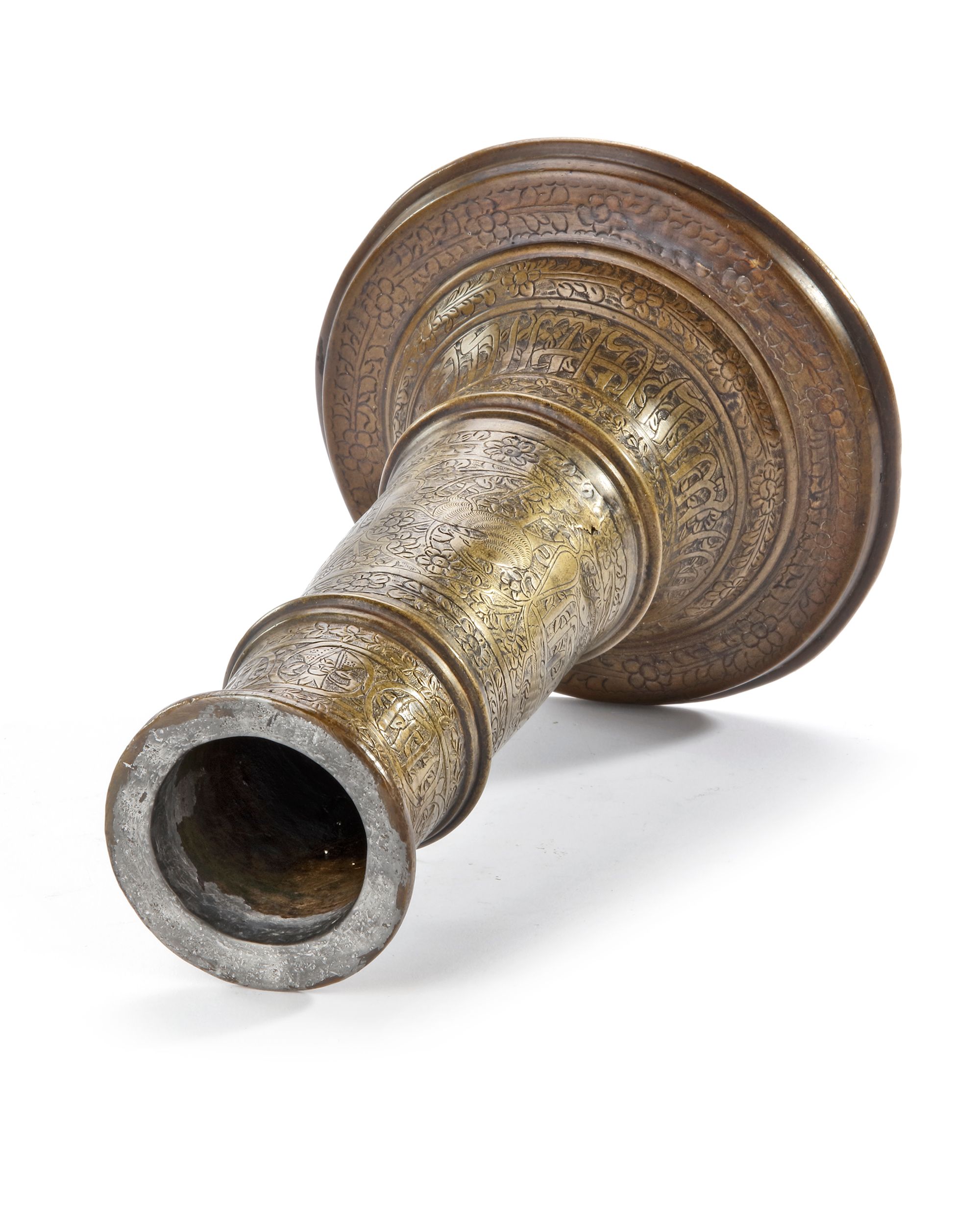 Of columnar form, with flaring foot and everted rim, the body marked with two rings, the main register with engraved decoration comprising of alternating cusped medallions enclosing a Timurid figure, animals with Arabic calligraphy between meandering vines. The upper register and base with inscription cartouches within cartouches surrounded by floral leafy sprays.
