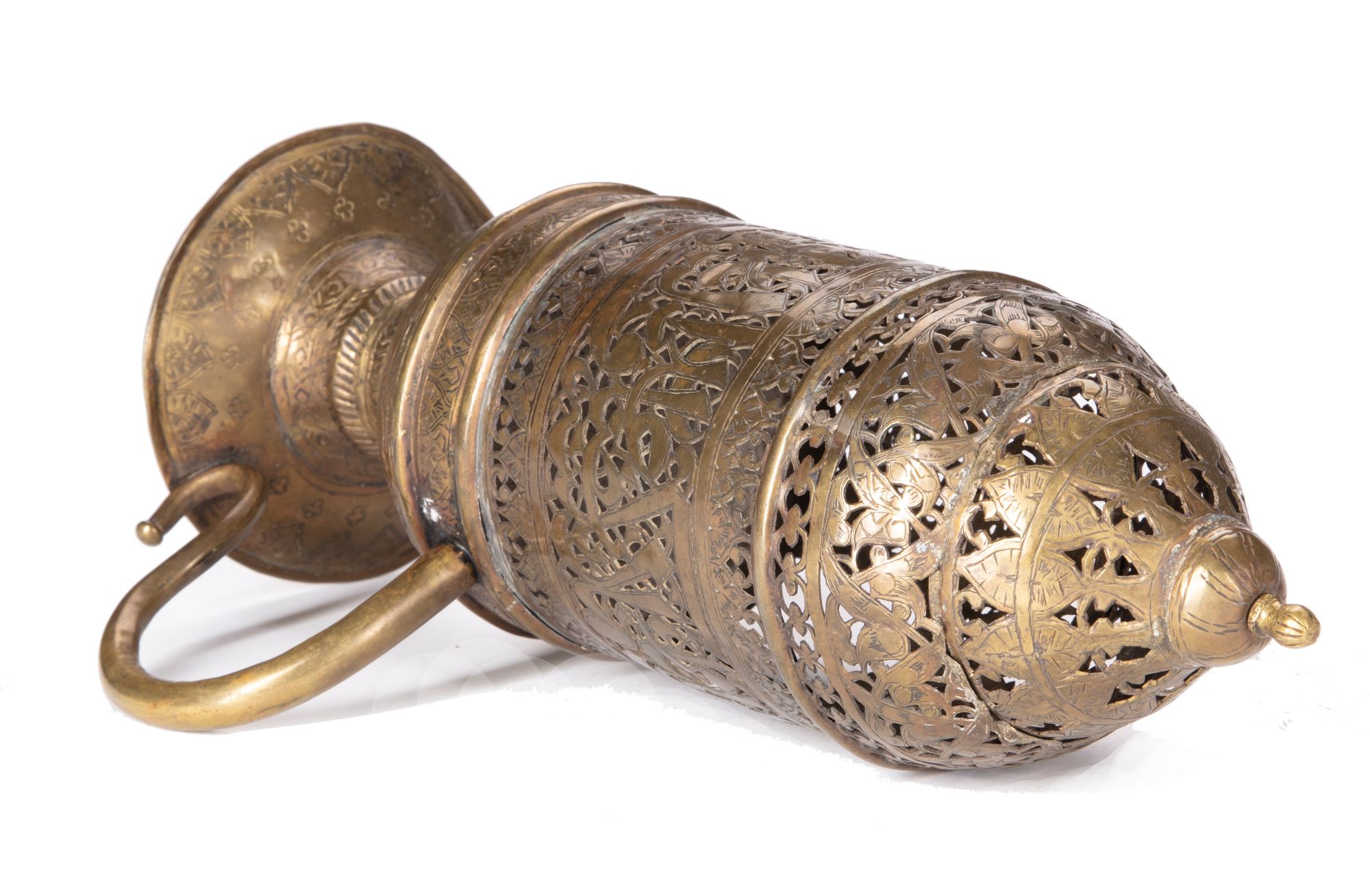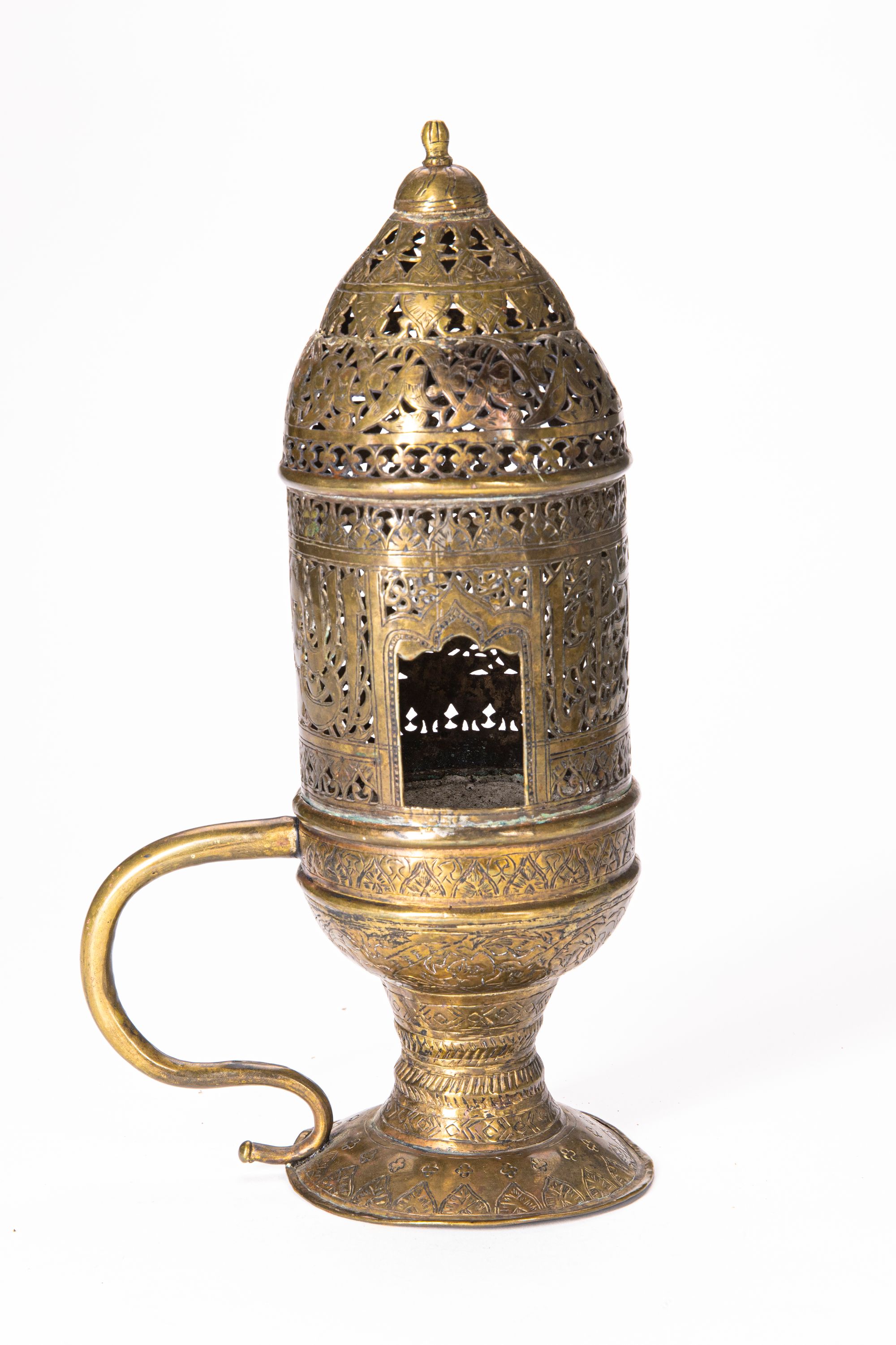 With hinged openwork lid and curved, faceted handle, the lid with a central register of trefoil palmettes, smaller trefoils and arabesques above and below. The central part elegantly pierced with Arabic inscriptions of v.55 from surah al-Ahzab with a leafy floral sprays. 32 by 18 cm