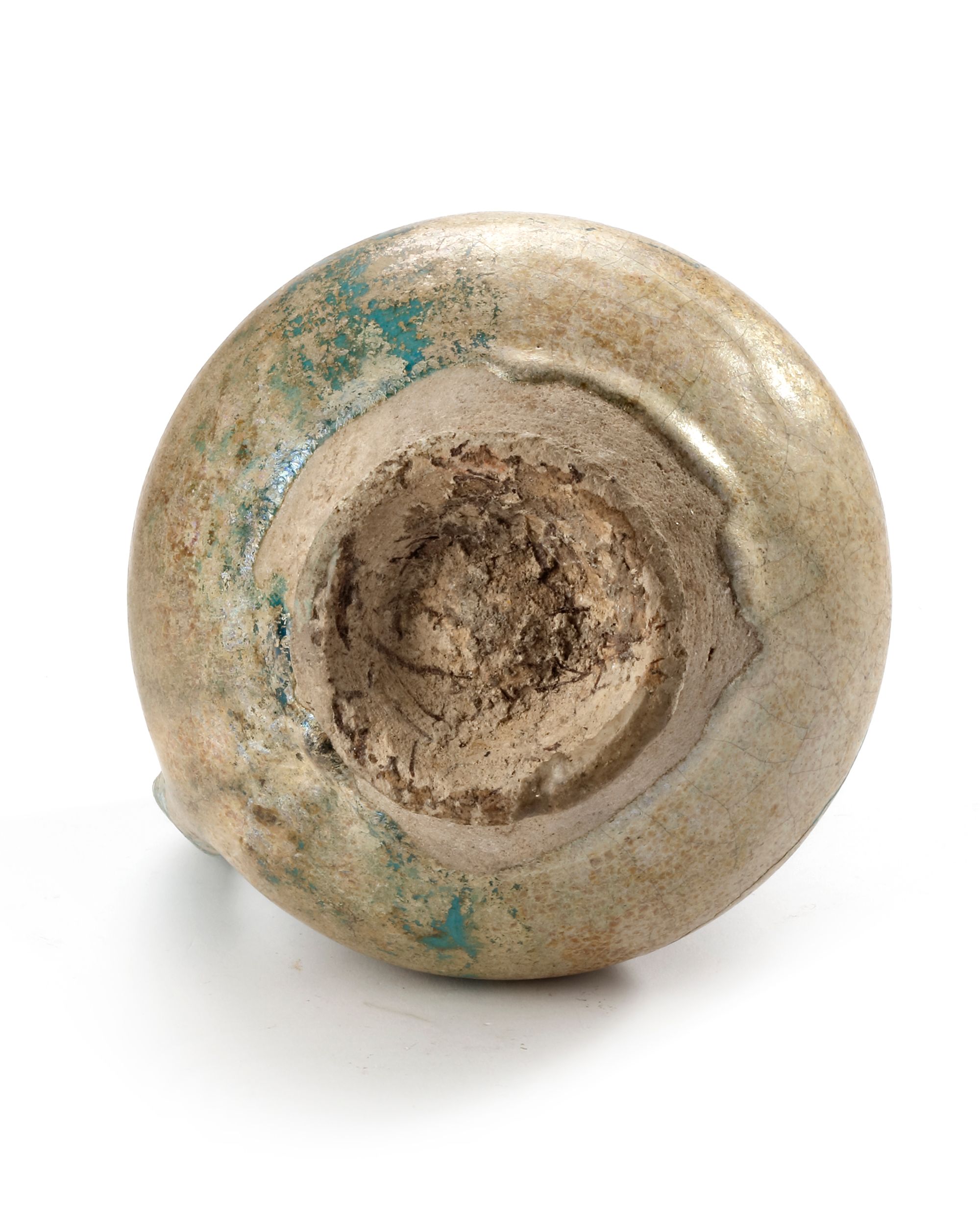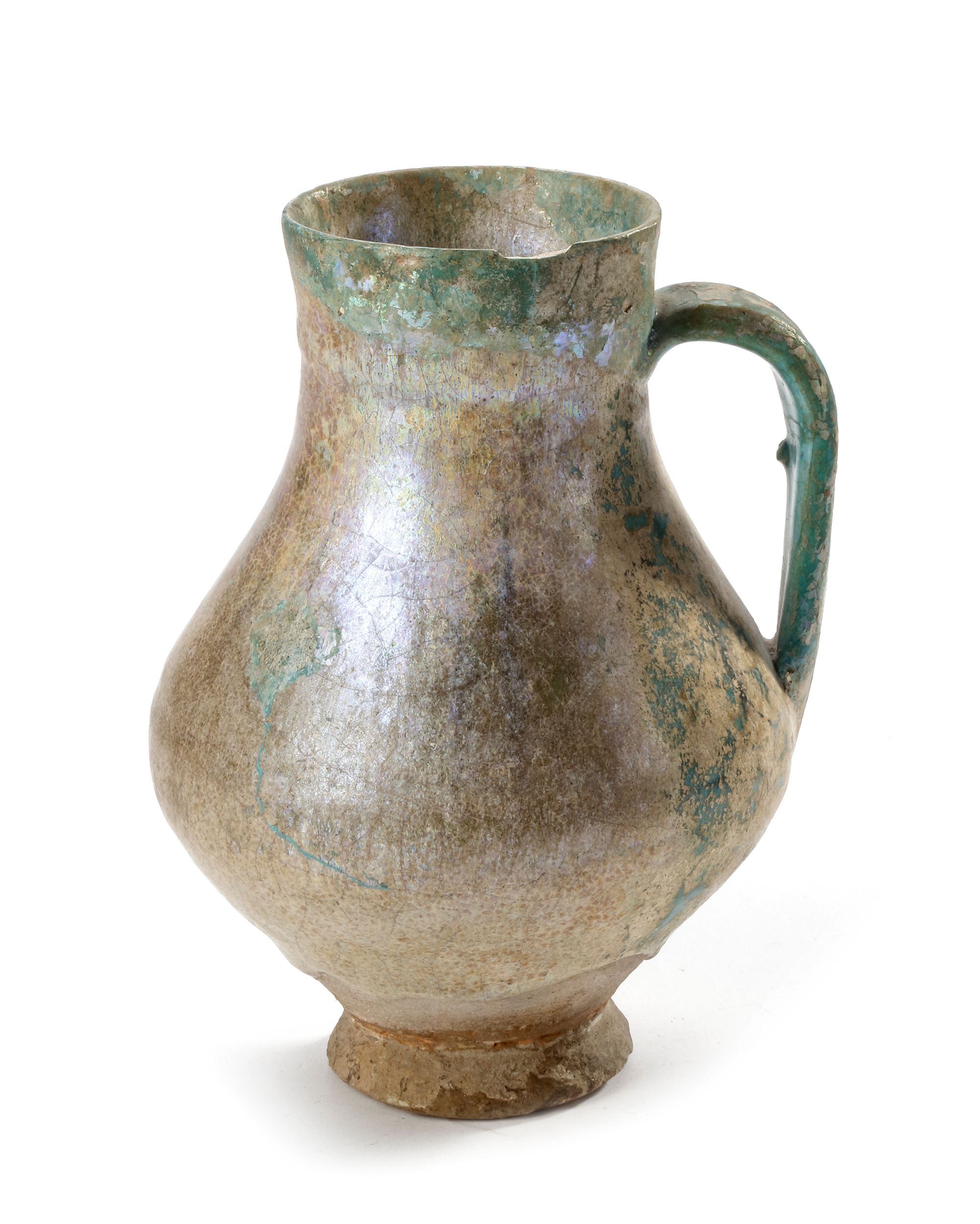 A Kashan jug resting on a small unglazed foot with a rounded body, that slightly narrows toward the mouth rim, with a straight loop handle, decorated in black and covered with a turquoise glaze stopping at the base exposing the buff ware.