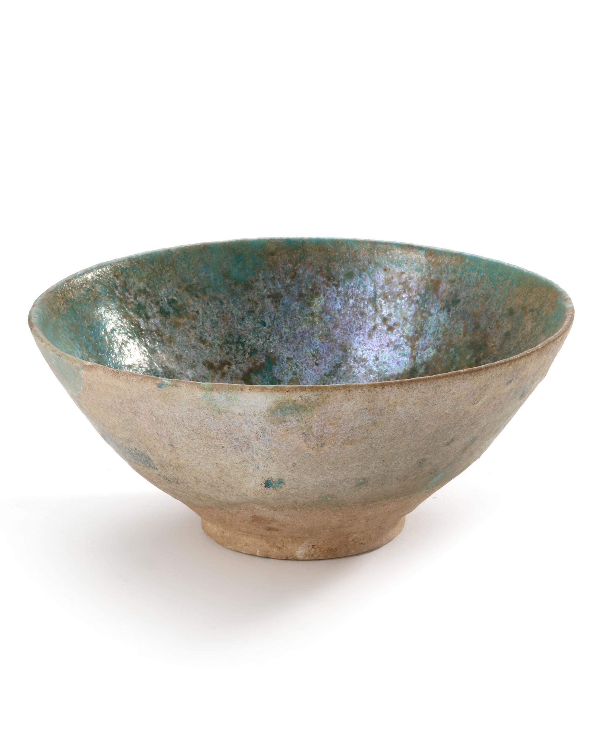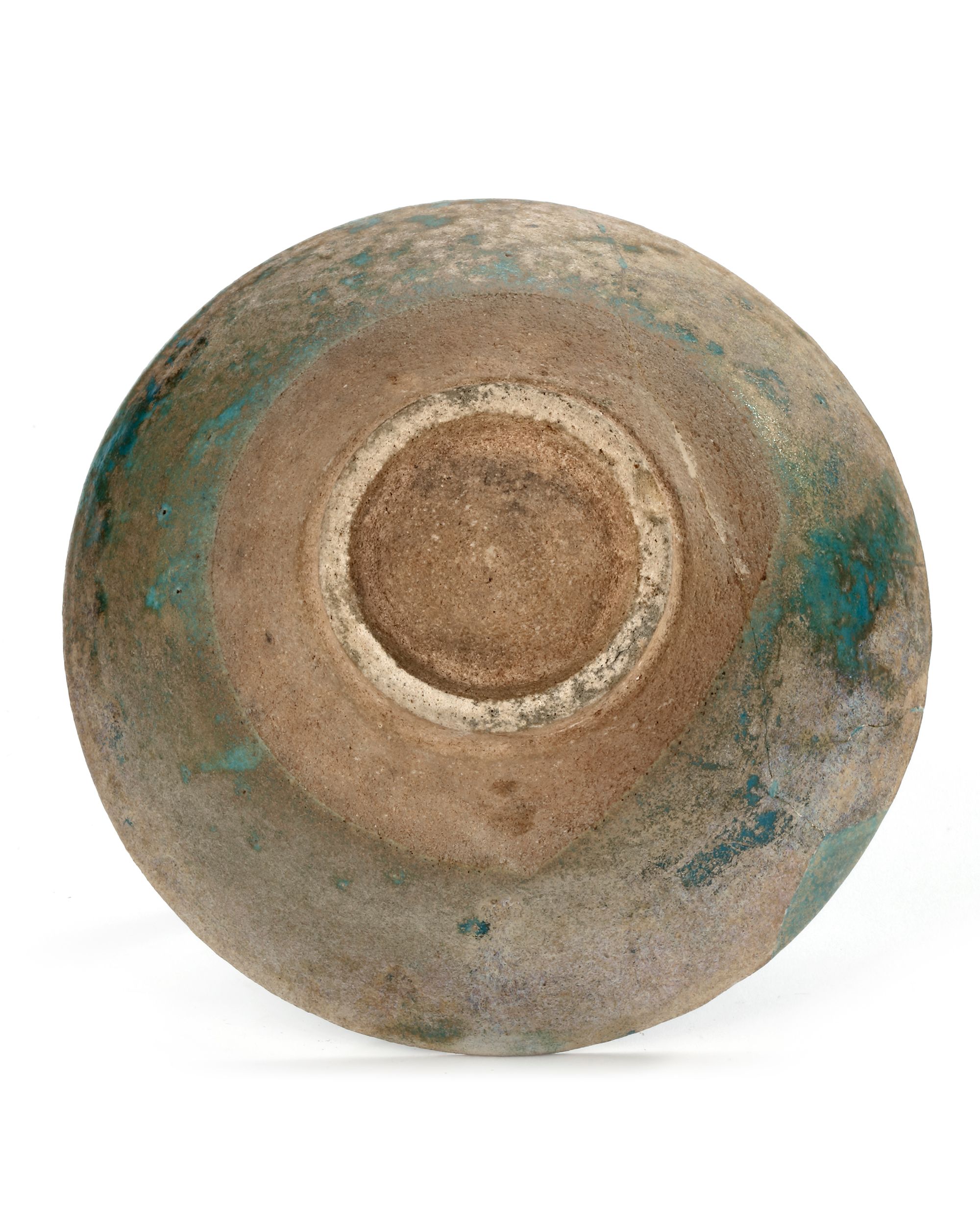 A Kashan pottery bowl resting on a small foot with straight sides and covered with a turquoise glaze stopping at the base exposing the buff ware.