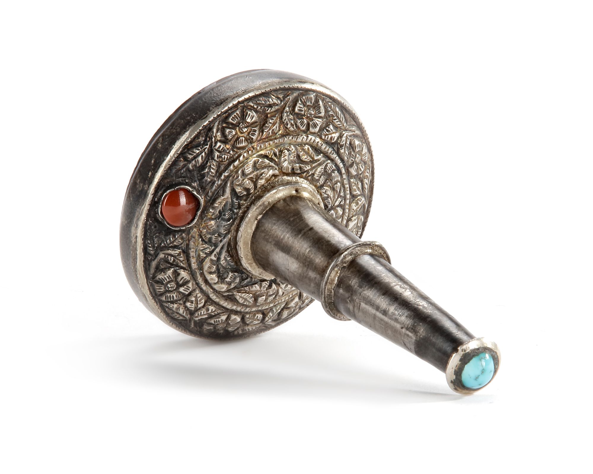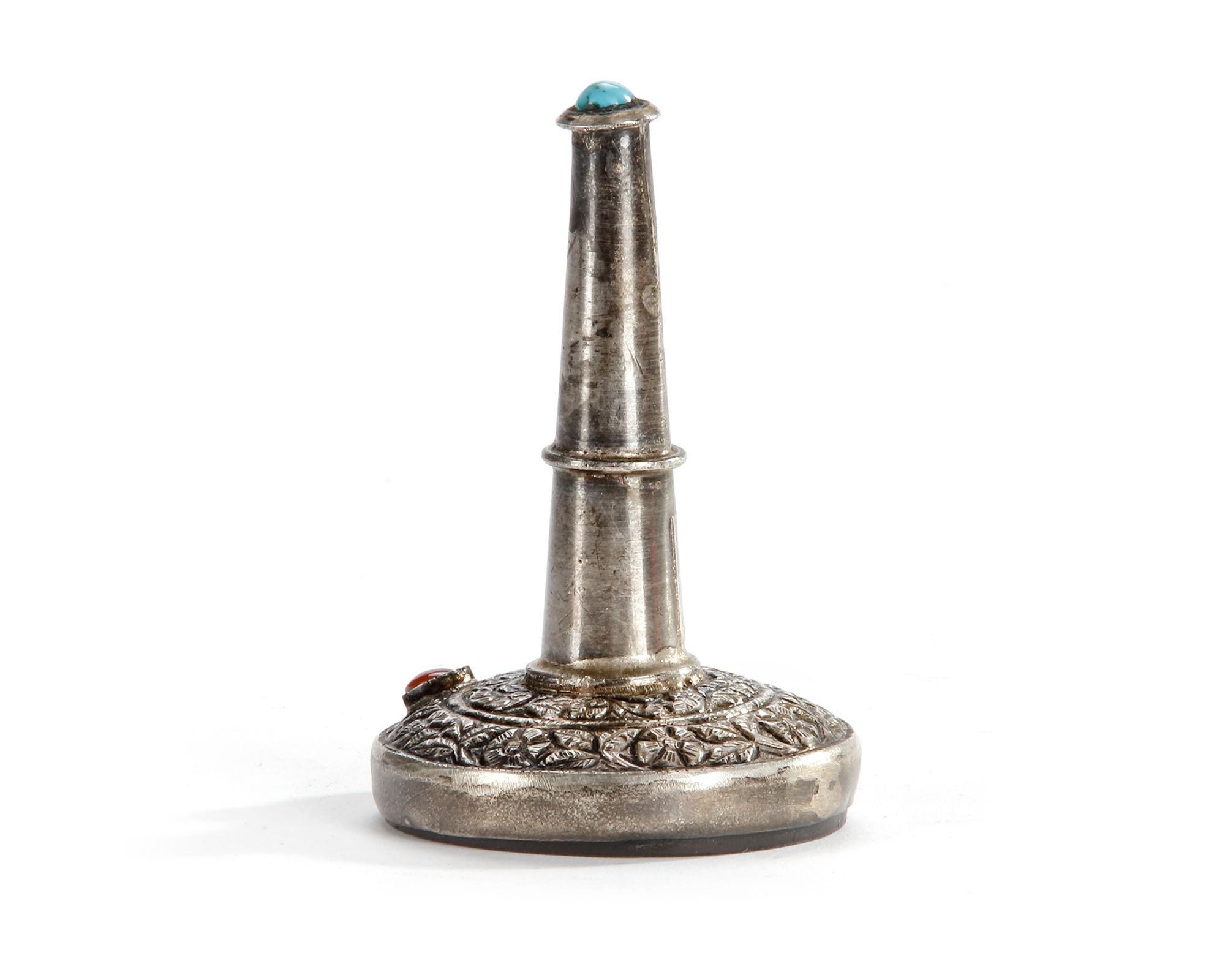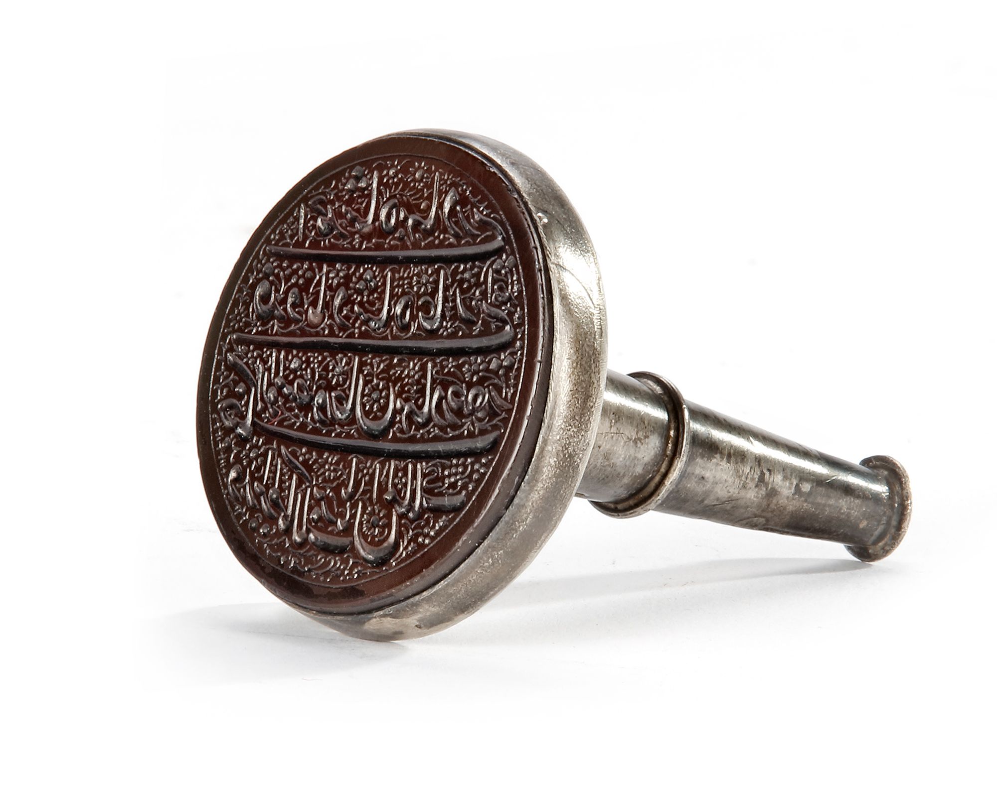 This large circular seal belonged to Safdar Jang (1708-1754), viceroy (nawwab) under the Great Mughal Ahmad Shah Bahadur (1748-1754), and is dated to the latter’s first year as ruler. Safdar Jang came from Nishapur, like his father-in-law, uncle, and predecessor, Saadat Khan Burhan al-Mulk, the first nawwab in the newly founded northern Indian state of Awadh. Safdar Jang succeeded Saadat Khan Burhan al-Mulk in 1739. Although Awadh was actually an independent state under its viceroys, they recognized the Mughal rulers as their formal sovereigns to the end. The elegant floral decoration is typical of 18th-century Indian ornamentation, as is the reversed Nastaliq inscription. The overall impression is highly reminiscent of that of contemporary coins. Diam: 8.6 cm. / D: 0.7 cm.