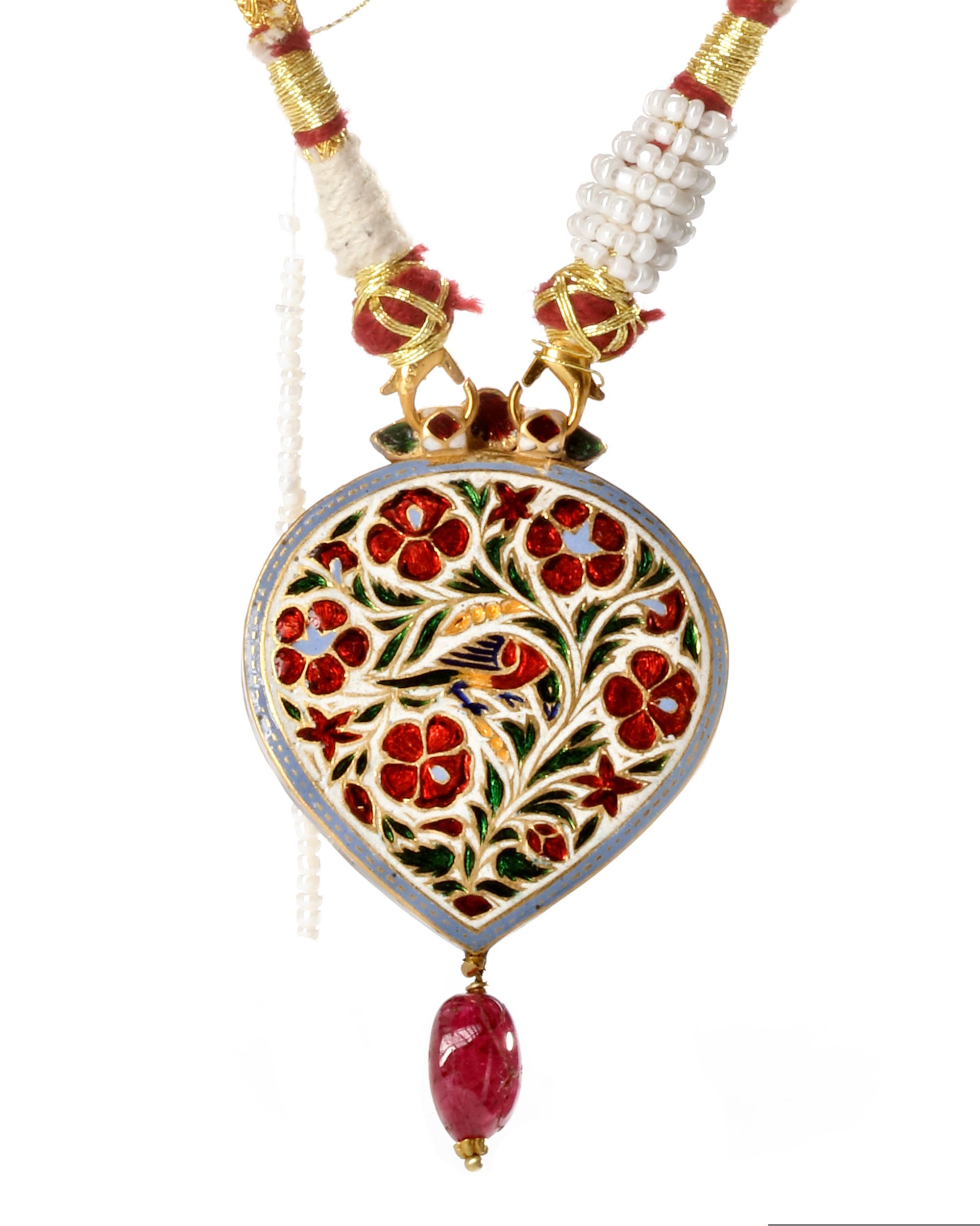 An eagle in the front studded with rubies, emerald and polki diamonds. Reverse beautifully enameled. 42.6 gr. Width 4 cm. Length 5 cm. (incl.6.5 cm.)