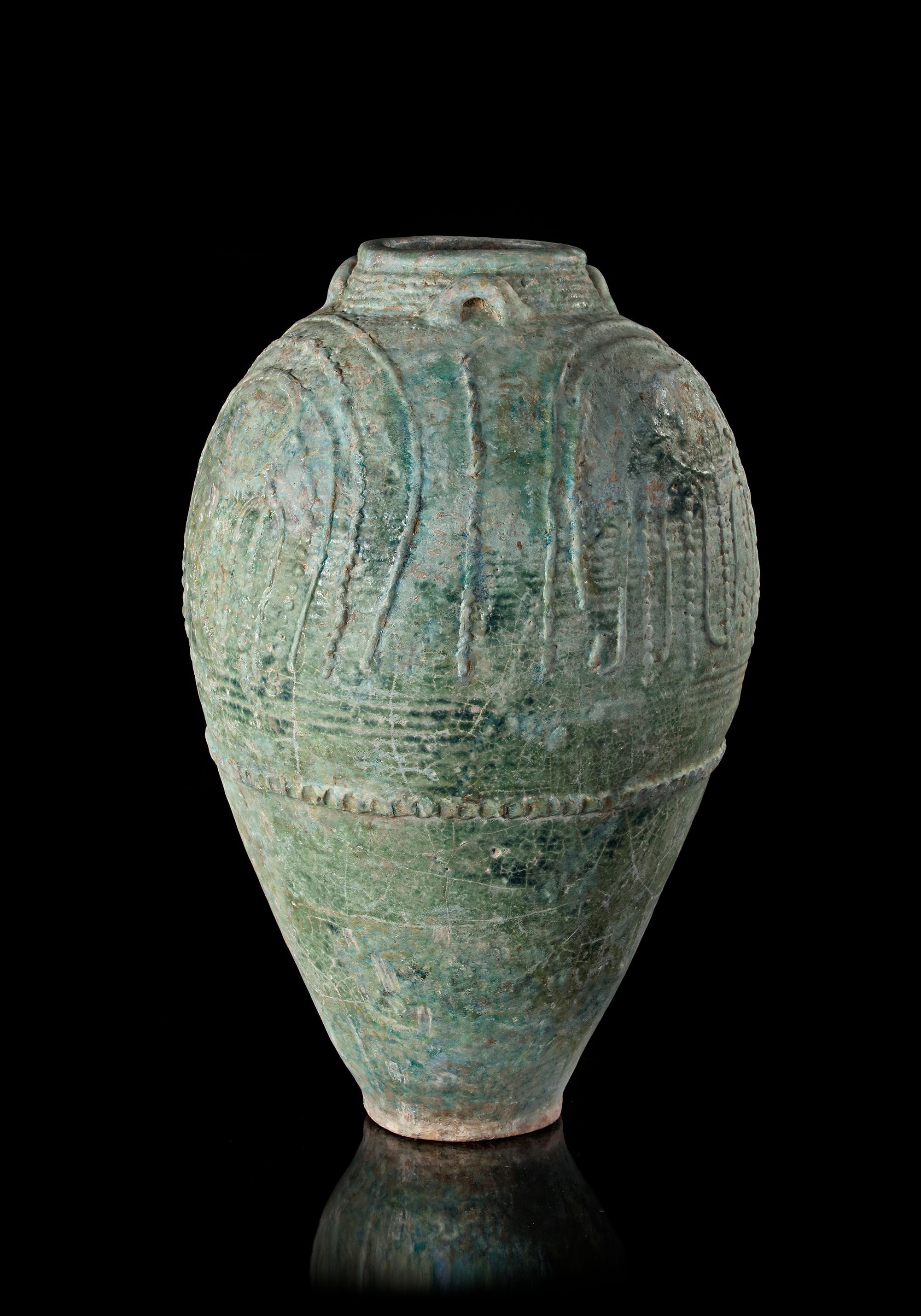 The egg-shaped jar, with three small handles, is covered entirely with a heavy dark-green glaze, which is common in Sassanid ceramic production. The decoration is based on a series of concentric circles in relief finished off in the middle with a motif of a stylised bunch of grapes, which is related to a widespread tradition of symbolic figures. Below the brim there is a geometric motif in relief made up of small rhombuses. The shape, decoration and technique used in the piece are evidence of the stylistic continuity between the late Sassanid and the early Islamic periods. The jar was probably intended to store foodstuffs. Through stylistic analysis. The shape and decoration of the jar, the technique used and the dark green glaze are all typical of Sassanid ceramics.