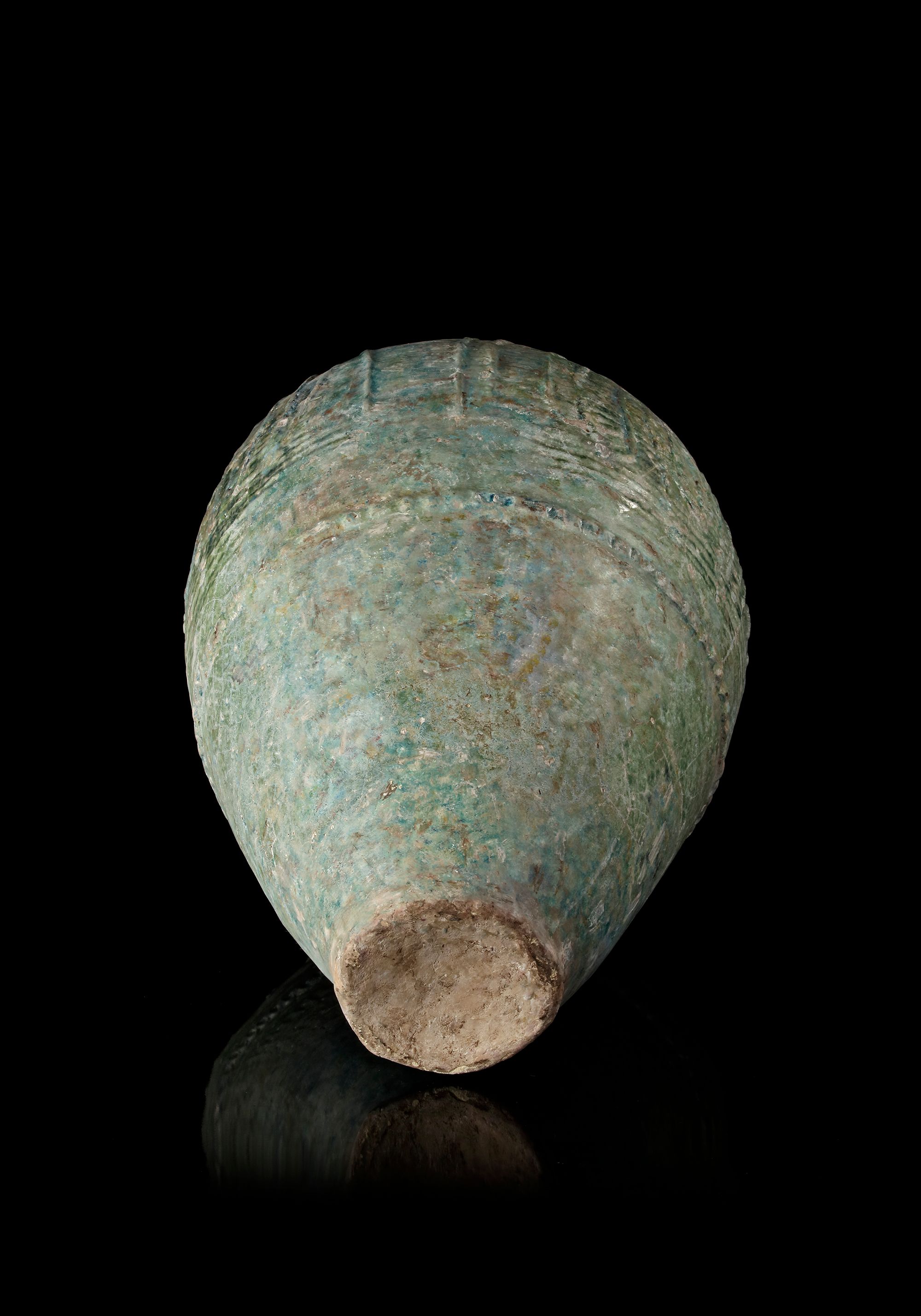 This type of alkaline-glazed pottery, intended for storage of food stuffs or drinking water, had been produced in kilns along the Upper Euphrates since at least the Parthian period continuing through the Umayyad and early Abbasid periods, with subtle changes in shape and design. The distinctive silvery iridescence offset by the turquoise glaze only adds to their decorative appeal. Their story is also fascinating, for examples have been found as far afield as Fujian province in China. A tomb at Lotus Peak on the outskirts of Fuzhou, dedicated to one Liu Hua, who died in A.D. 930, wife of King Wang Yangjun of the Min Kingdom (A.D. 909-945), yielded three similar turquoise-glazed jars, testament to the trading activities of Persian and Arab merchants along the southern coast of China at this time.