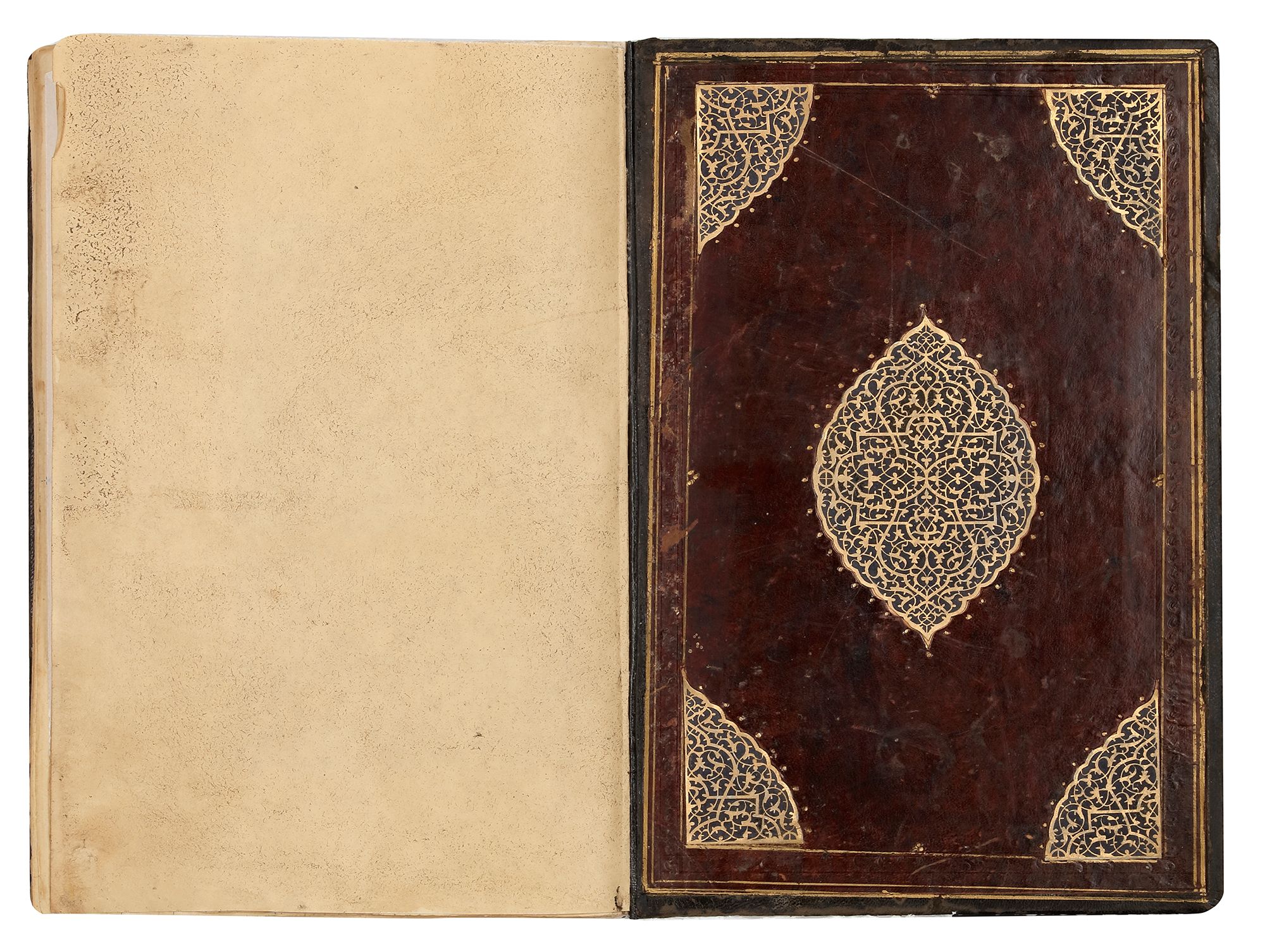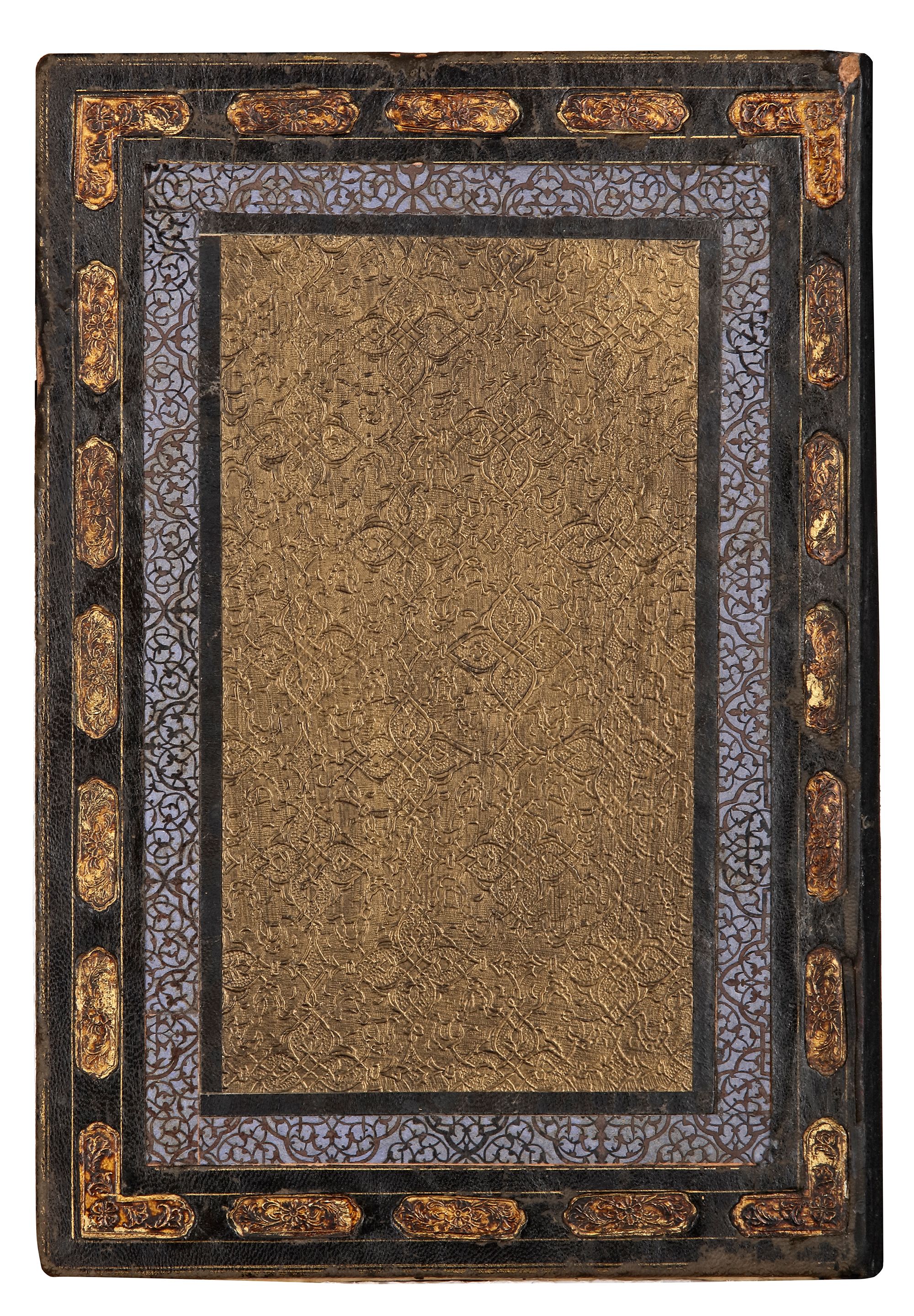 In gilt stamped morocco binding, gilt stamped and painted doublures, with central panel enclosing flower heads and surrounded by spandrels containing scrolling floral.