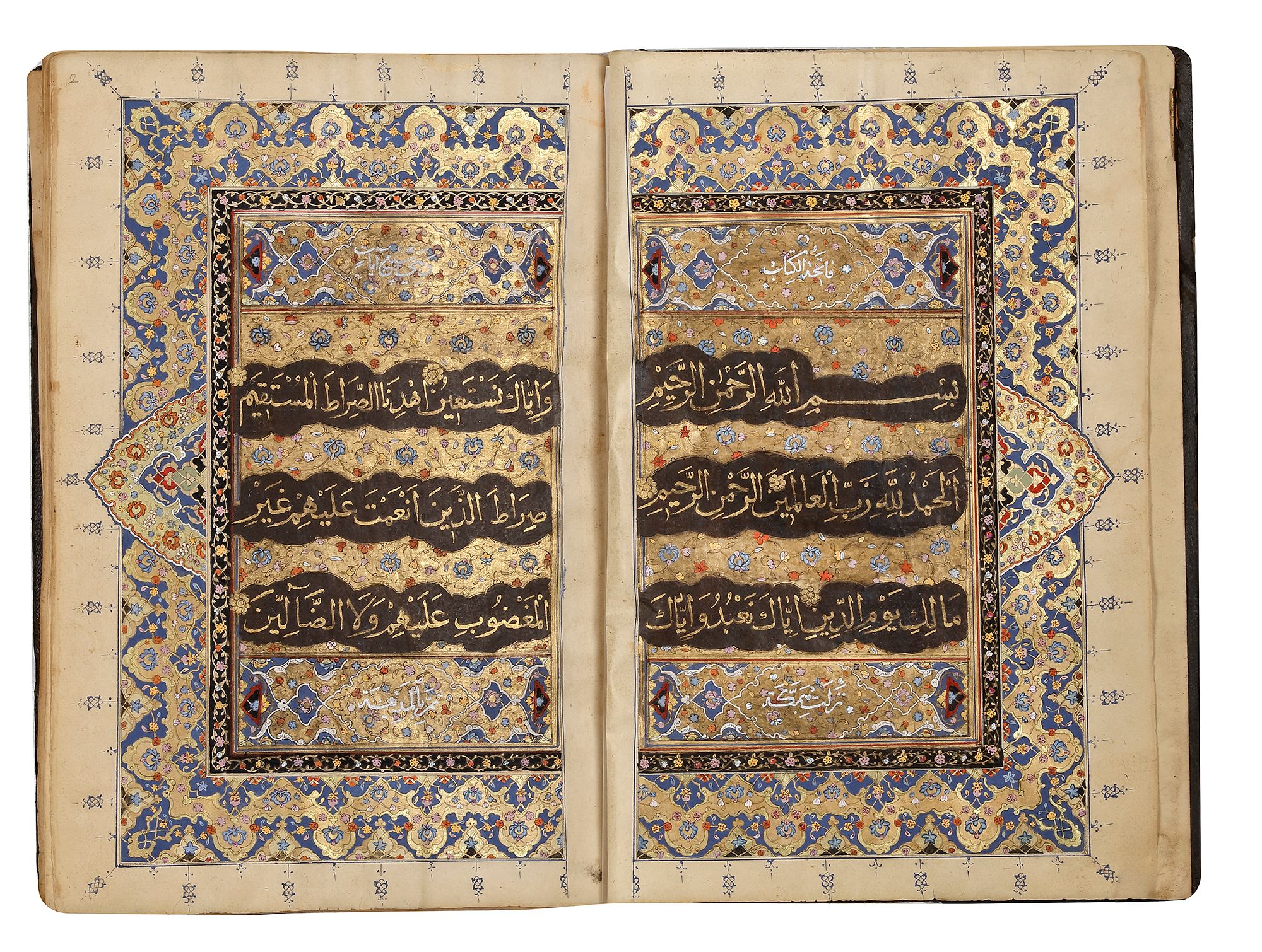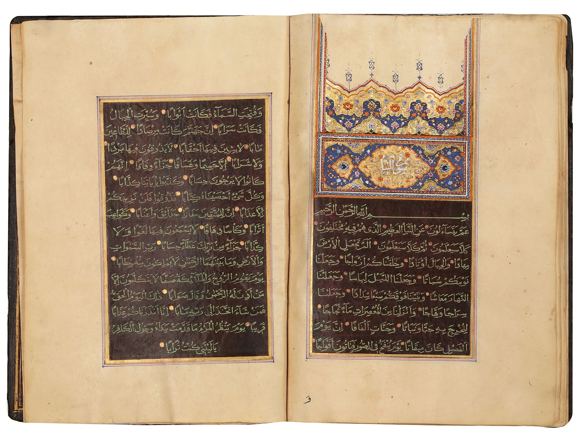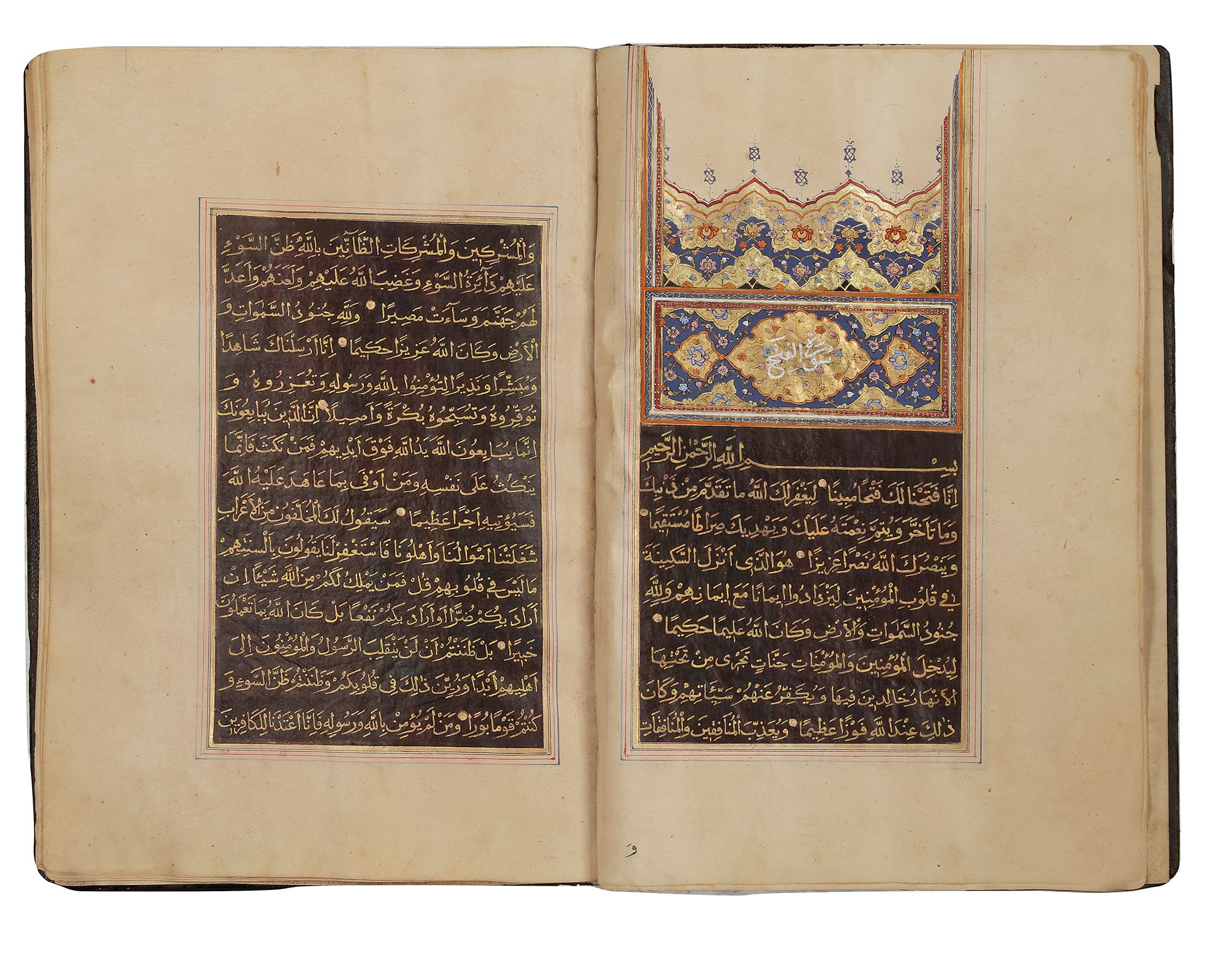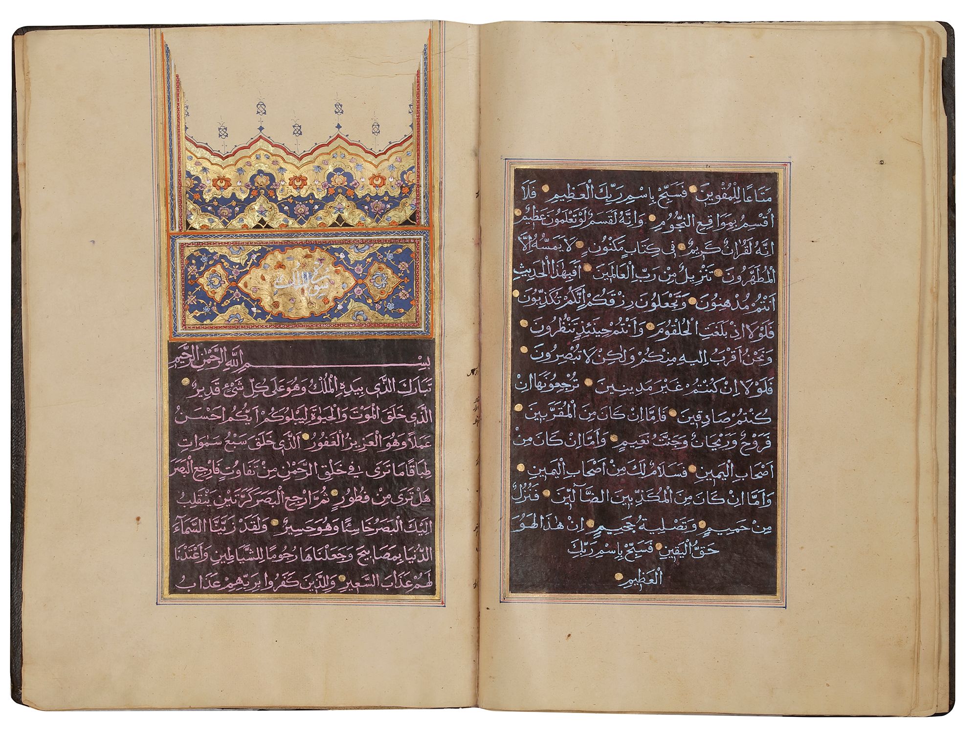 Arabic manuscript on paper, 12 ff. with 2 fly-leaves, each folio with 15 lines of elegant polychrome naskh scripts on a black decorated ground, gold roundel verse markers, text within gold and polychrome rules, surah headings in white thuluth script on cartouches with gold and polychrome floral illumination. Opening two bifolia fully illuminated in gold and polychrome decoration, enclosing three lines in large gilt thuluth script reserved in clouds on a gilt ground decorated with polychrome floral motifs.