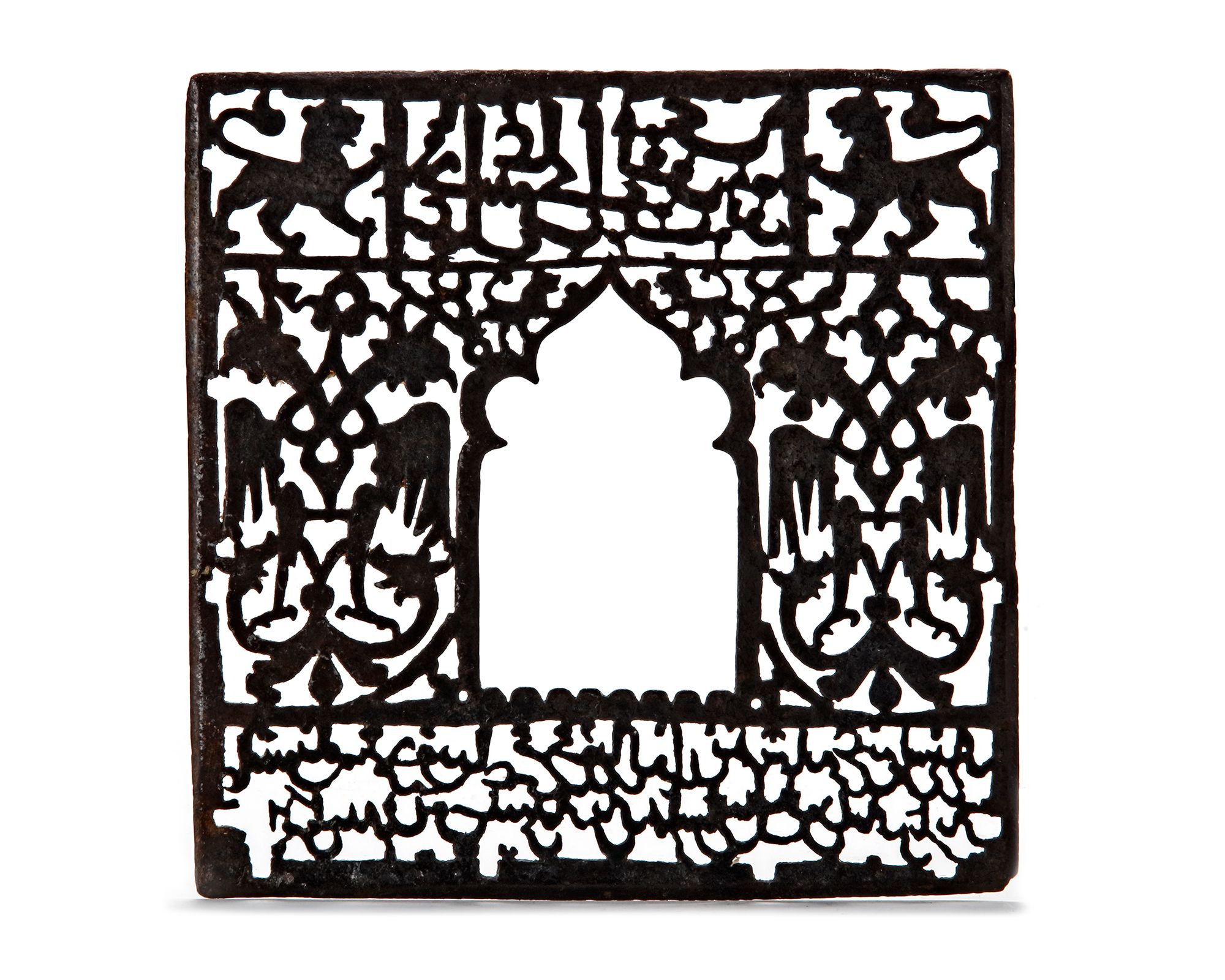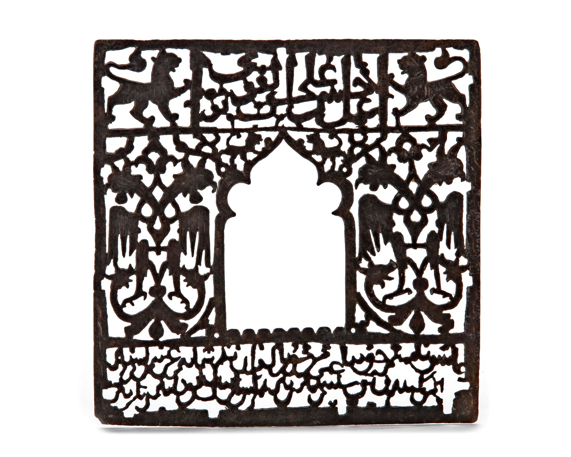 A grave panel pierced at the top with Arabic calligraphy flanked by two lions, the central register with a mihrab shaped panel flanked by Seljuk double headed eagle, the lower register with Arabic calligraphy.