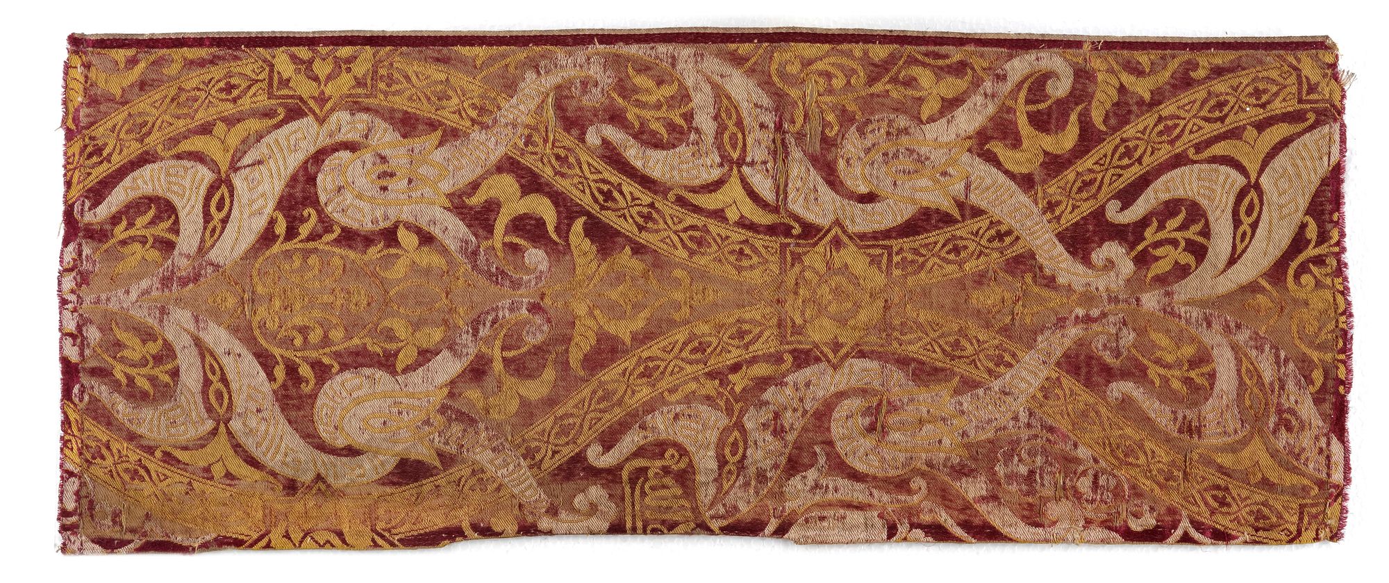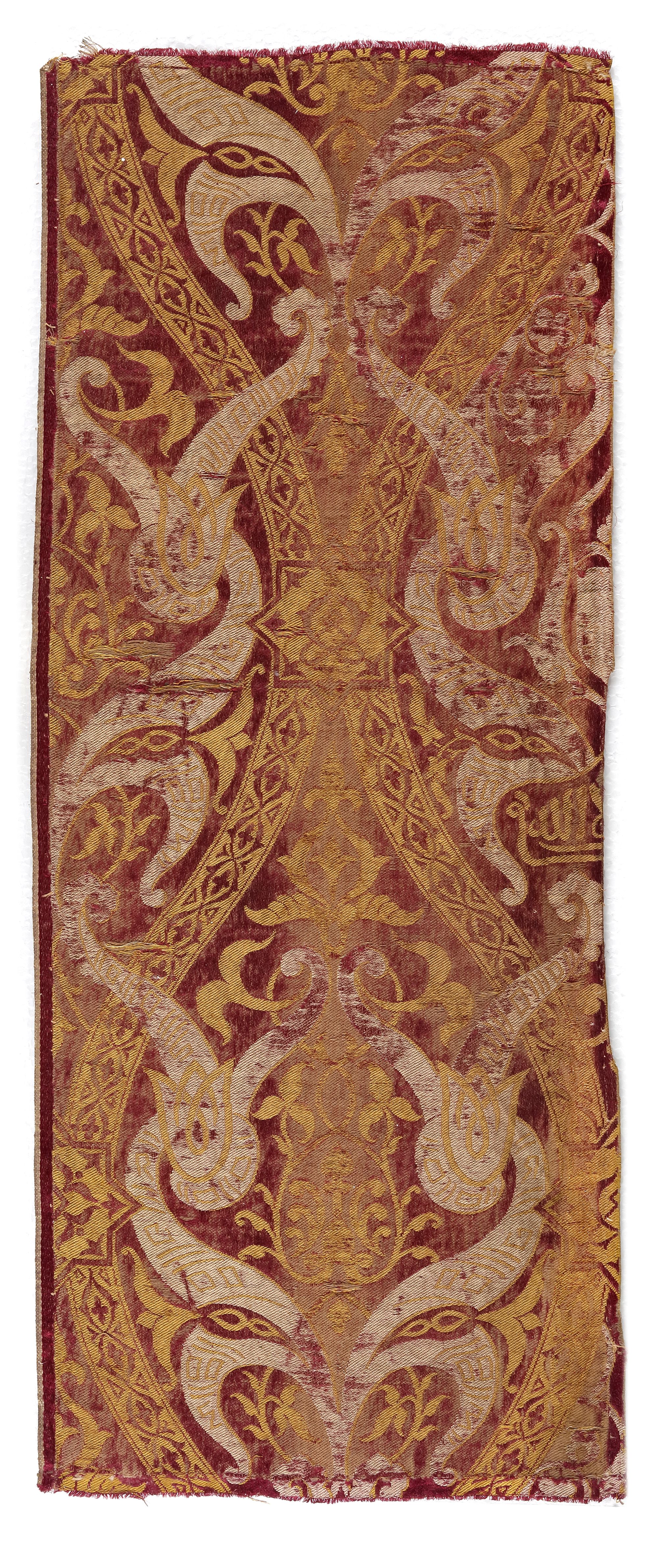 Of rectangular form, woven in red, yellow and white silk with floral leafy sprays and lotus flower heads decorated with Arabic calligraphy, between ogival lattice with an eight-shaped star.