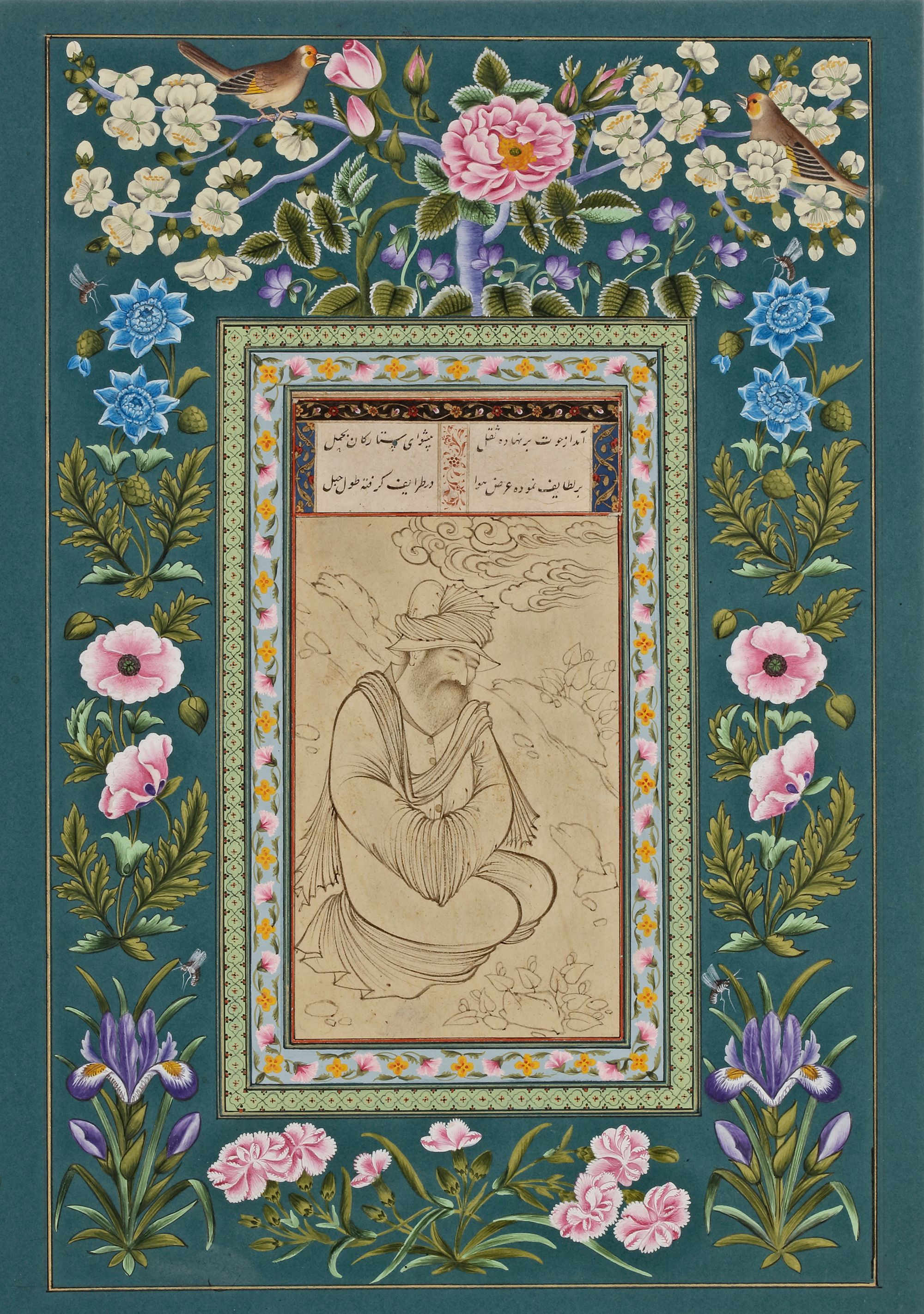 Tinted pencil heightened with gold on paper, a kneeling sage wearing a long robe and scarf tied around his cap, two lines of nasta'liq above, laid down within floral decorated border, the later added margins heavily decorated with two birds perched amongst flower heads and foliage.